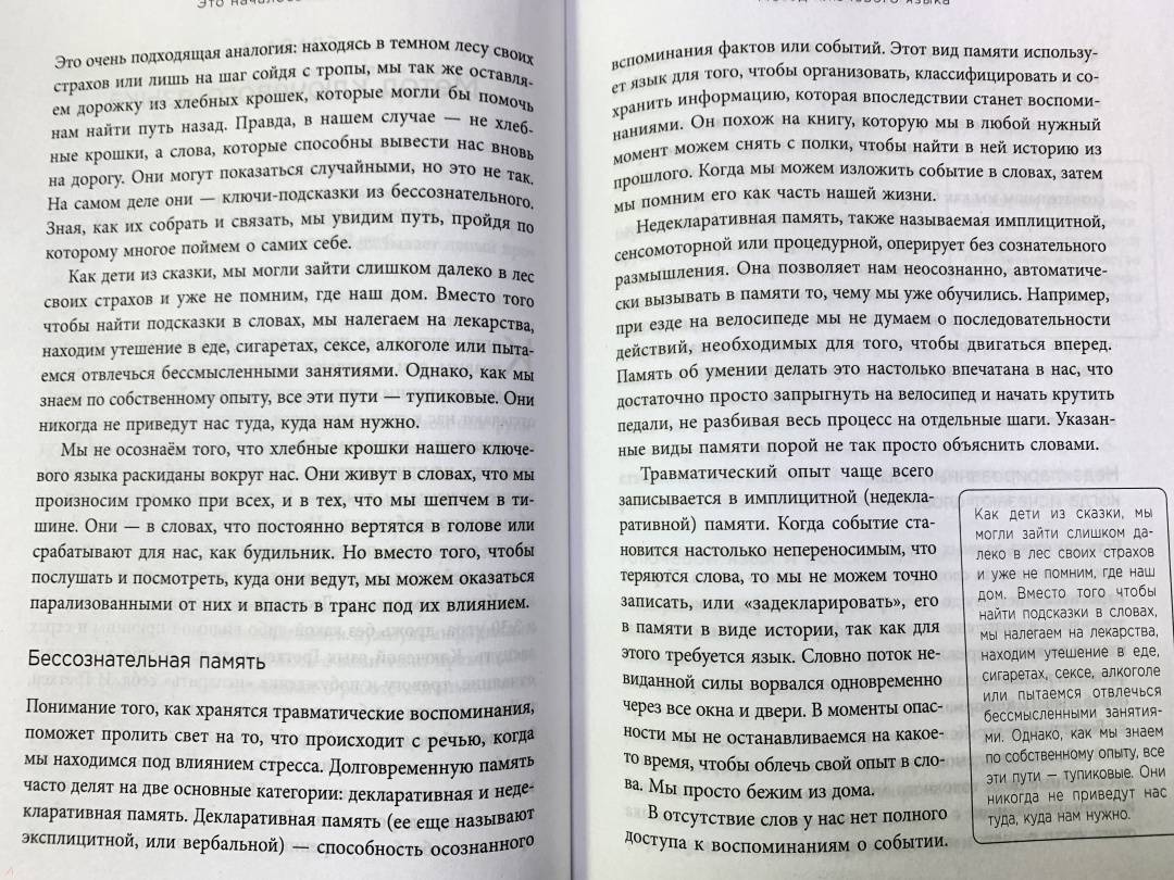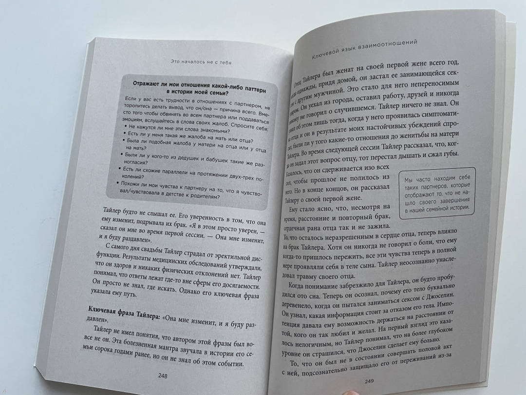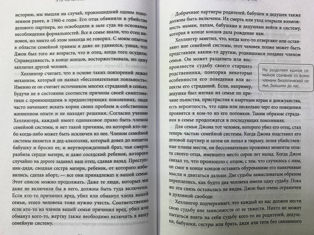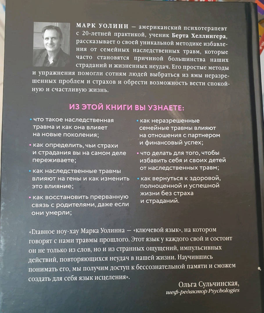 ОписаниеПодарочное оформление!В России продано более 100 000 экземпляров! Главная книга по темам наследственной травмы и родовым сценариям. Более 16 000 восторженных отзывов! Переведена на 20 языков! Депрессия, тревога, страхи, хронические боли, навязчивые мысли, которые отравляют нам жизнь... Помните ли, когда впервые столкнулись с ними? Возможно, что-то подобное переживали наши родители или дальние родственники? Каждый ребенок подсознательно несет отпечаток привычек и установок своих родных. Фрагменты их жизненного опыта, воспоминания, ощущения, переживания продолжают жить в нас, требуя своих решений. Ведущий специалист по работе с психологической травмой Марк Уолинн предлагает техники, которые помогут соединить в целое отдельные эмоции и события прошлого, тревожащие нас сегодня. Изучите сценарии, которые передаются в семье из поколения в поколение, и начните новую осознанную и счастливую жизнь. Из этой книги вы узнаете: - что такое наследственная травма и как она влияет на новые поколения; - как определить, чьи страхи и страдания вы на самом деле переживаете; - как наследственные травмы влияют на гены и как изменить это влияние; - как неразрешенные семейные травмы влияют на отношения с партнером и финансовый успех; - как восстановить прерванную связь с родителями, даже если они умерли; - что делать для того, чтобы избавить себя и своих детей от наследственных травм; - как вернуться к здоровой, полноценной и успешной жизни без страха и страданий.СвернутьПодарочное оформление!В России продано более 100 000 экземпляров! Главная книга по темам наследственной травмы и родовым сценариям. Более 16 000 восторженных отзывов! Переведена на 20 языков! Депрессия, тревога, страхи, хронические боли, навязчивые мысли, которые отравляют нам жизнь... Помните ли, когда впервые столкнулись с ними? Возможно, что-то подобное переживали наши родители или дальние родственники? Каждый ребенок подсознательно несет отпечаток привычек и установок своих родных. Фрагменты их жизненного опыта, воспоминания, ощущения, переживания продолжают жить в нас, требуя своих решений. Ведущий специалист по работе с психологической травмой Марк Уолинн предлагает техники, которые помогут соединить в целое отдельные эмоции и события прошлого, тревожащие нас сегодня. Изучите сценарии, которые передаются в семье из поколения в поколение, и начните новую осознанную и счастливую жизнь. Из этой книги вы узнаете: - что такое наследственная травма и как она влияет на новые поколения; - как определить, чьи страхи и страдания вы на самом деле переживаете; - как наследственные травмы влияют на гены и как изменить это влияние; - как неразрешенные семейные травмы влияют на отношения с партнером и финансовый успех; - как восстановить прерванную связь с родителями, даже если они умерли; - что делать для того, чтобы избавить себя и своих детей от наследственных травм; - как вернуться к здоровой, полноценной и успешной жизни без страха и страданий.СвернутьСвернуть