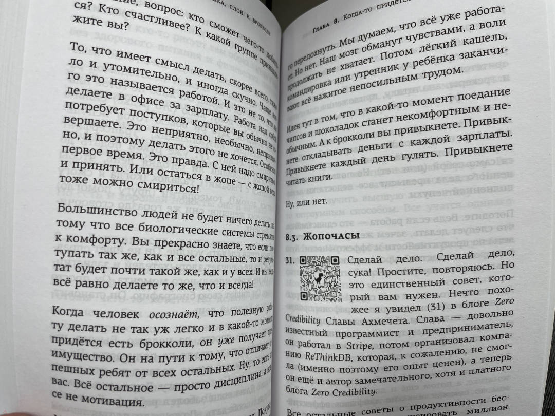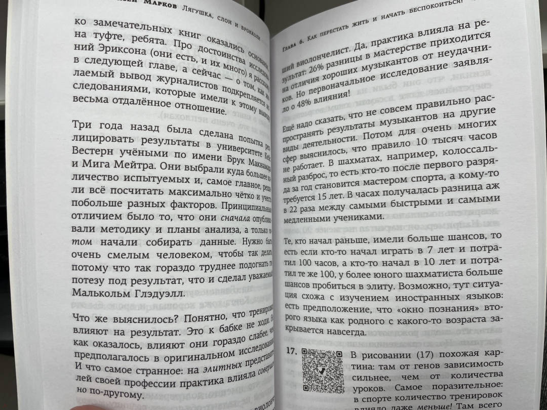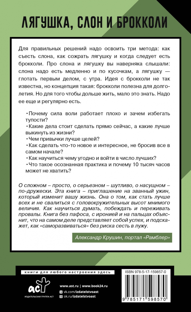 ОписаниеДля правильных решений надо освоить три метода:как съесть слона, как сожрать лягушку и когда следует есть брокколи. Про слона и лягушку вы наверняка слышали: слона надо есть медленно и по кусочкам, а лягушку - глотать первым делом, с утра. Идея с брокколи не так известна, но концепция такая: брокколи полезна для долголетия.Но для того, чтобы дольше жить, мало это знать. Надо её ещё и регулярно есть.Почему сила воли работает плохо и зачем избегать тупости? Какие дела стоит сделать прямо сейчас, а какие лучше выкинуть из жизни? Чем привычки лучше целей? Как сделать что-то новое и интересное, не бросив все в самом начале? Как научиться чему угодно и войти в число лучших? Что такое осознанная практика и почему 10 тысяч часов может не хватить?Алексей Марков, кандидат экономических наук, автор знаменитой "Хулиномики", рок-звезда и отец четверых детей учит людей думать в своей привычной манере: точно, жёстко, с циничными шутками и очень лёгким языком.Для правильных решений надо освоить три метода:как съесть слона, как сожрать лягушку и когда следует есть брокколи. Про слона и лягушку вы наверняка слышали: слона надо есть медленно и по кусочкам, а лягушку - глотать первым делом, с утра. Идея с брокколи не так известна, но концепция такая: брокколи полезна для долголетия.Но для того, чтобы дольше жить, мало это знать. Надо её ещё и регулярно есть.Почему сила воли работает плохо и зачем избегать тупости? Какие дела стоит сделать прямо сейчас, а какие лучше выкинуть из жизни? Чем привычки лучше целей? Как сделать что-то новое и интересное, не бросив все в самом начале? Как научиться чему угодно и войти в число лучших? Что такое осознанная практика и почему 10 тысяч часов может не хватить?Алексей Марков, кандидат экономических наук, автор знаменитой "Хулиномики", рок-звезда и отец четверых детей учит людей думать в своей привычной манере: точно, жёстко, с циничными шутками и очень лёгким языком.
