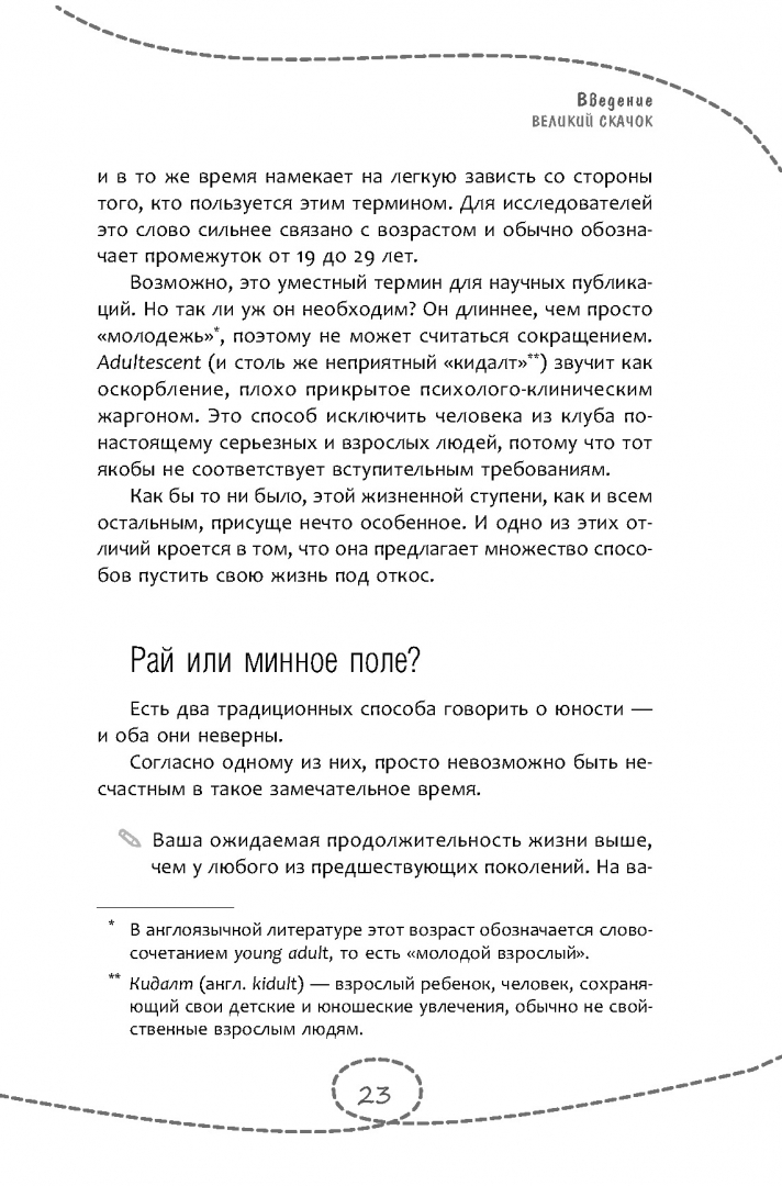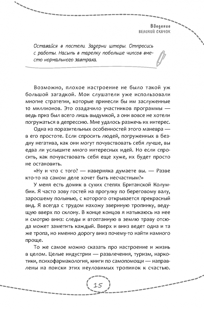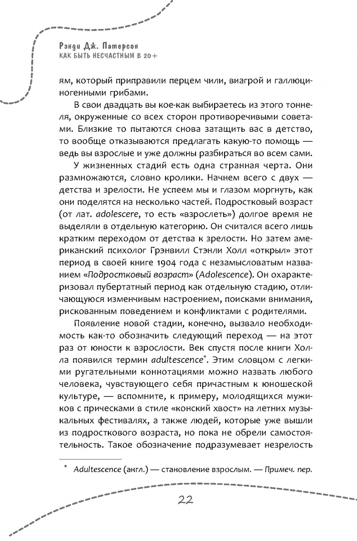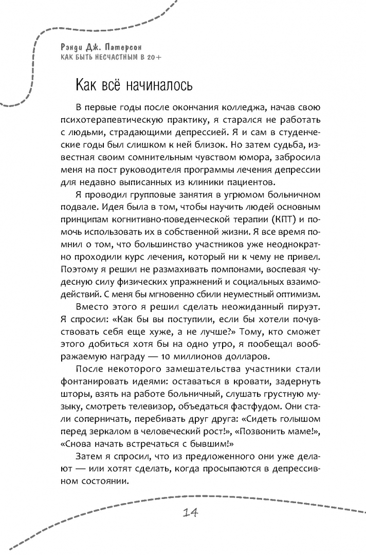 ОписаниеБыть несчастным можно в любом возрасте, но именно переход к взрослой жизни предлагает множество уникальных способов пустить свою жизнь под откос. Никак не можете покинуть родительский дом и перекладываете все решения на окружающих? Сидите на диване и ждете, пока вам откроется истинное предназначение? Подчиняете свои цели и поведение расхожим стандартам и ярлыкам? Так держать! К несчастью ведет множество путей - вы всегда сможете найти тот, что придется по душе именно вам.Рэнди Патерсон - практикующий психотерапевт, автор бестселлера "Как быть несчастным" и обладатель фирменного чувства юмора - покажет самые распространенные ловушки и подводные камни, подстерегающие каждого человека в возрасте от 18 до 30 лет. В этой книге вы не найдете банальностей, обещаний счастья и сказочного благополучия. Вместо этого вы найдете 40 надежных способов максимально испортить себе жизнь. Не упустите этот шанс.Если вы, напротив, хотите взять свою жизнь под контроль, наполнить ее смыслом и выработать навыки, которые необходимы каждому взрослому человеку - делайте все наоборот. В любом случае эта книга не оставит вас равнодушным и поможет составить четкий план на лучшее (или худшее) будущее.СвернутьБыть несчастным можно в любом возрасте, но именно переход к взрослой жизни предлагает множество уникальных способов пустить свою жизнь под откос. Никак не можете покинуть родительский дом и перекладываете все решения на окружающих? Сидите на диване и ждете, пока вам откроется истинное предназначение? Подчиняете свои цели и поведение расхожим стандартам и ярлыкам? Так держать! К несчастью ведет множество путей - вы всегда сможете найти тот, что придется по душе именно вам.Рэнди Патерсон - практикующий психотерапевт, автор бестселлера "Как быть несчастным" и обладатель фирменного чувства юмора - покажет самые распространенные ловушки и подводные камни, подстерегающие каждого человека в возрасте от 18 до 30 лет. В этой книге вы не найдете банальностей, обещаний счастья и сказочного благополучия. Вместо этого вы найдете 40 надежных способов максимально испортить себе жизнь. Не упустите этот шанс.Если вы, напротив, хотите взять свою жизнь под контроль, наполнить ее смыслом и выработать навыки, которые необходимы каждому взрослому человеку - делайте все наоборот. В любом случае эта книга не оставит вас равнодушным и поможет составить четкий план на лучшее (или худшее) будущее.СвернутьСвернуть