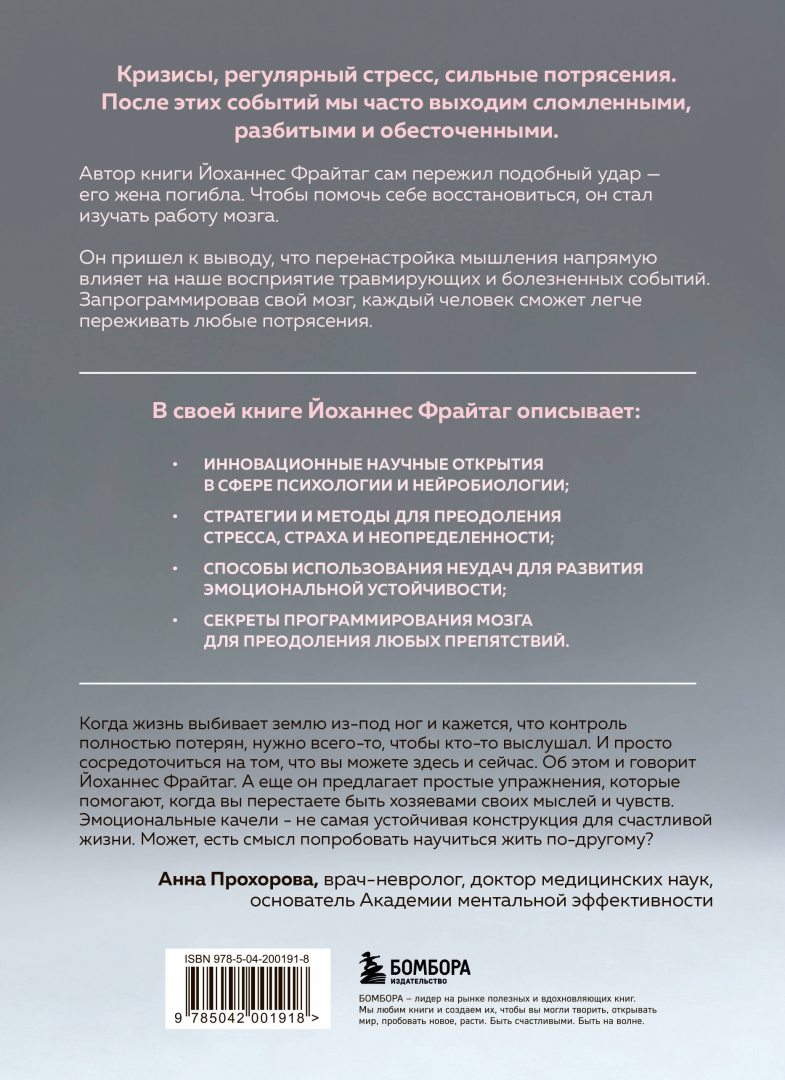 ОписаниеКризисы, регулярный стресс, сильные потрясения. После этих событий мы часто выходим сломленными, разбитыми и обесточенными. Автор книги Йоханнес Фрайтаг сам пережил подобный удар — его жена погибла. Чтобы помочь себе восстановиться, он стал изучать работу мозга. Он пришел к выводу, что перенастройка мышления напрямую влияет на наше восприятие травмирующих и болезненных событий. Запрограммировав свой мозг, каждый человек сможет легче переживать любые потрясения. В своей книге Йоханнес Фрайтаг описывает: - инновационные научные открытия в сфере психологии и нейробиологии; - стратегии и методы для преодоления стресса, страха и неопределенности. - способы использования неудач для развития эмоциональной устойчивости. - секреты программирования мозга для преодоления любых препятствий.Кризисы, регулярный стресс, сильные потрясения. После этих событий мы часто выходим сломленными, разбитыми и обесточенными. Автор книги Йоханнес Фрайтаг сам пережил подобный удар — его жена погибла. Чтобы помочь себе восстановиться, он стал изучать работу мозга. Он пришел к выводу, что перенастройка мышления напрямую влияет на наше восприятие травмирующих и болезненных событий. Запрограммировав свой мозг, каждый человек сможет легче переживать любые потрясения. В своей книге Йоханнес Фрайтаг описывает: - инновационные научные открытия в сфере психологии и нейробиологии; - стратегии и методы для преодоления стресса, страха и неопределенности. - способы использования неудач для развития эмоциональной устойчивости. - секреты программирования мозга для преодоления любых препятствий.