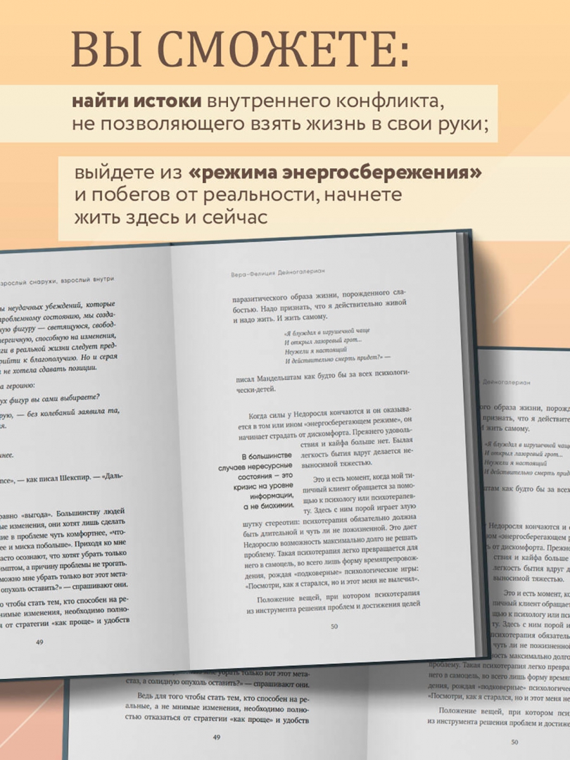 ОписаниеМы руководим крупными компаниями, а приходя домой хотим на ручки. Мы меняем партнеров в надежде, что это заполнит душевную пустоту. Мы покупаем дорогие гаджеты, потому что нужно "баловать внутреннего ребенка". С виду мы кажемся взрослыми, но внутри нам одиноко, больно и тревожно… Психотерапевт Вера Дейногалериан утверждает: "Пока наш внутренний ребенок обижен, недолюблен и напуган, его бесполезно баловать, - его нужно спасать". В этой книге Вера предлагает нам изучить язык бессознательного, чтобы встретиться лицом к лицу со своей болью и исцелить ее. Здесь не будет медитаций, волшебства и аффирмаций. Только практичные инструменты, благодаря которым сотни клиентов обрели психологическую зрелость и наконец стали хозяевами своей жизни. Об авторе: Вера Дейногалериан - психотерапевт, помогающий прокачивать сферу финансов, духовность, уверенность в себе через бессознательное, без долгих лет терапии. В этой книге Вера предлагает читателям самые действенные инструменты для работы с нашим бессознательным. Освоив их, мы сможем повзрослеть, чтобы великолепно чувствовать себя во взрослом мире огромных возможностей, открытых дорог и большой свободы. Здесь также поднимается проблема психологической незрелости и внутреннего ребенка. Автор использует эмоционально-образную терапию, предлагая клиентам и читателям обратиться к внутренним образам, порождающим внутренний конфликт. Цитаты: "Когда мы вычищаем из фигуры маленькой девочки негативные убеждения о семейной жизни и работе, та моментально трансформируется во взрослую женщину". "Внутренние дети в вашем бессознательном крайне неблагополучны. Они недолюблены, напуганы, боятся ошибиться, не справиться, боятся наказания". "Недоросль больше не отрицательный герой, заслуживающий осмеяния, он - персонаж, над которым смеются все более с теплыми чувствами". "Психологически-ребенок не способен к эффективному менеджменту собственной жизни. Он не умеет расставлять приоритеты и организовать жизнь так, чтобы разные сферы ее не конфликтовали, а двадцати четырех часов в сутках хватало, чтобы уделить внимание всем значимым задачам". "Сколько бы ни уверяли нас, что "детскость" хороша непосредственностью и креативностью, мы чувствуем, что дело пахнет коллективной деградацией, а не прогрессом". "Психологическое взросление - путь к самому быстрому достижению ваших целей". "Именно невзрослость, остановка в психологическом развитии идентичностей стала причиной проблем моих клиентов". Отзыв: "Очень трезвая книга про разницу детства и инфантилизма. Про взрослость и ответственность. Про авторскую позицию. Пособие о всём том, что так важно нашему поколению больших детей, которые выросли, но всё ещё не повзрослели". - Антон Нефедов, игорокоуч, бизнес-психолог, автор книг "Зоопарк в твоей голове", "Право быть совой"СвернутьМы руководим крупными компаниями, а приходя домой хотим на ручки. Мы меняем партнеров в надежде, что это заполнит душевную пустоту. Мы покупаем дорогие гаджеты, потому что нужно "баловать внутреннего ребенка". С виду мы кажемся взрослыми, но внутри нам одиноко, больно и тревожно… Психотерапевт Вера Дейногалериан утверждает: "Пока наш внутренний ребенок обижен, недолюблен и напуган, его бесполезно баловать, - его нужно спасать". В этой книге Вера предлагает нам изучить язык бессознат
