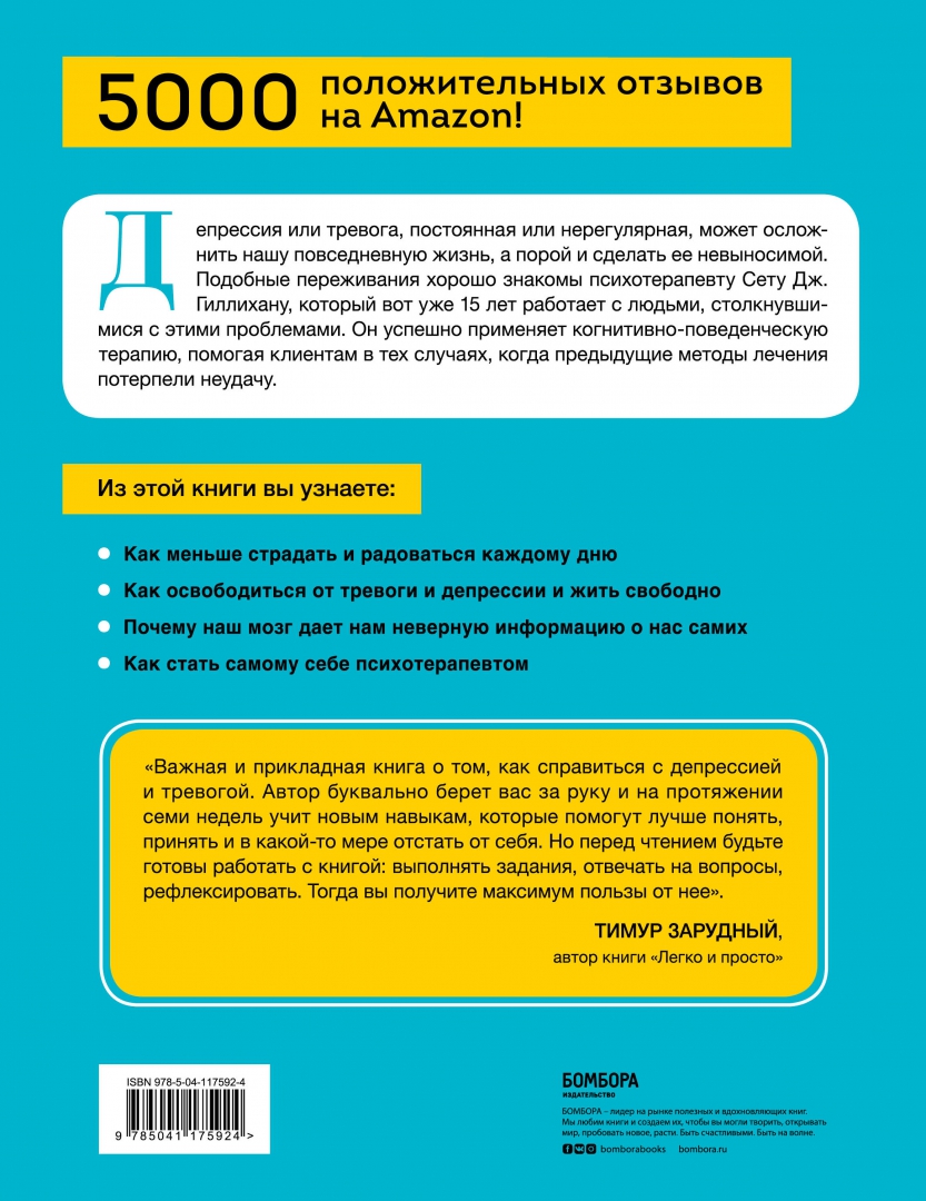 ОписаниеБОЛЕЕ 5000 ПОЛОЖИТЕЛЬНЫХ ОТЗЫВОВ НА АМАЗОН!ВХОДИТ В ТОП-10 КНИГ ПО КОГНИТИВНОЙ ПСИХОЛОГИИ!КЛИНИЧЕСКИ ДОКАЗАННЫЙ СПОСОБ БОРЬБЫ С ТРЕВОГОЙ И ДЕПРЕССИЕЙ! Депрессия или тревога, постоянная или нерегулярная, может осложнить нашу повседневную жизнь, а порой и сделать ее невыносимой. Психотерапевт Сет Дж. Гиллихан уже 15 лет специализируется на работе с тревогой и депрессией. Он успешно применяет когнитивно-поведенческую терапию (КПТ), помогая клиентам в тех случаях, когда предыдущие методы лечения потерпели неудачу. Из этой книги вы узнаете:- Как меньше страдать и жить более полноценно.- Как освободиться от тревоги и депрессии и жить свободно.- Почему наш мозг дает нам неверную информацию о нас самих.- Как стать вашим собственным психотерапевтом.- Что такое КПТ и какие ее основные принципы.- Как применять техники КПТ в различных жизненных ситуациях.БОЛЕЕ 5000 ПОЛОЖИТЕЛЬНЫХ ОТЗЫВОВ НА АМАЗОН!ВХОДИТ В ТОП-10 КНИГ ПО КОГНИТИВНОЙ ПСИХОЛОГИИ!КЛИНИЧЕСКИ ДОКАЗАННЫЙ СПОСОБ БОРЬБЫ С ТРЕВОГОЙ И ДЕПРЕССИЕЙ! Депрессия или тревога, постоянная или нерегулярная, может осложнить нашу повседневную жизнь, а порой и сделать ее невыносимой. Психотерапевт Сет Дж. Гиллихан уже 15 лет специализируется на работе с тревогой и депрессией. Он успешно применяет когнитивно-поведенческую терапию (КПТ), помогая клиентам в тех случаях, когда предыдущие методы лечения потерпели неудачу. Из этой книги вы узнаете:- Как меньше страдать и жить более полноценно.- Как освободиться от тревоги и депрессии и жить свободно.- Почему наш мозг дает нам неверную информацию о нас самих.- Как стать вашим собственным психотерапевтом.- Что такое КПТ и какие ее основные принципы.- Как применять техники КПТ в различных жизненных ситуациях.