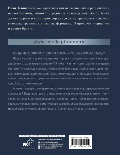 ОписаниеКогда мы говорим слово - "человек" - что мы имеем в виду? Образ мыслей, страхи и привычки, чувства и эмоции, мыслительные процессы или стратегии реагирования? А может, клетки, ткани, органы или целые системы? А есть еще вопросы, которые человек задает себе и миру, действия для реализации своих желаний, есть коммуникация с большим количеством людей, ситуации, в которых оказывается человек и наполняет их своим смыслом. Все это тоже человек. А может, говоря о человеке, мы имеем в виду связь всех вышеупомянутых процессов? Ведь если все это наполняет и окружает человека, значит, он и является точкой, которая объединяет в себе паттерны, происшествия в жизни, социальную адаптацию, соматические реакции, образ мышления, восприятие мира и даже стечение обстоятельств. Значит, все это и есть человек.Практический психолог, эксперт в области психосоматики, гипнолог, радио и телеведущий. Автор более десяти курсов и семинаров, провел десятки групповых психологических тренингов в разных форматах. В прошлом журналист и артист балета.