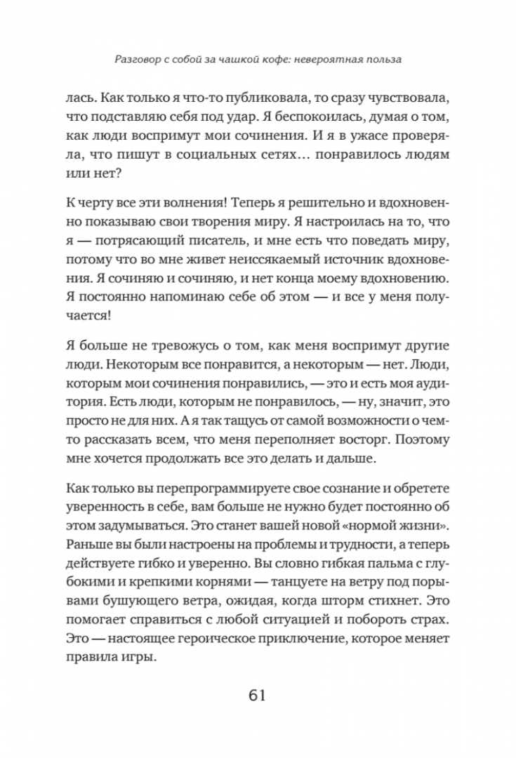 ОписаниеЕсли вы устали жить скучной жизнью и хотите прожить ее полной ярких приключений, получая нужные результаты - то эта простая 5-минутная программа для вас. Разговор за чашкой кофе с самим собой поможет вам настроить мозг, чтобы легче достигать своих целей, быть счастливым и здоровым, повысить самооценку, создать безмятежное спокойствие и обрести стрессоустойчивость.Если вы устали жить скучной жизнью и хотите прожить ее полной ярких приключений, получая нужные результаты - то эта простая 5-минутная программа для вас. Разговор за чашкой кофе с самим собой поможет вам настроить мозг, чтобы легче достигать своих целей, быть счастливым и здоровым, повысить самооценку, создать безмятежное спокойствие и обрести стрессоустойчивость.