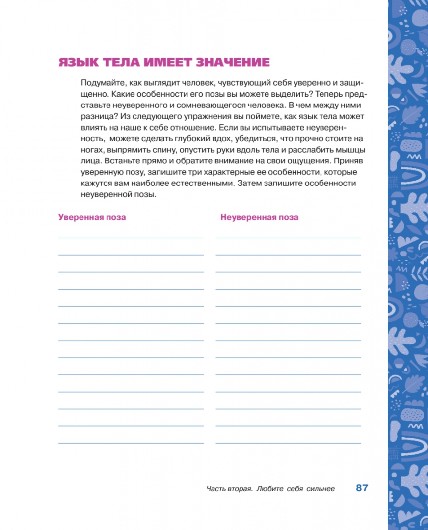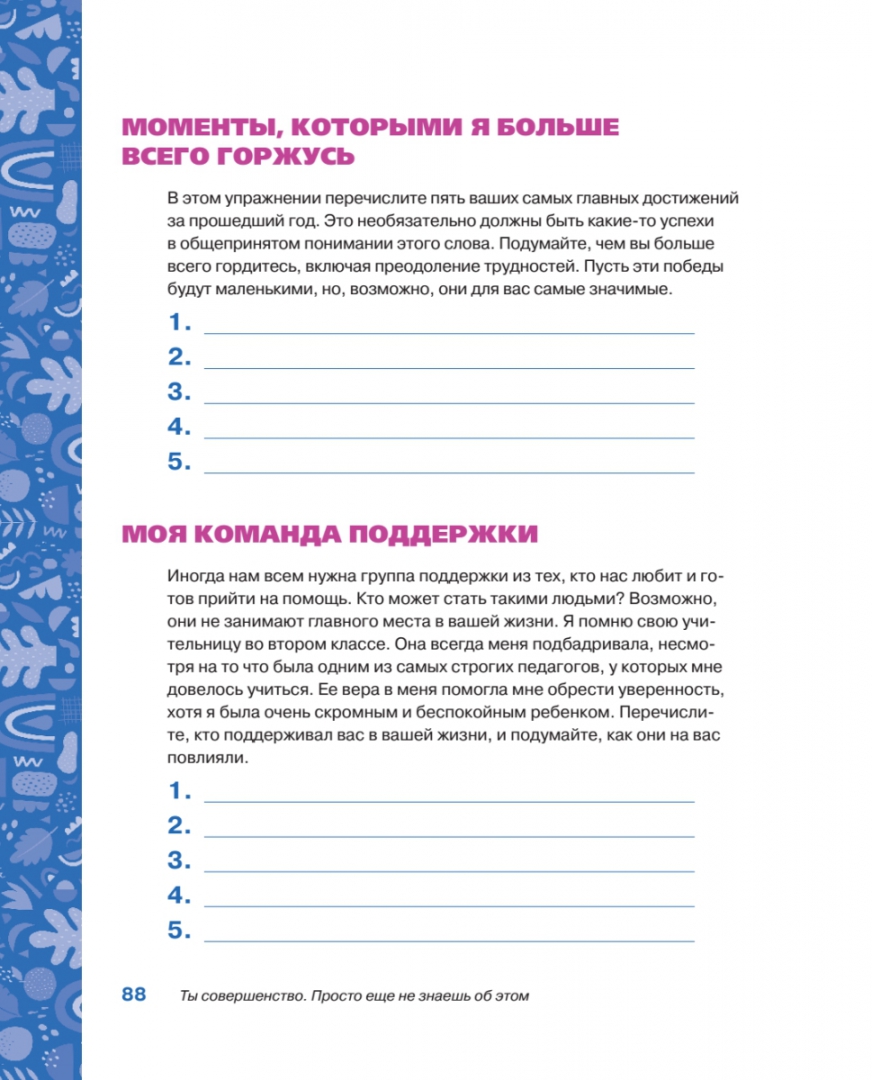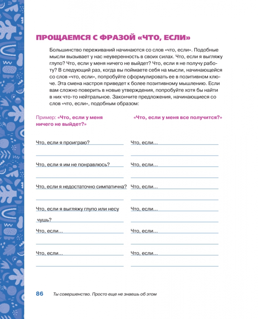 ОписаниеОткройте трансформирующую силу любви к себе. На пути женщины к полной реализации своего потенциала любовь к себе - это мощный стимул. Книга "Ты совершенство" дает возможность сосредоточиться на собственном эмоциональном здоровье и воспитать в себе умение поддерживать себя в трудные моменты и получать удовольствие от жизни. Улучшая отношения с самими собой, женщины могут развить уверенность, необходимую им для того, чтобы выстраивать жизнь по собственному сценарию. Остроумные подсказки, викторины и творческие занятия, разработанные психотерапевтом Мэган Логан, делают создание привычек ухода за собой увлекательным занятием. Проверенные терапевтические средства и письменные упражнения помогают женщинам соприкоснуться со своими мыслями и чувствами, помогают избавиться от сомнений и навязанных обществом стереотипов. Развивайте любовь к себе и становитесь по-женски сильной с помощью этой интерактивной книги!Мэган Логан - психотерапевт с более чем 20-летним опытом консультирования в различных учреждениях по охране психического здоровья, включая центры по борьбе с насилием в семье и сексуальным насилием; автор программы по борьбе с расстройствами пищевого поведения и местной программы хосписа. В течение последних 10 лет она занималась частной практикой, специализируясь на вопросах, связанных с травмами, жестоким обращением, расстройствами пищевого поведения, горем и потерей.СвернутьОткройте трансформирующую силу любви к себе. На пути женщины к полной реализации своего потенциала любовь к себе - это мощный стимул. Книга "Ты совершенство" дает возможность сосредоточиться на собственном эмоциональном здоровье и воспитать в себе умение поддерживать себя в трудные моменты и получать удовольствие от жизни. Улучшая отношения с самими собой, женщины могут развить уверенность, необходимую им для того, чтобы выстраивать жизнь по собственному сценарию. Остроумные подсказки, викторины и творческие занятия, разработанные психотерапевтом Мэган Логан, делают создание привычек ухода за собой увлекательным занятием. Проверенные терапевтические средства и письменные упражнения помогают женщинам соприкоснуться со своими мыслями и чувствами, помогают избавиться от сомнений и навязанных обществом стереотипов. Развивайте любовь к себе и становитесь по-женски сильной с помощью этой интерактивной книги!Мэган Логан - психотерапевт с более чем 20-летним опытом консультирования в различных учреждениях по охране психического здоровья, включая центры по борьбе с насилием в семье и сексуальным насилием; автор программы по борьбе с расстройствами пищевого поведения и местной программы хосписа. В течение последних 10 лет она занималась частной практикой, специализируясь на вопросах, связанных с травмами, жестоким обращением, расстройствами пищевого поведения, горем и потерей.СвернутьСвернуть