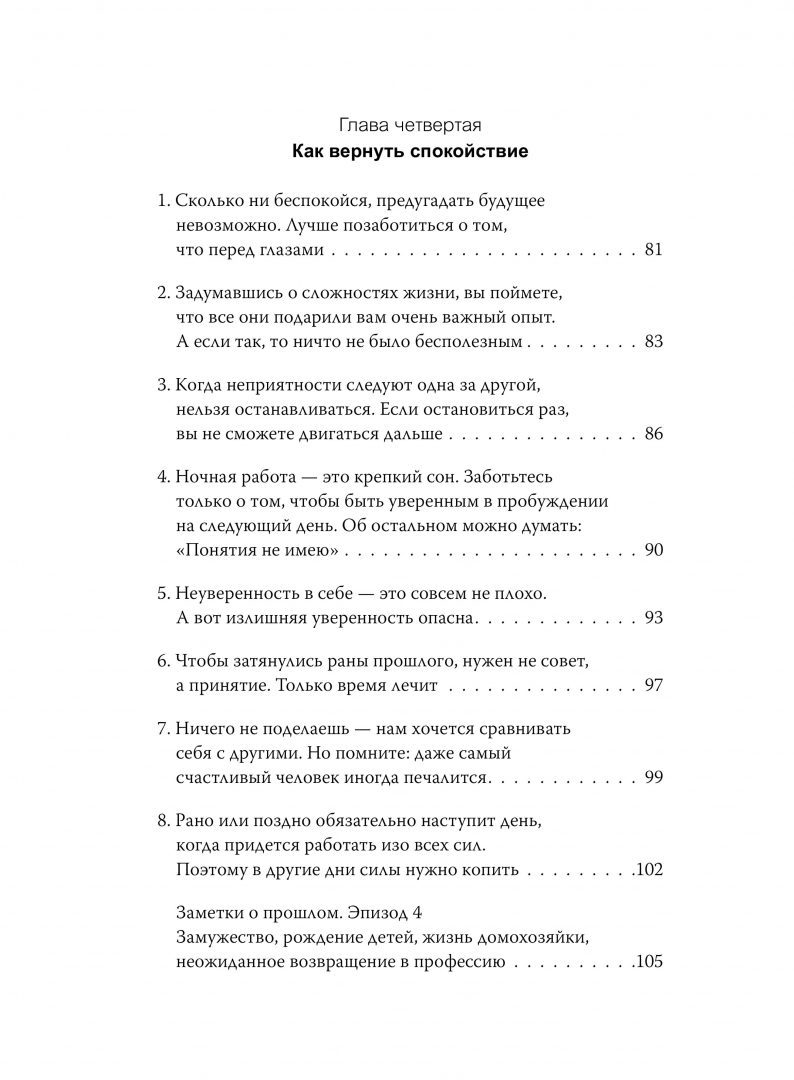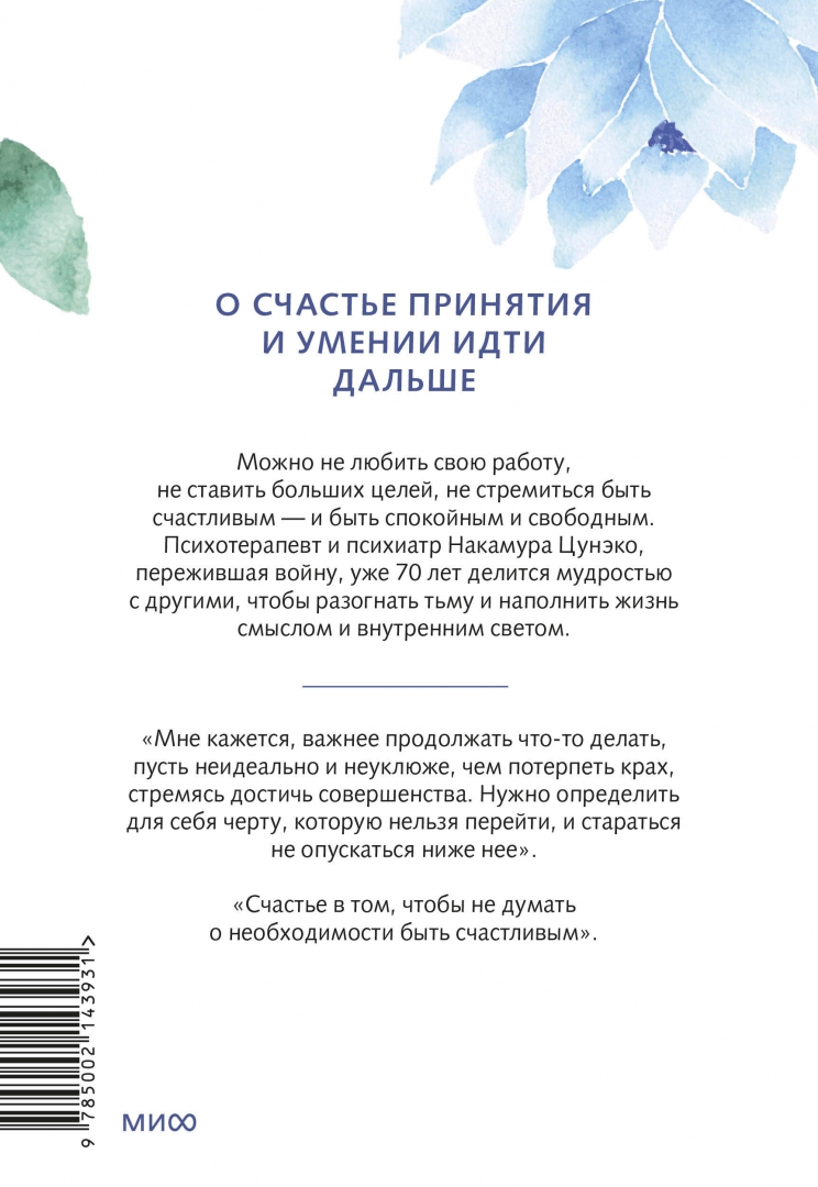 ОписаниеМожно не любить свою работу, не ставить больших целей, не стремиться к счастью — и быть спокойным и свободным.Психотерапевт и психиатр Накамура Цунэко, пережившая войну, уже 70 лет делится мудростью с другими, чтобы разогнать тьму и наполнить жизнь смыслом и внутренним светом."Мне кажется, важнее продолжать что-то делать, пусть неидеально и неуклюже, чем потерпеть крах, стремясь достичь совершенства. Нужно определить для себя черту, которую нельзя перейти, и стараться не опуститься ниже"."Счастье в том, чтобы не думать о необходимости быть счастливым".Можно не любить свою работу, не ставить больших целей, не стремиться к счастью — и быть спокойным и свободным.Психотерапевт и психиатр Накамура Цунэко, пережившая войну, уже 70 лет делится мудростью с другими, чтобы разогнать тьму и наполнить жизнь смыслом и внутренним светом."Мне кажется, важнее продолжать что-то делать, пусть неидеально и неуклюже, чем потерпеть крах, стремясь достичь совершенства. Нужно определить для себя черту, которую нельзя перейти, и стараться не опуститься ниже"."Счастье в том, чтобы не думать о необходимости быть счастливым".