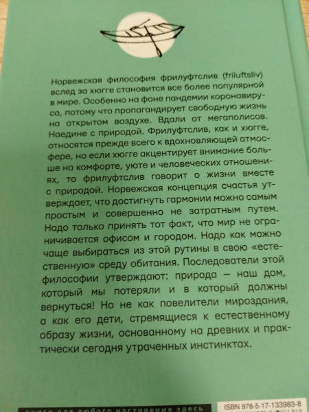 ОписаниеНорвежская философия фрилуфтслив (friluftsliv) вслед за хюгге становится все более популярной в мире. Особенно на фоне пандемии коронавируса, потому что пропагандирует свободную жизнь на открытом воздухе. Вдали от мегаполисов. Наедине с природой. Фрилуфтслив, как и хюгге, относятся прежде всего к вдохновляющей атмосфере, но если хюгге акцентирует внимание больше на комфорте, уюте и человеческих отношениях, то фрилуфтслив говорит о жизни вместе с природой. Норвежская концепция счастья утверждает, что достигнуть гармонии можно самым простым и совершенно не затратным путем. Надо только принять тот факт, что мир не ограничивается офисом и городом. Надо как можно чаще выбираться из этой рутины в свою "естественную" среду обитания. Последователи этой философии утверждают: природа - наш дом, который мы потеряли и в который должны вернуться! Но не как повелители мироздания, а как его дети. И стремиться к естественному образу жизни, основанному на древних и практически сегодня утраченных инстинктах.СвернутьНорвежская философия фрилуфтслив (friluftsliv) вслед за хюгге становится все более популярной в мире. Особенно на фоне пандемии коронавируса, потому что пропагандирует свободную жизнь на открытом воздухе. Вдали от мегаполисов. Наедине с природой. Фрилуфтслив, как и хюгге, относятся прежде всего к вдохновляющей атмосфере, но если хюгге акцентирует внимание больше на комфорте, уюте и человеческих отношениях, то фрилуфтслив говорит о жизни вместе с природой. Норвежская концепция счастья утверждает, что достигнуть гармонии можно самым простым и совершенно не затратным путем. Надо только принять тот факт, что мир не ограничивается офисом и городом. Надо как можно чаще выбираться из этой рутины в свою "естественную" среду обитания. Последователи этой философии утверждают: природа - наш дом, который мы потеряли и в который должны вернуться! Но не как повелители мироздания, а как его дети. И стремиться к естественному образу жизни, основанному на древних и практически сегодня утраченных инстинктах.СвернутьСвернуть