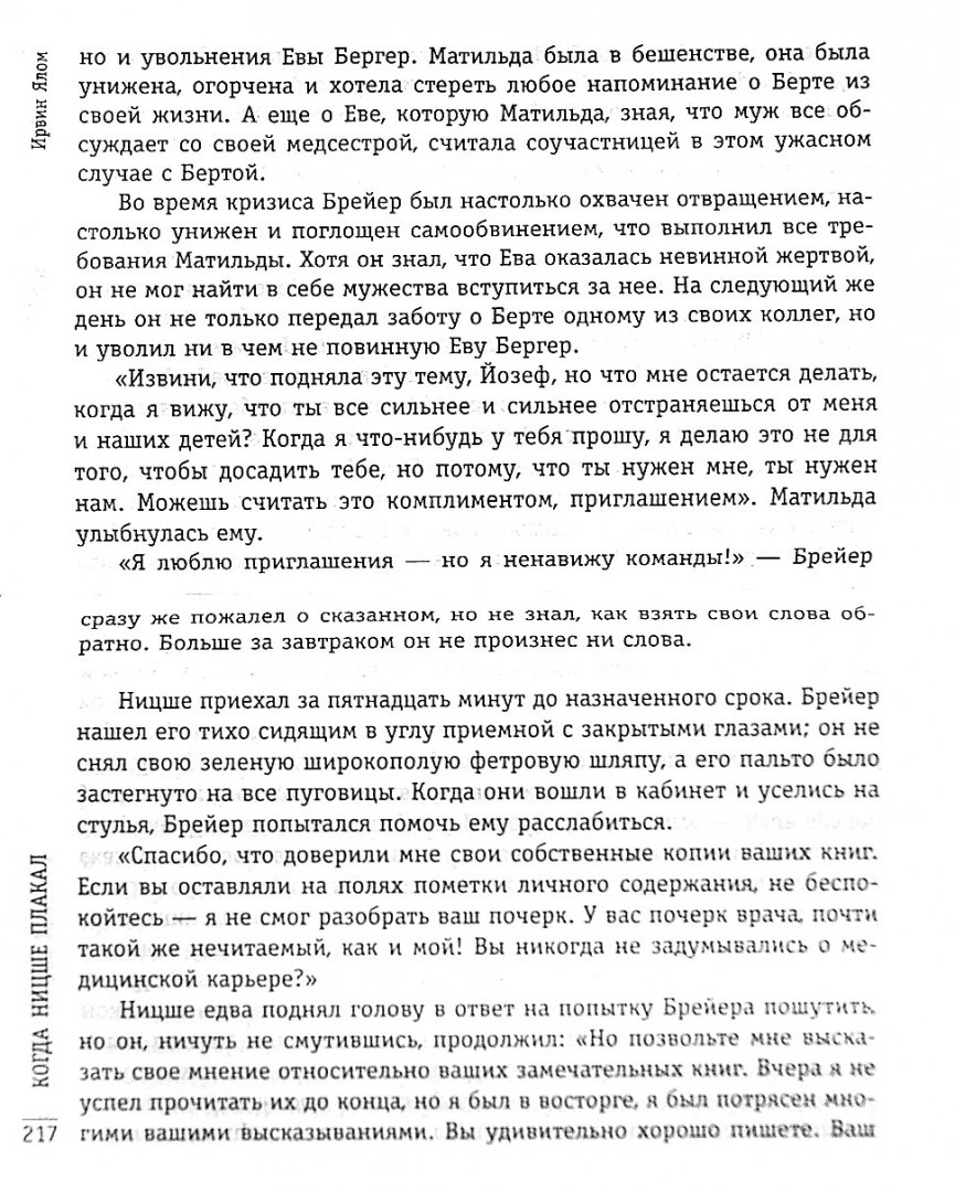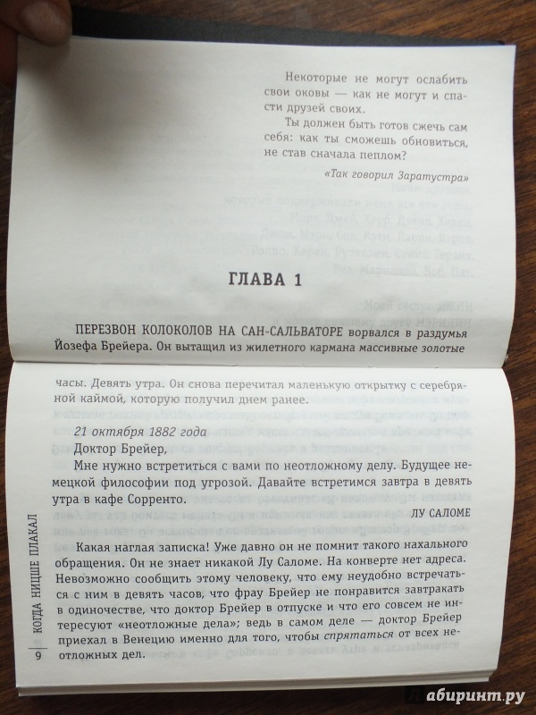 ОписаниеАвтор многочисленных бестселлеров Ирвин Ялом представляет вашему вниманию захватывающую смесь фактов и вымысла, драму о любви, судьбе и воле, разворачивающуюся на фоне интеллектуального брожения Вены девятнадцатого века, в преддверии зарождения психоанализа. Незаурядный пациент... Талантливый лекарь, терзаемый мучениями... Тайный договор. Соединение этих элементов порождает незабываемую сагу будто бы имевших место взаимоотношений величайшего философа Европы (Ф.Ницше) и одного из отцов-основателей психоанализа (Й.Брейера). Ялом втягивает в действие не только Ницше и Брейера, но и Лу Саломе, "Анну О." и молодого медика-интерна Зигмунда Фрейда.Автор многочисленных бестселлеров Ирвин Ялом представляет вашему вниманию захватывающую смесь фактов и вымысла, драму о любви, судьбе и воле, разворачивающуюся на фоне интеллектуального брожения Вены девятнадцатого века, в преддверии зарождения психоанализа. Незаурядный пациент... Талантливый лекарь, терзаемый мучениями... Тайный договор. Соединение этих элементов порождает незабываемую сагу будто бы имевших место взаимоотношений величайшего философа Европы (Ф.Ницше) и одного из отцов-основателей психоанализа (Й.Брейера). Ялом втягивает в действие не только Ницше и Брейера, но и Лу Саломе, "Анну О." и молодого медика-интерна Зигмунда Фрейда.