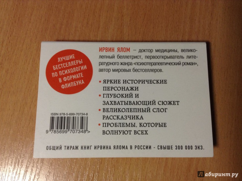 Объем, стр. 720 ISBN 978-5-699-70734-8 Автор Ялом Ирвин, Будынина М. Переводчик Будынина М. Серия Лучшее в психологии. Флипбуки Минимальный возраст 16+ Год издания книги 2014 Тип обложки Мягкий переплет Иллюстрации Без иллюстраций Вес, г 112г Размеры 105х85х20 мм - Отзывы