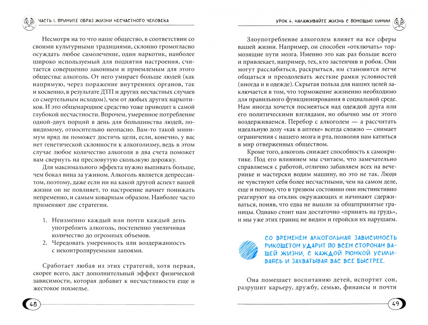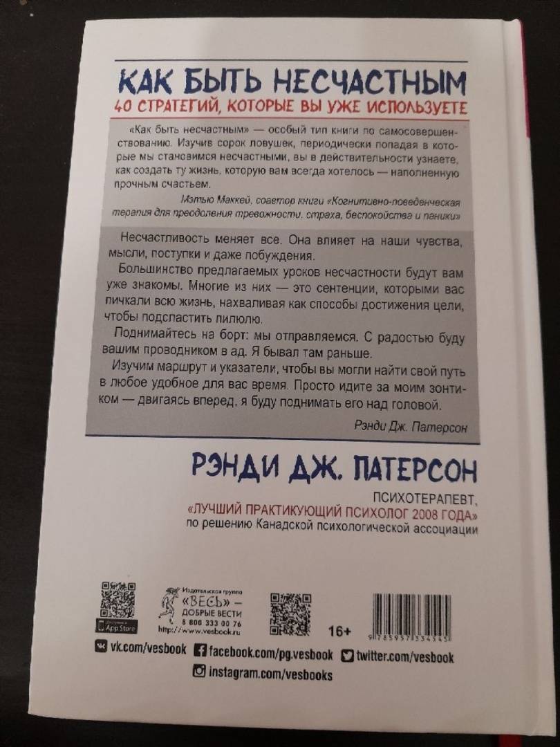 ОписаниеКаждый год публикуются сотни книг по самосовершенствованию. И у каждой, прямо или косвенно, одна и та же цель — сделать вас счастливым. Как разбогатеть — и стать счастливым. Как похудеть — и стать счастливым. Как преодолеть депрессию — и стать счастливым. Как найти подходящего человека — и стать счастливым. Если же все эти советы вам не помогли, возможно, страдание — ваша истинная судьба? Давайте его оптимизировать!Несчастливость — не просто пункт назначения. Она немного похожа на игру в теннис: набор навыков, которые можно оттачивать и совершенствовать. В этой книге вы познакомитесь со множеством стратегий, как стать менее счастливым. Конечно, некоторые из них вы уже освоили и регулярно применяете. Но ведь всегда можно стать еще лучше — хотя в данном случае, пожалуй, следует сказать: хуже?Если вы хотите заключить свое несчастье в объятия, следуйте инструкциям психотерапевта, специализирующегося на лечении тревожных расстройств и депрессии, Рэнди Патерсона! Если же втайне надеетесь достичь счастья, делайте все наоборот… Кайфоломщик.О чем книгаТехники, которые помогут вам стать несчастным, сгруппированы в четыре раздела.В первом, «Примите образ жизни несчастного человека», описываются основные черты унылого существования: то, что вы можете делать изо дня в день, дабы усугубить свою несчастливость.Из второго раздела, «Мыслите как несчастный человек», вы узнаете, как создавать плохое настроение, перестроив собственное мышление. Искусно изменяя направленность внимания, вы сможете чувствовать себя несчастным независимо от внешних обстоятельств. Считайте это системой уроков по антиосознанности.В третьем разделе, «Ад — это другие», речь идет о том, как усугубить свое несчастье с помощью отношений. Немного усилий — и вы сможете превратить любые теплые отношения во враждебные и натянутые.И наконец, благодаря разделу «Ведите бессмысленную жизнь» вы освоите стратегии искоренения любого смысла в вашей жизни.Почему книгу стоит прочитатьКогда мы несчастливы, нас все время тянет делать именно то, от чего нам становится еще хуже и чего мы в иные времена делать, конечно, не стали бы. Так мы попадаем в «спираль несчастья», которая увлекает нас все глубже и глубже.Но вдруг вы загоняете себя на путь страданий неосознанно? Советы психотерапевта Рэнди Патерсона помогут понять механизмы достижения несчастья и действовать по плану — твердой рукой направляя корабль своей жизни прямо на скалы.Для кого эта книгаКнига будет интересна как опытным страдальцам, так и тем, кто только вступил на путь несчастья. Среди 40 стратегий каждый найдет что-то подходящее именно ему. Кто-то хочет совершенствоваться в постановке расплывчатых, иллюзорных целей, а кто-то — в постоянном подстраивании под нужды окружающих.Почему решили издатьКнига Рэнди Патерсона — шедевр пародии на рекомендации, как справляться с неизбежными трудностями и жить счастливой и полноценной жизнью. Автор — психотерапевт, многие годы занимающийся лечением тревожных расстройств и депрессии. Книга «Как быть несчастным» получила самые высокие оценки в профессиональном сообществе.Об автореРэнди Дж. Патерсон — психотерапевт, директор клиники Changeways в Ванкувере, Британская Колумбия, Канада. Он ведет учебные программы для врачей. А также является автором нескольких научн