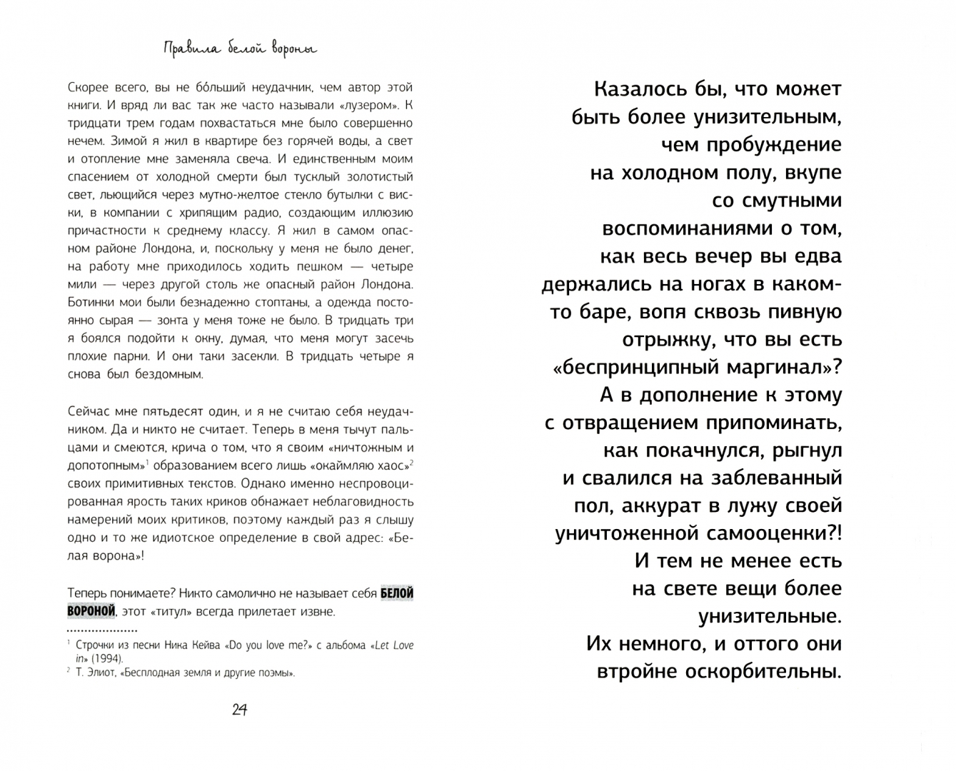 ОписаниеЭта книга раскрывает не только значение понятия "белая ворона", или маргинал. Она повествует об истинных ценностях, даруемых нам образованием, а именно: об умении быть собой и мужестве не стыдиться этого.Ярлык "белой вороны" обычно навешивают на того, кто не боится действовать вразрез с общепринятыми нормами. При этом не обязательно, что такой человек сознательно идет на конфликт с системой. Личности, по определению, тесно в любых рамках. Это заложено в природе человека. Ни одна система не в состоянии учесть и удовлетворить все наши глубинные потребности.Подобострастное следование общепринятым нормам не способно привести к эпохальным научным открытиям, не породит шедевральные произведения искусства и не укажет путь к свободе от тирании. Жажду знаний у ребенка также нельзя регламентировать. Норма является синонимом тюрьмы.Фил Бидл не провокатор и не подстрекатель, хотя многим удобно навешивать на него именно такие уничижительные ярлыки (особенно тем, кто страшится вольнодумия). У него аллергия на бредовые идеи. Он выступает за свободу против посредственности, серости, способных отравить и разрушить жизнь.СвернутьЭта книга раскрывает не только значение понятия "белая ворона", или маргинал. Она повествует об истинных ценностях, даруемых нам образованием, а именно: об умении быть собой и мужестве не стыдиться этого.Ярлык "белой вороны" обычно навешивают на того, кто не боится действовать вразрез с общепринятыми нормами. При этом не обязательно, что такой человек сознательно идет на конфликт с системой. Личности, по определению, тесно в любых рамках. Это заложено в природе человека. Ни одна система не в состоянии учесть и удовлетворить все наши глубинные потребности.Подобострастное следование общепринятым нормам не способно привести к эпохальным научным открытиям, не породит шедевральные произведения искусства и не укажет путь к свободе от тирании. Жажду знаний у ребенка также нельзя регламентировать. Норма является синонимом тюрьмы.Фил Бидл не провокатор и не подстрекатель, хотя многим удобно навешивать на него именно такие уничижительные ярлыки (особенно тем, кто страшится вольнодумия). У него аллергия на бредовые идеи. Он выступает за свободу против посредственности, серости, способных отравить и разрушить жизнь.СвернутьСвернуть