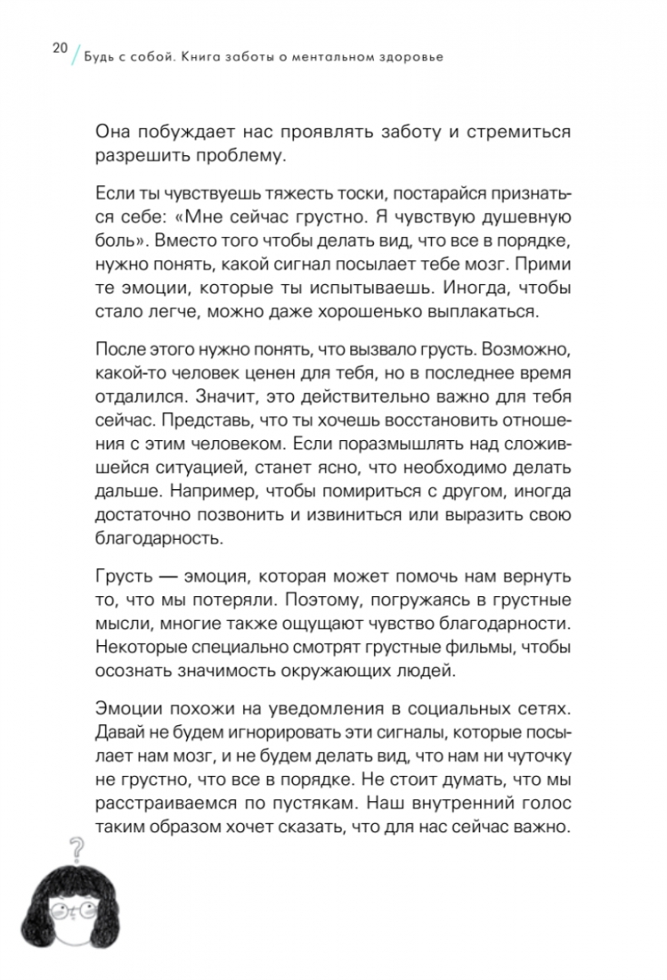 Описание"У меня ничего не получится", "все люди как люди, и только я…", "опять ляпнула глупость"… Все мы порой думаем, что окружающие более успешные и счастливые, а с нами что-то не так: мы недостаточно способные, слишком полные, низкие, веснушчатые, выглядим как-то нелепо и вообще недостойны успеха, счастья и любви.Если и ты чувствуешь подобное и частенько увлекаешься безосновательной самокритикой, эта книга для тебя! В ней известная в Корее психолог Пак Чинён разбирает наиболее распространенные проблемы, с которыми сталкиваются подростки, объясняет, как с ними справиться, и показывает, что мы ЛУЧШЕ, УМНЕЕ и СИЛЬНЕЕ, чем нам кажется.Благодаря этой книге ты:- научишься понимать свои чувства, не оценивая и не обесценивая их, а также поймешь, почему мы испытываем негативные эмоции и чем они могут быть полезны;- перестанешь зацикливаться на своих недостатках, корить себя за ошибки и бояться неудач;- узнаешь, как правильно ставить цели и добиваться желаемого результата;- начнешь относиться к себе с заботой и любовью;- обретешь уверенность в себе, своих способностях и безграничных возможностях.Стань для себя лучшим другом!Свернуть"У меня ничего не получится", "все люди как люди, и только я…", "опять ляпнула глупость"… Все мы порой думаем, что окружающие более успешные и счастливые, а с нами что-то не так: мы недостаточно способные, слишком полные, низкие, веснушчатые, выглядим как-то нелепо и вообще недостойны успеха, счастья и любви.Если и ты чувствуешь подобное и частенько увлекаешься безосновательной самокритикой, эта книга для тебя! В ней известная в Корее психолог Пак Чинён разбирает наиболее распространенные проблемы, с которыми сталкиваются подростки, объясняет, как с ними справиться, и показывает, что мы ЛУЧШЕ, УМНЕЕ и СИЛЬНЕЕ, чем нам кажется.Благодаря этой книге ты:- научишься понимать свои чувства, не оценивая и не обесценивая их, а также поймешь, почему мы испытываем негативные эмоции и чем они могут быть полезны;- перестанешь зацикливаться на своих недостатках, корить себя за ошибки и бояться неудач;- узнаешь, как правильно ставить цели и добиваться желаемого результата;- начнешь относиться к себе с заботой и любовью;- обретешь уверенность в себе, своих способностях и безграничных возможностях.Стань для себя лучшим другом!СвернутьСвернуть