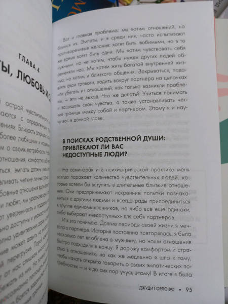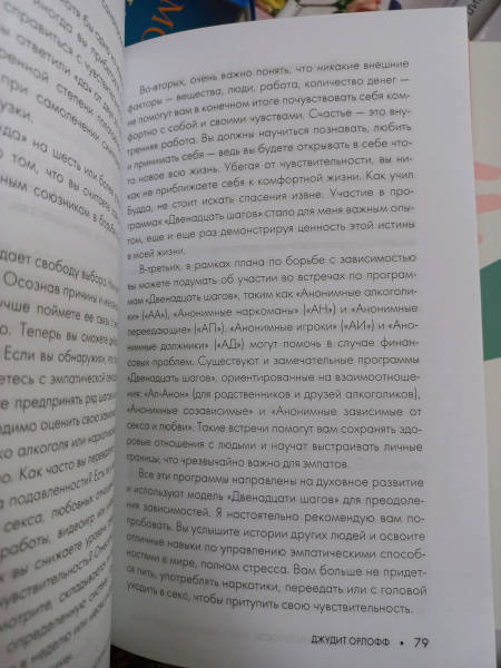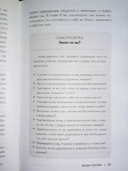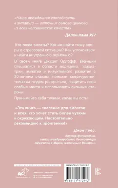 Свернуть"Наша врожденная способность к эмпатии - источник самого ценного из всех человеческих качеств"Далай-лама XIVКто такие эмпаты? Как им найти точку опоры в стрессовой ситуации? Как успокоиться и найти внутреннюю гармонию?В своей книге Джудит Орлофф, ведущий специалист в области медицины, психиатрии, эмпатии и интуитивного развития с 20-летним стажем, поможет сверхчувствительным людям раскрыться, защитить свои слабые места и использовать сильные стороны.Принимайте себя такими, какие вы есть!"Эта книга - спасение для эмпатов и всех, что хочет стать более чутким к окружающим. Настоятельно рекомендую к прочтению!"Джон Грей, доктор философии, автор международного бестселлера "Мужчины с Марса, женщины с Венеры".С какими проблемами сталкиваются сверхчувствительные люди и как их решить?
