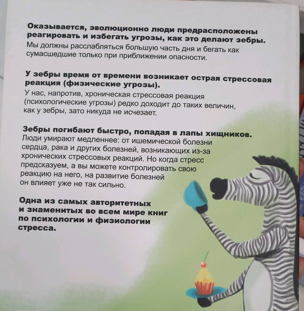 ОписаниеОказывается, эволюционно люди предрасположены реагировать и избегать угрозы, как это делают зебры. Мы должны расслабляться большую часть дня и бегать как сумасшедшие только при приближении опасности.У зебры время от времени возникает острая стрессовая реакция (физические угрозы). У нас, напротив, хроническая стрессовая реакция (психологические угрозы) редко доходит до таких величин, как у зебры, зато никуда не исчезает.Зебры погибают быстро, попадая в лапы хищников. Люди умирают медленнее: от ишемической болезни сердца, рака и других болезней, возникающих из-за хронических стрессовых реакций. Но когда стресс предсказуем, а вы можете контролировать свою реакцию на него, на развитие болезней он влияет уже не так сильно.Одна из самых авторитетных и знаменитых во всем мире книг по психологии и физиологии стресса.Оказывается, эволюционно люди предрасположены реагировать и избегать угрозы, как это делают зебры. Мы должны расслабляться большую часть дня и бегать как сумасшедшие только при приближении опасности.У зебры время от времени возникает острая стрессовая реакция (физические угрозы). У нас, напротив, хроническая стрессовая реакция (психологические угрозы) редко доходит до таких величин, как у зебры, зато никуда не исчезает.Зебры погибают быстро, попадая в лапы хищников. Люди умирают медленнее: от ишемической болезни сердца, рака и других болезней, возникающих из-за хронических стрессовых реакций. Но когда стресс предсказуем, а вы можете контролировать свою реакцию на него, на развитие болезней он влияет уже не так сильно.Одна из самых авторитетных и знаменитых во всем мире книг по психологии и физиологии стресса.