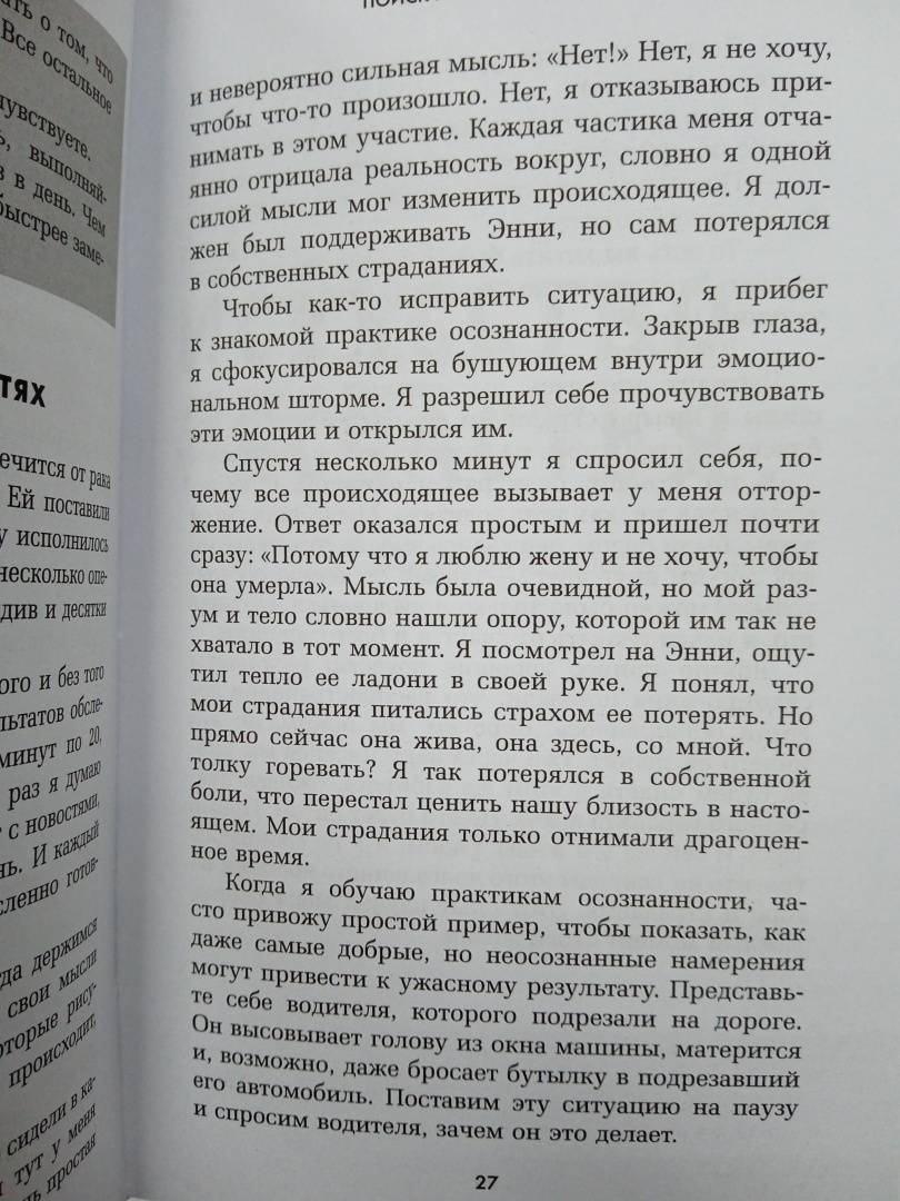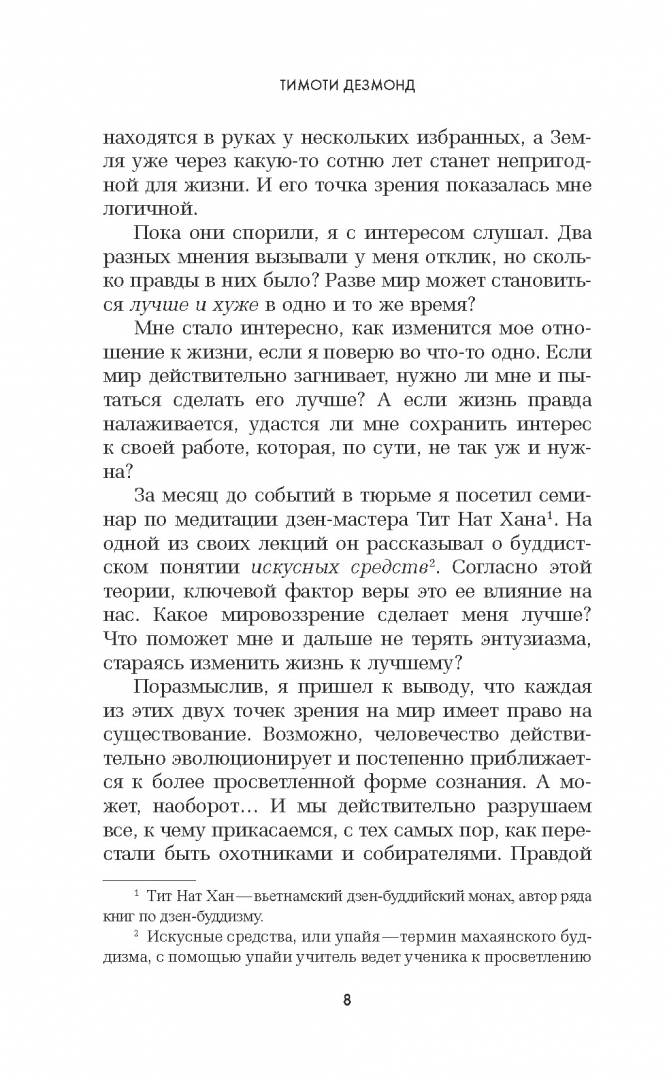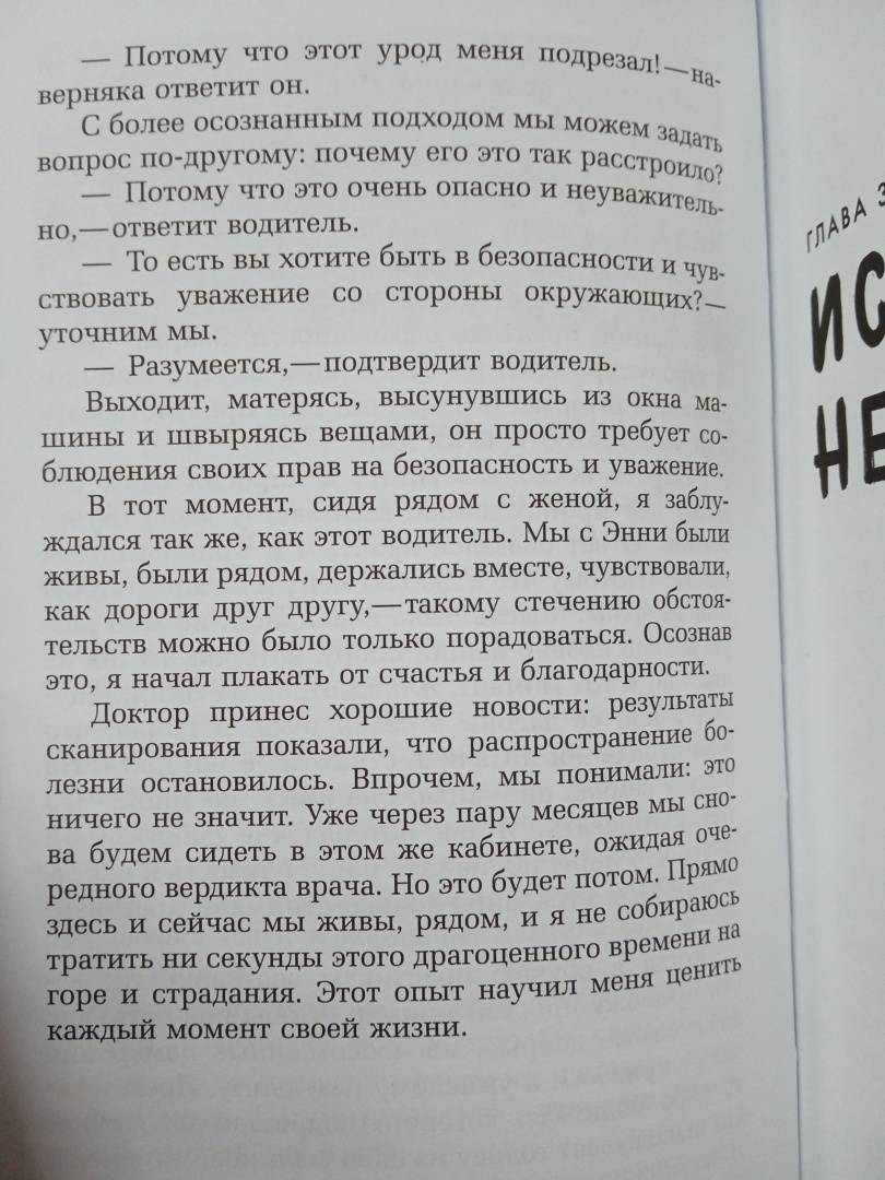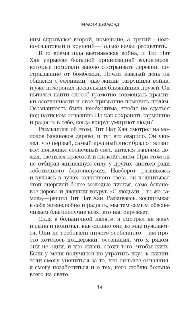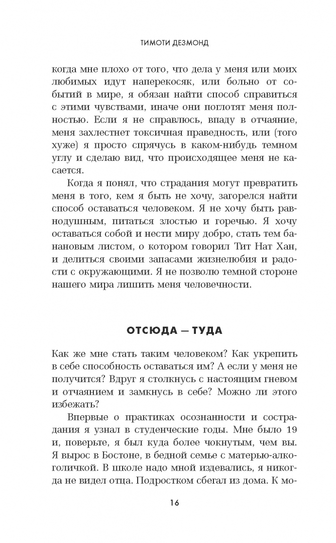 ОписаниеКнига главы отдела психологической помощи GOOGLE Тима Дезмонда отвечает на вопрос, что делать, когда мир вокруг будто бы сошел с ума. Почему одни люди отравляют жизнь другим? С какой стати деньги и власть находятся в руках у избранных? Как предотвратить то, что Земля уже через сотню лет может стать непригодной для жизни? Обо всем этом размышлял автор, сидя в тюремной камере. К Тимоти Дезмонду жизнь не была особенно благосклонной: он пережил тяжелую болезнь жены, боролся с несправедливостью, участвуя в протестном движении. Но самым страшным зрелищем ему всегда представлялись добрые люди, которых захлестнуло отчаяние. Дезмонд придумал себе идеальную жизненную цель: попытаться сделать мир лучше, чем он был до его рождения, и помочь всем хорошим людям, испытывающим боль и страдания, сохранить свою человечность. Пройдя обучение у буддийского монаха и духовного лидера Тит Нан Хана, соединив практики дзэн-буддизма и медитации с современными психологическими методиками, он изобрел свой способ жить спокойно, гармонично и счастливо, - оставаясь человеком, сострадая и помогая другим. Сегодня Тимоти Дезмонд считается лучшим специалистом по самопомощи в Силиконовой долине и знает, как сохранить равновесие и вкус жизни в нашем совершенно безумном, но все же прекрасном мире. Книга будет интересна тем, кто хочет знать: - Как оставаться человеком, когда все бесит. - Как стать бесстрашным. - Как исцелиться от душевной боли.СвернутьКнига главы отдела психологической помощи GOOGLE Тима Дезмонда отвечает на вопрос, что делать, когда мир вокруг будто бы сошел с ума. Почему одни люди отравляют жизнь другим? С какой стати деньги и власть находятся в руках у избранных? Как предотвратить то, что Земля уже через сотню лет может стать непригодной для жизни? Обо всем этом размышлял автор, сидя в тюремной камере. К Тимоти Дезмонду жизнь не была особенно благосклонной: он пережил тяжелую болезнь жены, боролся с несправедливостью, участвуя в протестном движении. Но самым страшным зрелищем ему всегда представлялись добрые люди, которых захлестнуло отчаяние. Дезмонд придумал себе идеальную жизненную цель: попытаться сделать мир лучше, чем он был до его рождения, и помочь всем хорошим людям, испытывающим боль и страдания, сохранить свою человечность. Пройдя обучение у буддийского монаха и духовного лидера Тит Нан Хана, соединив практики дзэн-буддизма и медитации с современными психологическими методиками, он изобрел свой способ жить спокойно, гармонично и счастливо, - оставаясь человеком, сострадая и помогая другим. Сегодня Тимоти Дезмонд считается лучшим специалистом по самопомощи в Силиконовой долине и знает, как сохранить равновесие и вкус жизни в нашем совершенно безумном, но все же прекрасном мире. Книга будет интересна тем, кто хочет знать: - Как оставаться человеком, когда все бесит. - Как стать бесстрашным. - Как исцелиться от душевной боли.СвернутьСвернуть