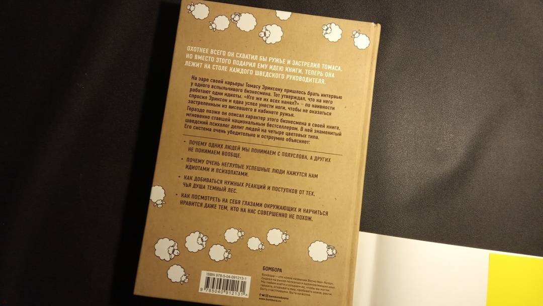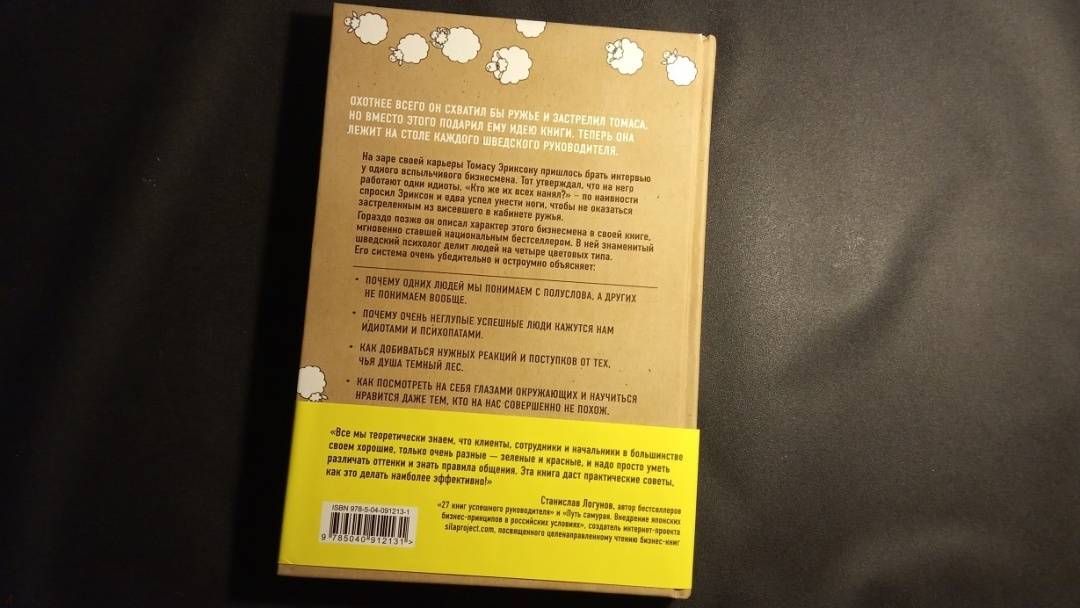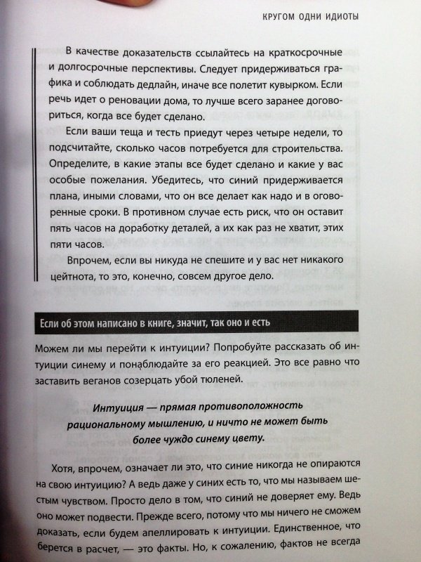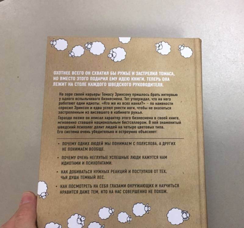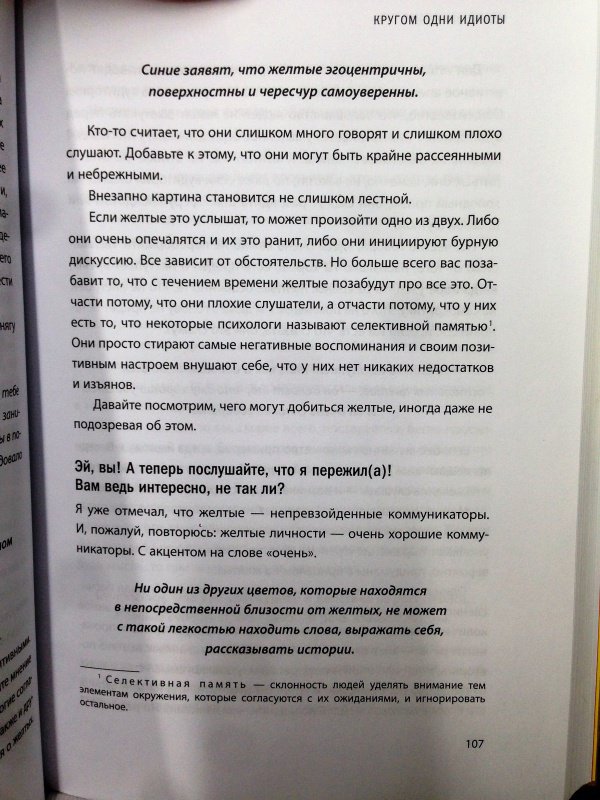 ОписаниеСкандинавский бестселлер по психологии общения. Выдержал четыре переиздания в Швеции. Являясь универсальной отмычкой к личности любого человека, эта книга лежит на столе каждого шведского руководителя, учителя и журналиста. Ее автор, знаменитый скандинавский психолог Томас Эриксон, делит всех людей на четыре цветовых типа. Он описывает логику поведения, темперамент, систему ценностей представителей каждого из цветов. Объясняет, как с ними находить общий язык, вести проекты, разрешать конфликты и заводить партнерские отношения.Система Томаса Эриксона очень убедительно и остроумно объясняет:* Почему одних людей мы понимаем с полуслова, а других не понимаем вообще?* Почему очень неглупые успешные люди кажутся нам идиотами и психопатами?* Как добиваться нужных реакций и поступков от тех, чья душа темный лес?* Как посмотреть на себя глазами окружающих и научиться нравиться даже тем, кто на нас совершенно не похож? Феномен шведского книгоиздания"Кругом одни идиоты" побили все рекорды шведского книжного рынка! Они стали одной из немногих скандинавских книг по популярной психологии, которая была переведена на 22 языка и продана общим тиражом 550 000 экземпляров! В течение двух лет книга держится в топ-5 нехудожественных произведений среди всех скандинавских изданий и не собирается сдавать позиций. В чем секрет успехаВ основе книги лежит несложная методика цветотипирования человеческих характеров. Шведский психолог Томас Эриксон делит всех людей на четыре типа: красный, желтый, зеленый, синий - и очень увлекательно, на узнаваемых примерах описывает логику поведения, темперамент, систему ценностей представителей каждого типа. Казалось бы, ничего нового. Подобный подход использовался психологами на протяжении десятилетий. Но Томасу Эриксону удалось придумать настолько удобную систему работы с известными инструментами, что сегодня книга "Кругом одни идиоты" лежит на столько каждого шведского руководителя, учителя и журналиста. Чему учит эта книгаПрежде всего тому, как понимать тех, кого понять решительно невозможно - людей с максимально отличным от нашего образом мышления, темпераментом и системой ценностей. Эту книгу можно назвать универсальной отмычкой к личности любого человека. Томас Эриксон помогает не только понять, что происходит в чужой голове и душе, но и позволяет понять, как вас воспринимают окружающие. Об автореШведский психолог, бизнес-тренер, коуч, специалист по коммуникациям. Автор двух международных бестселлеров "Кругом одни идиоты" и "Кругом одни психопаты".СвернутьСкандинавский бестселлер по психологии общения. Выдержал четыре переиздания в Швеции. Являясь универсальной отмычкой к личности любого человека, эта книга лежит на столе каждого шведского руководителя, учителя и журналиста. Ее автор, знаменитый скандинавский психолог Томас Эриксон, делит всех людей на четыре цветовых типа. Он описывает логику поведения, темперамент, систему ценностей представителей каждого из цветов. Объясняет, как с ними находить общий язык, вести проекты, разрешать конфликты и заводить партнерские отношения.Система Томаса Эриксона очень убедительно и остроумно объясняет:* Почему одних людей мы понимаем с полуслова, а других не понимаем вообще?* Почему очень неглупые успешные люди кажутся нам идиотами и психопатами?