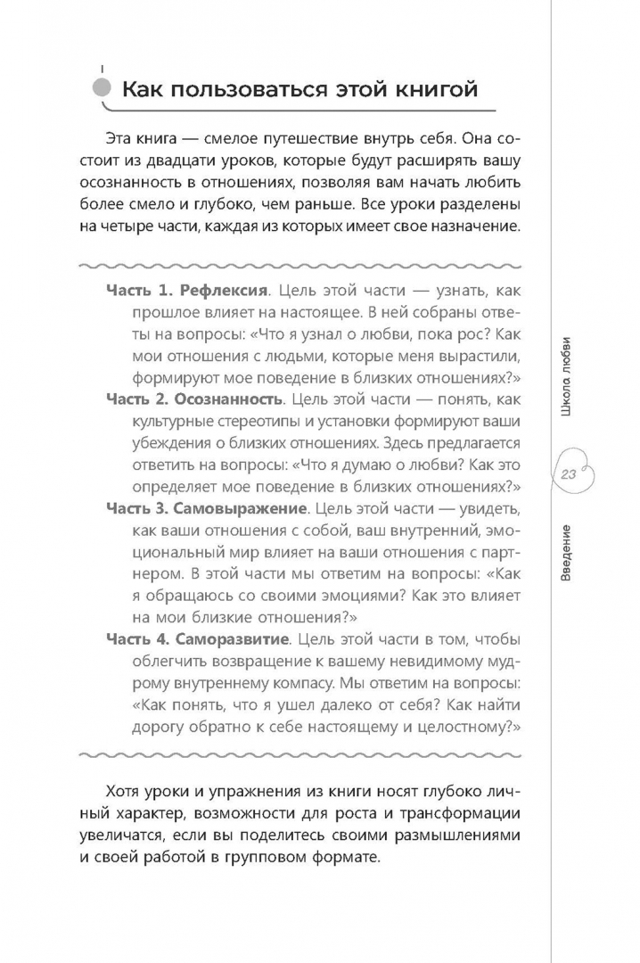ОписаниеНастоящая связь с другим человеком рождается только из глубоких и искренних отношений с самим собой. Современная культура помешана на идее любви - мы называем ее смыслом жизни и превозносим в романах и мелодрамах. Но не всем хочется признавать, что полноценные отношения требуют глубокой, смелой и подчас болезненной внутренней работы.В результате от идеализации мы быстро переходим к разочарованию, когда обнаруживаем, что наш партнер - такое же несовершенное существо, как мы сами.Эта книга - смелое путешествие к самопознанию. Она состоит из 20 уроков, которые помогут вам выстроить отношения, полные искренности, целостности и взаимной заботы. Для этого нужно развивать осознанность в отношениях - умение понимать мотивы своих поступков, уважать независимость партнера и строить общение на принятии, а не осуждении различий и недостатков. Книга психолога и эксперта по отношениям Александры Г. Соломон - прекрасный путеводитель для всех, кто хочет стать автором своей жизненной истории. Она побуждает пересмотреть убеждения о любви, сексе, половых различиях и верности, чтобы научиться любить по-настоящему глубокой и зрелой любовью."Я не могу рассказать, как надо любить, и дать рецепт успеха. Любовь слишком индивидуальна, и в ней слишком много нюансов, чтобы подчиняться правилам. Я могу только поддержать и направить вас на пути открытия вашей глубочайшей внутренней правды". Александра Г. СоломонСвернутьНастоящая связь с другим человеком рождается только из глубоких и искренних отношений с самим собой. Современная культура помешана на идее любви - мы называем ее смыслом жизни и превозносим в романах и мелодрамах. Но не всем хочется признавать, что полноценные отношения требуют глубокой, смелой и подчас болезненной внутренней работы.В результате от идеализации мы быстро переходим к разочарованию, когда обнаруживаем, что наш партнер - такое же несовершенное существо, как мы сами.Эта книга - смелое путешествие к самопознанию. Она состоит из 20 уроков, которые помогут вам выстроить отношения, полные искренности, целостности и взаимной заботы. Для этого нужно развивать осознанность в отношениях - умение понимать мотивы своих поступков, уважать независимость партнера и строить общение на принятии, а не осуждении различий и недостатков. Книга психолога и эксперта по отношениям Александры Г. Соломон - прекрасный путеводитель для всех, кто хочет стать автором своей жизненной истории. Она побуждает пересмотреть убеждения о любви, сексе, половых различиях и верности, чтобы научиться любить по-настоящему глубокой и зрелой любовью."Я не могу рассказать, как надо любить, и дать рецепт успеха. Любовь слишком индивидуальна, и в ней слишком много нюансов, чтобы подчиняться правилам. Я могу только поддержать и направить вас на пути открытия вашей глубочайшей внутренней правды". Александра Г. СоломонСвернутьСвернуть