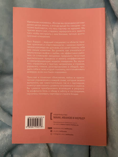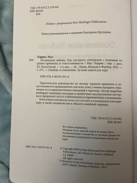 ОписаниеКнига о построении взаимоотношений, углублении и психологической гибкости с перспективы терапии принятия и ответственности (ACT, Acceptance and Commitment Therapy) - одного из направлений поведенческой психотерапии.Вы научитесь эффективно работать со сложными эмоциями, прерывать бесполезные мыслительные процессы, преодолевать ограничивающие барьеры, сосредотачиваться на том, что делаете, вовлекаться в процесс и менять неэффективные и саморазрушающие модели поведения - а значит, сможете выстроить более прочные отношения.Фишки книгиНаписана доступным языком.Предлагает эффективные способы "перенастройки" отношенийТеория и практика основаны на научном психотерапевтическом подходеДля кого книгаПодходит для всех категорий читателей - пар, которые желают избавиться от проблем во взаимоотношениях, одиноких людей, которые ищут партнера и хотят избежать прежних ошибок, специалистов - психологов и психотерапевтов.От автораЧитая эти страницы, вы поймете, как отказаться от бесполезных мифов о любви, как построить подлинные, близкие, теплые долгосрочные отношения и как реагировать на тягостные мысли и ощущения, которые неизбежно будут возникать. Вы научитесь справляться с грустью, неприятием и страхом, управлять гневом, разочарованием и обидой, прощать себя и свою вторую половину, восстанавливать доверие, если оно было подорвано. Вы узнаете, как снизить уровень напряжения и стресса, обсуждая свои потребности и разногласия, как преобразовать возникшие в результате конфликта боль и обиду в заботу и сострадание.СвернутьКнига о построении взаимоотношений, углублении и психологической гибкости с перспективы терапии принятия и ответственности (ACT, Acceptance and Commitment Therapy) - одного из направлений поведенческой психотерапии.Вы научитесь эффективно работать со сложными эмоциями, прерывать бесполезные мыслительные процессы, преодолевать ограничивающие барьеры, сосредотачиваться на том, что делаете, вовлекаться в процесс и менять неэффективные и саморазрушающие модели поведения - а значит, сможете выстроить более прочные отношения.Фишки книгиНаписана доступным языком.Предлагает эффективные способы "перенастройки" отношенийТеория и практика основаны на научном психотерапевтическом подходеДля кого книгаПодходит для всех категорий читателей - пар, которые желают избавиться от проблем во взаимоотношениях, одиноких людей, которые ищут партнера и хотят избежать прежних ошибок, специалистов - психологов и психотерапевтов.От автораЧитая эти страницы, вы поймете, как отказаться от бесполезных мифов о любви, как построить подлинные, близкие, теплые долгосрочные отношения и как реагировать на тягостные мысли и ощущения, которые неизбежно будут возникать. Вы научитесь справляться с грустью, неприятием и страхом, управлять гневом, разочарованием и обидой, прощать себя и свою вторую половину, восстанавливать доверие, если оно было подорвано. Вы узнаете, как снизить уровень напряжения и стресса, обсуждая свои потребности и разногласия, как преобразовать возникшие в результате конфликта боль и обиду в заботу и сострадание.СвернутьСвернуть