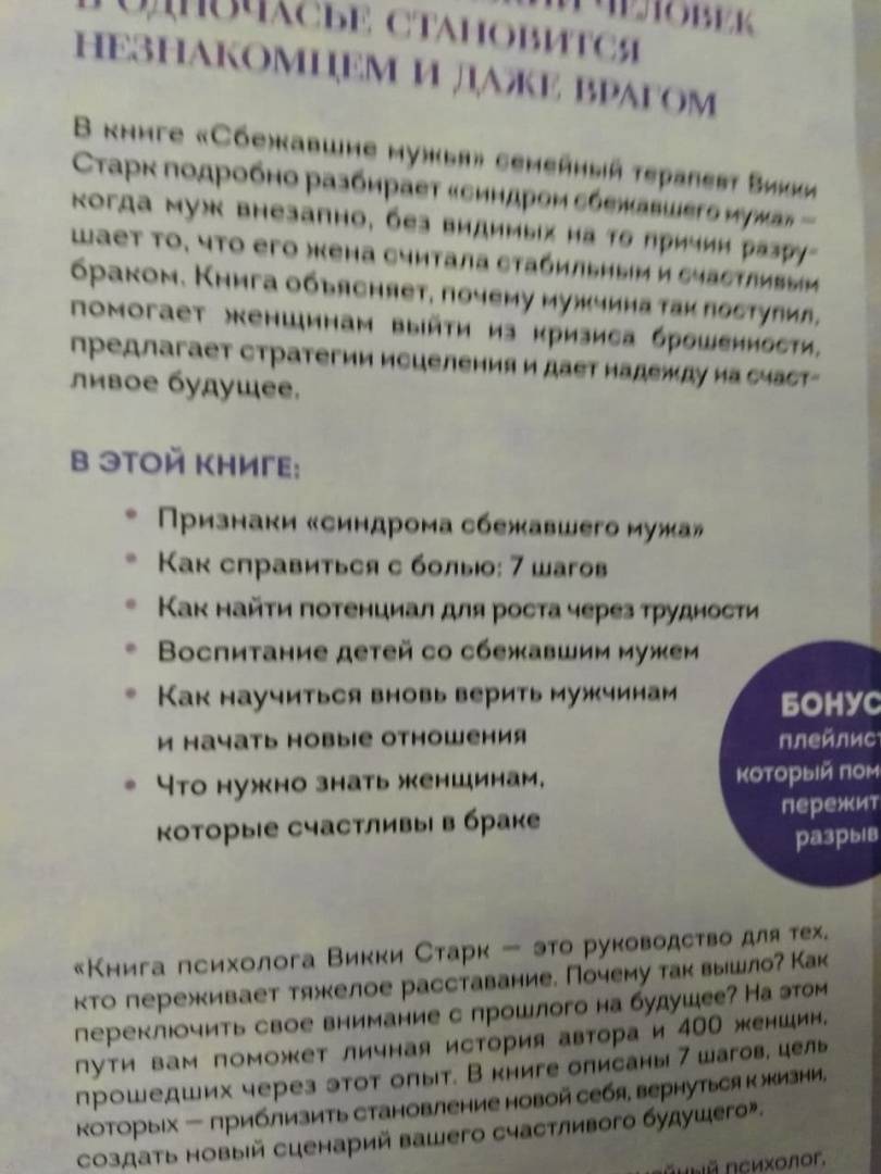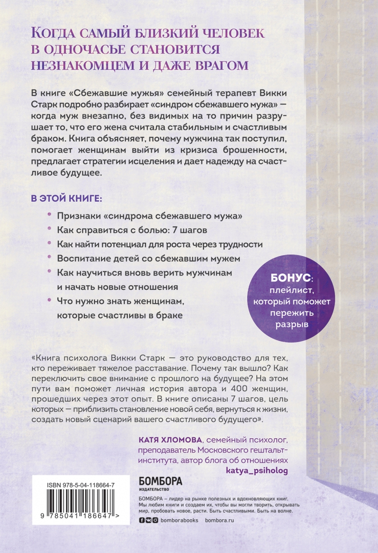 ОписаниеВикки Старк - психотерапевт, писатель, блогер, директор консультационного центра, живет в Монреале.Когда самый близкий человек в одночасье становится незнакомцем и даже врагом.В книге "Сбежавшие мужья" семейный терапевт Викки Старк подробно разбирает "синдром сбежавшего мужа" - когда муж внезапно, без видимых на то причин разрушает то, что его жена считала стабильным и счастливым браком. Книга объясняет, почему мужчина так поступил, помогает женщинам выйти из кризиса брошенности, предлагает стратегии исцеления и дает надежду на счастливое будущее. В ЭТОЙ КНИГЕ:- Признаки "синдрома сбежавшего мужа".- Как справиться с болью: 7 шагов.- Как найти потенциал для роста через трудности.- Воспитание детей со сбежавшим мужем.- Как научиться вновь верить мужчинам и начать новые отношения. - Что нужно знать женщинам, которые счастливы в браке.- БОНУС: плейлист, который поможет пережить разрыв. "Книга психолога Викки Старк - это руководство для тех, кто переживает после тяжелого расставания. Почему так вышло? Как переключить свое внимание с прошлого на будущее? На этом пути вам поможет личная история автора и 400 женщин, прошедших через этот опыт. В книге описаны 7 шагов, цель которых - приблизить становление новой себя, вернуться к жизни, создать новый сценарий вашего счастливого будущего". - Катя Хломова, семейный психолог, преподаватель Московского гештальт-института, автор блога об отношениях katya_psihologСвернутьВикки Старк - психотерапевт, писатель, блогер, директор консультационного центра, живет в Монреале.Когда самый близкий человек в одночасье становится незнакомцем и даже врагом.В книге "Сбежавшие мужья" семейный терапевт Викки Старк подробно разбирает "синдром сбежавшего мужа" - когда муж внезапно, без видимых на то причин разрушает то, что его жена считала стабильным и счастливым браком. Книга объясняет, почему мужчина так поступил, помогает женщинам выйти из кризиса брошенности, предлагает стратегии исцеления и дает надежду на счастливое будущее. В ЭТОЙ КНИГЕ:- Признаки "синдрома сбежавшего мужа".- Как справиться с болью: 7 шагов.- Как найти потенциал для роста через трудности.- Воспитание детей со сбежавшим мужем.- Как научиться вновь верить мужчинам и начать новые отношения. - Что нужно знать женщинам, которые счастливы в браке.- БОНУС: плейлист, который поможет пережить разрыв. "Книга психолога Викки Старк - это руководство для тех, кто переживает после тяжелого расставания. Почему так вышло? Как переключить свое внимание с прошлого на будущее? На этом пути вам поможет личная история автора и 400 женщин, прошедших через этот опыт. В книге описаны 7 шагов, цель которых - приблизить становление новой себя, вернуться к жизни, создать новый сценарий вашего счастливого будущего". - Катя Хломова, семейный психолог, преподаватель Московского гештальт-института, автор блога об отношениях katya_psihologСвернутьСвернуть