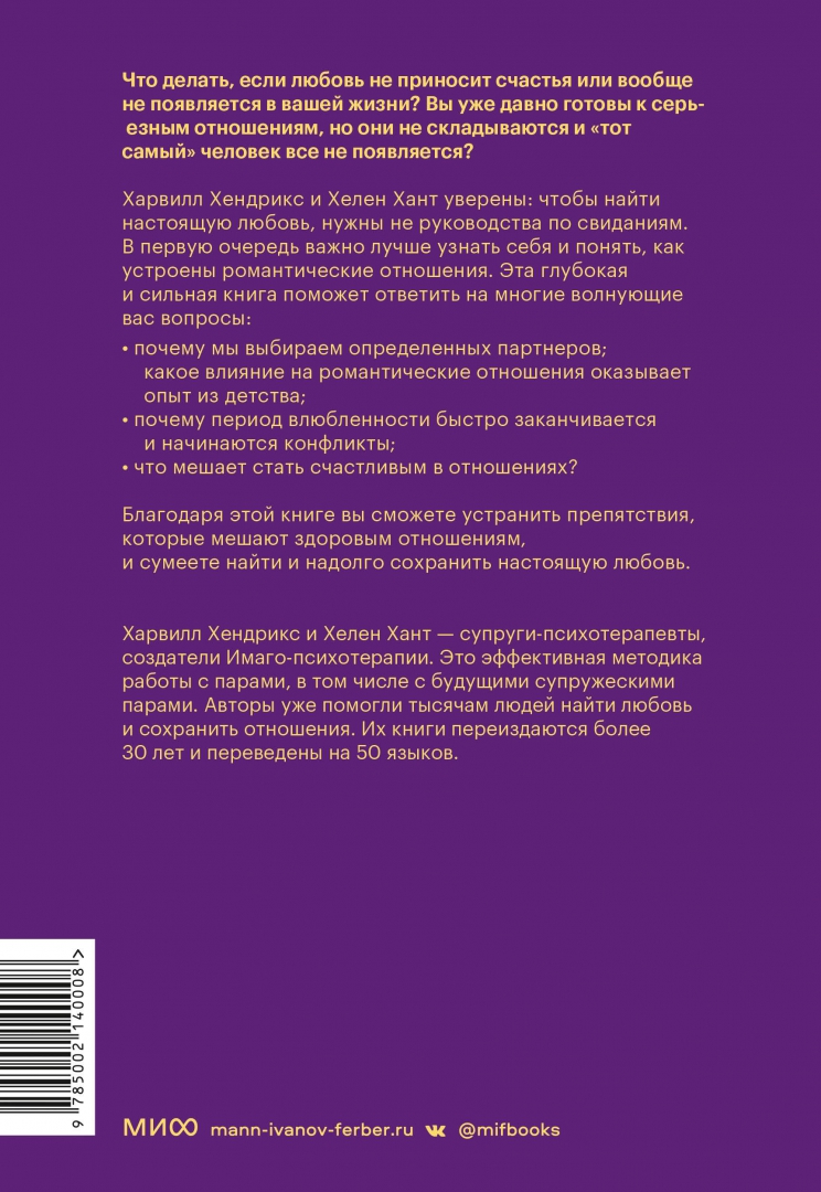 ОписаниеВы мечтаете найти спутника жизни? Это естественный человеческий инстинкт, и ваша мечта вполне достижима. Однако даже у самых осознанных людей могут быть неразрешенные конфликты, которые заставляют их искать неподходящих партнеров, невольно саботировать собственные отношения и избегать обязательств, не понимая причин этого.Книга "Как найти любовь, которую стоит сохранить" написана известными специалистами по взаимоотношениям и авторами бестселлера "Любовь на всю жизнь" - основателями имаго-психотерапии и психотерапевтами Харвиллом Хендриксом и Хелен Хант.- Определите свое имаго - образ партнера в вашем подсознании, который сформировался без вашего участия, но исходя из вашего опыта.- Освободитесь от шаблонов брака родителей, которые вы неосознанно приняли в качестве модели собственных отношений.- Развивайте коммуникативные навыки, чтобы превратить конфликт в контакт - и единение.- Превратите прошлые отношения в источник позитивного роста.- Откройте для себя радости настоящей любви и мелочи, которые ее продлевают.Наполненная мудростью и состраданием "Как найти любовь, которую стоит сохранить", поможет вам начать следующие отношения наилучшим образом и надолго сохранить сильную любовь!СвернутьВы мечтаете найти спутника жизни? Это естественный человеческий инстинкт, и ваша мечта вполне достижима. Однако даже у самых осознанных людей могут быть неразрешенные конфликты, которые заставляют их искать неподходящих партнеров, невольно саботировать собственные отношения и избегать обязательств, не понимая причин этого.Книга "Как найти любовь, которую стоит сохранить" написана известными специалистами по взаимоотношениям и авторами бестселлера "Любовь на всю жизнь" - основателями имаго-психотерапии и психотерапевтами Харвиллом Хендриксом и Хелен Хант.- Определите свое имаго - образ партнера в вашем подсознании, который сформировался без вашего участия, но исходя из вашего опыта.- Освободитесь от шаблонов брака родителей, которые вы неосознанно приняли в качестве модели собственных отношений.- Развивайте коммуникативные навыки, чтобы превратить конфликт в контакт - и единение.- Превратите прошлые отношения в источник позитивного роста.- Откройте для себя радости настоящей любви и мелочи, которые ее продлевают.Наполненная мудростью и состраданием "Как найти любовь, которую стоит сохранить", поможет вам начать следующие отношения наилучшим образом и надолго сохранить сильную любовь!СвернутьСвернуть