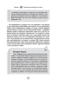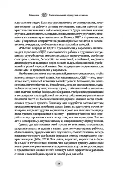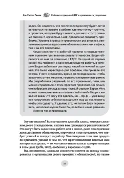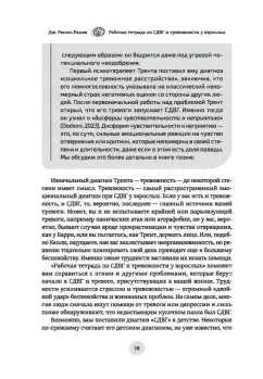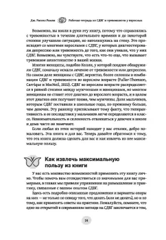 ОписаниеРабочая тетрадь по СДВГ и тревожности у взрослых: навыки когнитивно-поведенческой терапии для управления стрессом, обретения фокуса внимания и восстановления своей жизниВы составляете для себя планы, которые слишком долго откладываете, и позже вам приходится метаться в панике, чтобы всё успеть? Само ожидание неприятных дел и вынужденных усилий только увеличивает прокрастинацию? Вы сталкиваетесь с негативными реакциями людей, опаздывая, забывая об обещании, упуская важную деталь, теряя что-то? Знакомы с неодобрительными взглядами, тяжелыми вздохами и открытой критикой? Если вы себя узнали хотя бы в одном описании, то тревожность — это то, с чем приходится жить постоянно.Как правило, все это проявляется при синдроме дефицита внимания и гиперактивности у взрослых. И в случае поставленного диагноза, и в ситуации, когда вы видите у себя все признаки СДВГ, но еще не обращались за помощью к специалистам, рабочая тетрадь станет для вас первым шагом к тому, чтобы меньше тревожиться и начать жить так, как вы хотели бы.Эта книга полна стратегий, которые помогут следовать собственным планам и чувствовать удовлетворение от этого. Когнитивно-поведенческая терапия — идеальный метод, чтобы справляться с тревожностью. Она позволит ослабить влияние СДВГ на вашу повседневную жизнь и вернет веру в свои силы после ситуаций, которые развивались не так, как вам бы хотелось. У вас получится лучше следить за расписанием, постепенно отказаться от прокрастинации и получать больше удовольствия от социальных взаимодействий. Вы научитесь терпеливо справляться с неизбежными откатами в прогрессе и уделять время качественной заботе о себе.СвернутьРабочая тетрадь по СДВГ и тревожности у взрослых: навыки когнитивно-поведенческой терапии для управления стрессом, обретения фокуса внимания и восстановления своей жизниВы составляете для себя планы, которые слишком долго откладываете, и позже вам приходится метаться в панике, чтобы всё успеть? Само ожидание неприятных дел и вынужденных усилий только увеличивает прокрастинацию? Вы сталкиваетесь с негативными реакциями людей, опаздывая, забывая об обещании, упуская важную деталь, теряя что-то? Знакомы с неодобрительными взглядами, тяжелыми вздохами и открытой критикой? Если вы себя узнали хотя бы в одном описании, то тревожность — это то, с чем приходится жить постоянно.Как правило, все это проявляется при синдроме дефицита внимания и гиперактивности у взрослых. И в случае поставленного диагноза, и в ситуации, когда вы видите у себя все признаки СДВГ, но еще не обращались за помощью к специалистам, рабочая тетрадь станет для вас первым шагом к тому, чтобы меньше тревожиться и начать жить так, как вы хотели бы.Эта книга полна стратегий, которые помогут следовать собственным планам и чувствовать удовлетворение от этого. Когнитивно-поведенческая терапия — идеальный метод, чтобы справляться с тревожностью. Она позволит ослабить влияние СДВГ на вашу повседневную жизнь и вернет веру в свои силы после ситуаций, которые развивались не так, как вам бы хотелось. У вас получится лучше следить за расписанием, постепенно отказаться от прокрастинации и получать больше удовольствия от социальных взаимодействий. Вы научитесь терпеливо справляться с неизбежными откатами в прогрессе и уделять время качест
