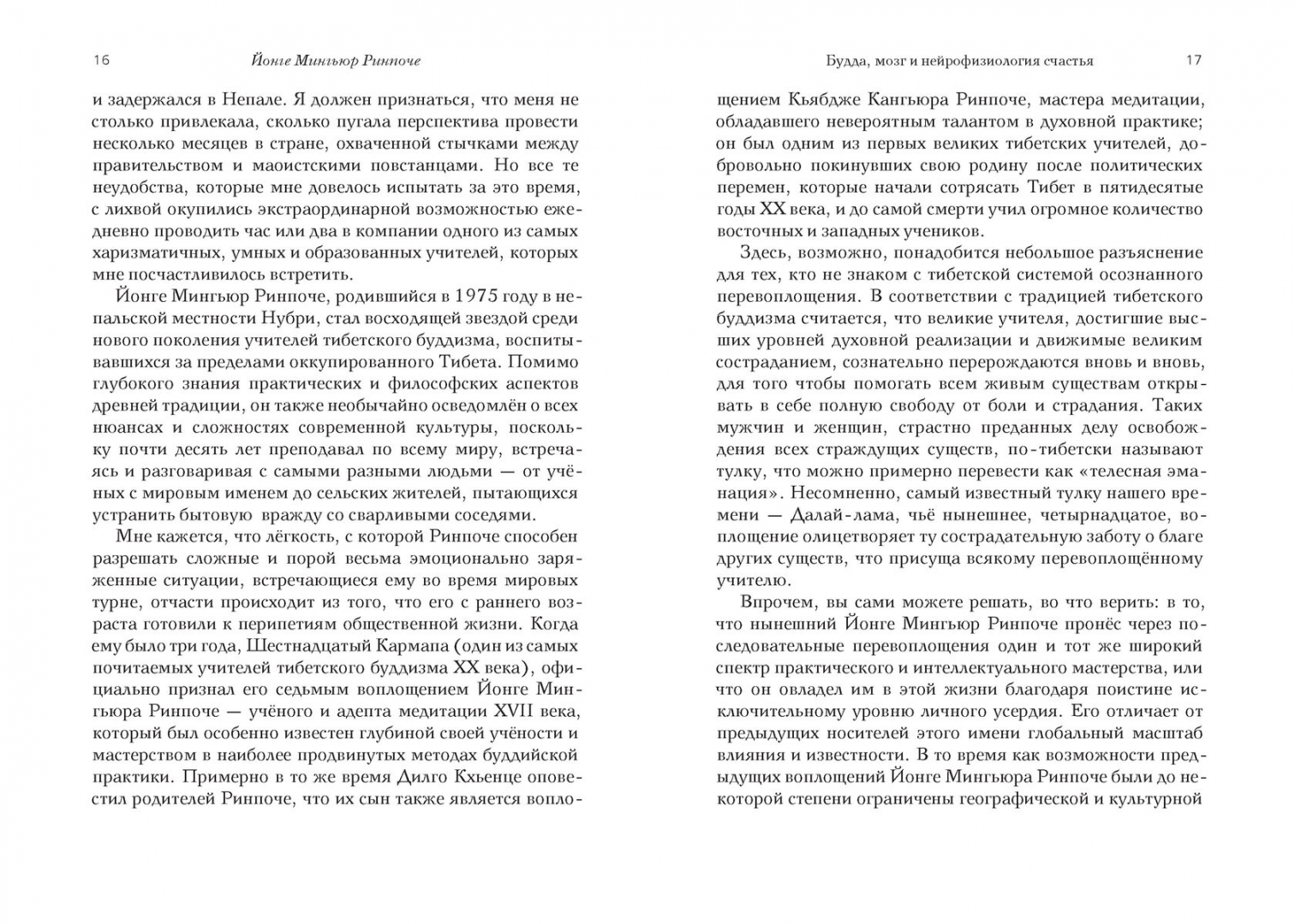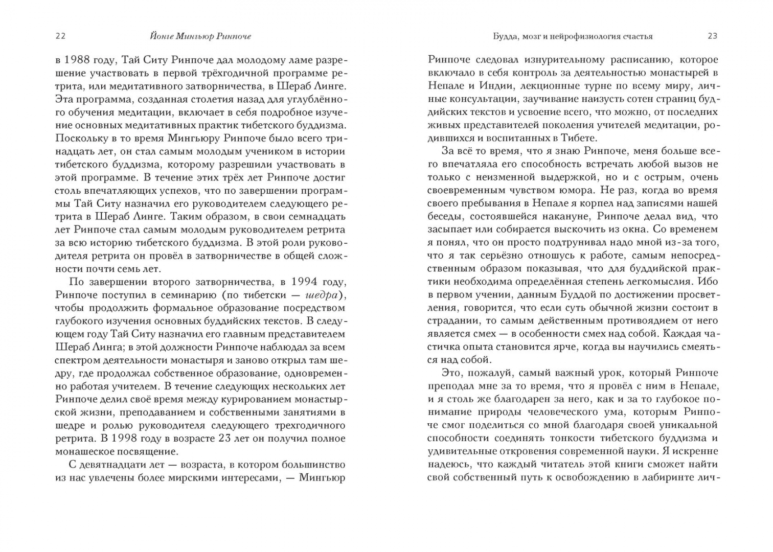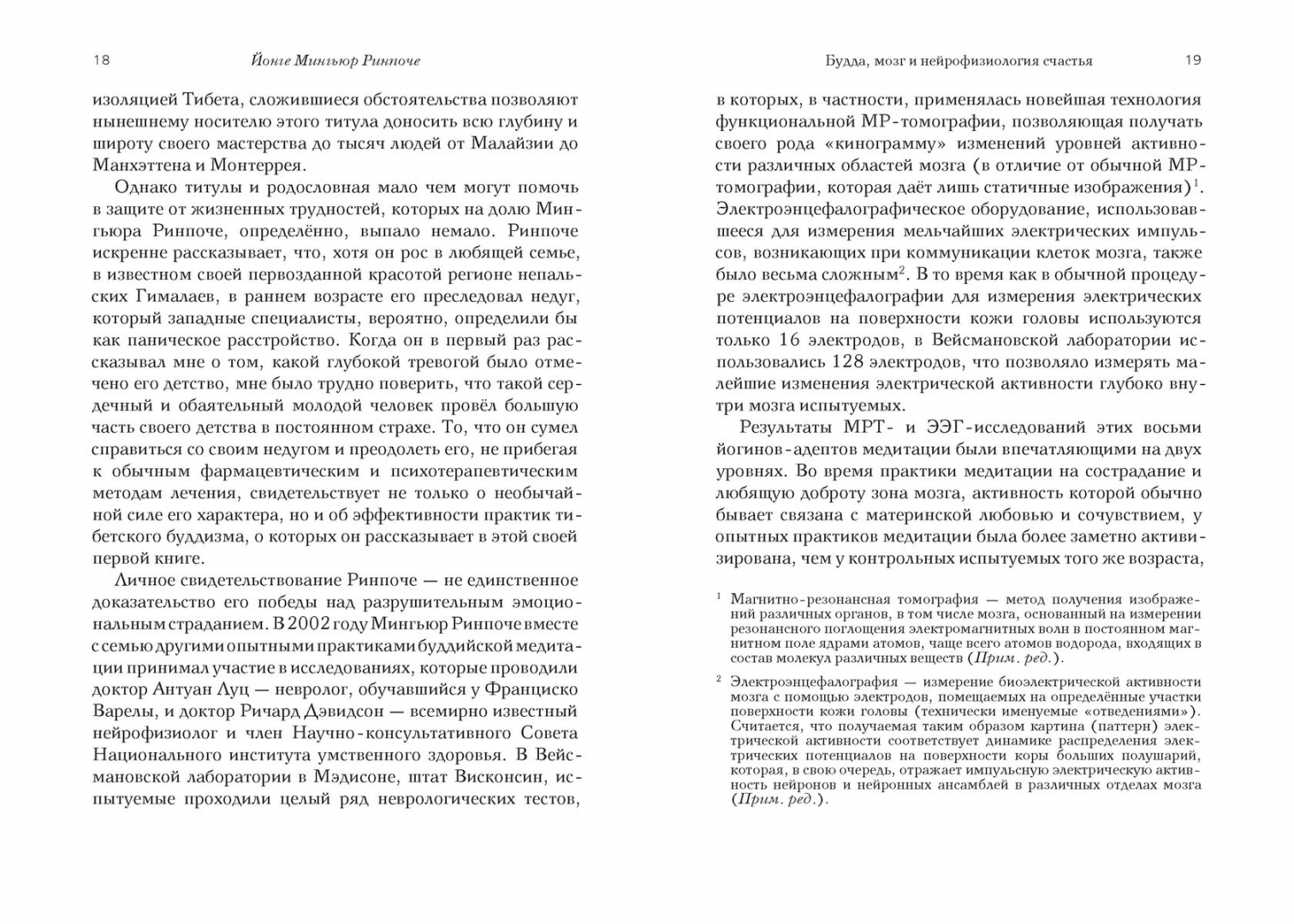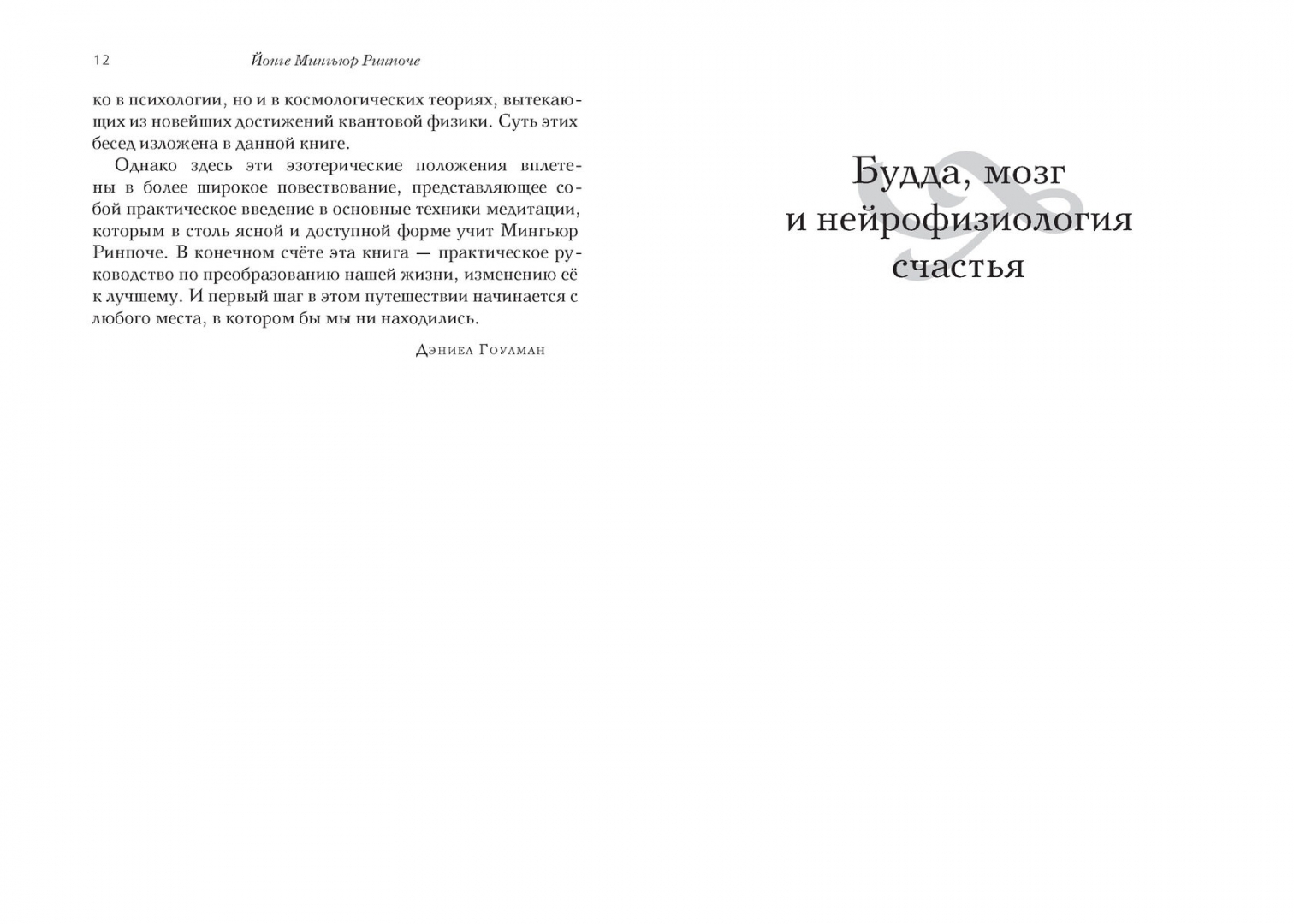 ОписаниеВ своей книге известный тибетский мастер Мингьюр Ринпоче, объединяя древнюю мудрость буддизма с последними открытиями западной науки, показывает, как вы можете жить более здоровой и счастливой жизнью при помощи медитации. Нам всем хочется знать, как испытывать больше радости и удовлетворения в повседневной жизни. Одни из нас в этом поиске обращаются к достижениям современной науки, медицине, исследованиям роли гормонов, сканированию мозга, тогда как другие выбирают религию и духовную практику. Но разве эти два подхода действительно являются взаимоисключающими?Недавнее исследование воздействия медитации на человеческий мозг показало, что во время сеанса медитации у основного испытуемого нейронная активность в зоне мозга, связанной с ощущением счастья, увеличивалась на 700%. Этим испытуемым был всемирно известный буддийский лама и монах Йонге Мингьюр Ринпоче, лично выбранный Е.С. Далай-ламой для участия в медицинских исследованиях эффектов медитации в лаборатории нейрофизиологии и функционирования мозга Университета Висконсина. Позже издания Time и National Geographic окрестили Ринпоче «самым счастливым человеком на земле».Мингьюр Ринпоче в присущей ему живой, непосредственной и одновременно поучительной манере знакомит нас с поистине революционными медитативными техниками, способными вызвать положительные перемены в наших умах и телах, изменив к лучшему нашу жизнь. Он также предлагает научное объяснение того, почему медитация способна привести нас к достижению глубокой внутренней умиротворённости и непреходящего счастья полного просветления.«В этой книге заключена подлинная мудрость. Ясная и свежая… Обязательно прочтите её!». — Ричард ГирСвернутьВ своей книге известный тибетский мастер Мингьюр Ринпоче, объединяя древнюю мудрость буддизма с последними открытиями западной науки, показывает, как вы можете жить более здоровой и счастливой жизнью при помощи медитации. Нам всем хочется знать, как испытывать больше радости и удовлетворения в повседневной жизни. Одни из нас в этом поиске обращаются к достижениям современной науки, медицине, исследованиям роли гормонов, сканированию мозга, тогда как другие выбирают религию и духовную практику. Но разве эти два подхода действительно являются взаимоисключающими?Недавнее исследование воздействия медитации на человеческий мозг показало, что во время сеанса медитации у основного испытуемого нейронная активность в зоне мозга, связанной с ощущением счастья, увеличивалась на 700%. Этим испытуемым был всемирно известный буддийский лама и монах Йонге Мингьюр Ринпоче, лично выбранный Е.С. Далай-ламой для участия в медицинских исследованиях эффектов медитации в лаборатории нейрофизиологии и функционирования мозга Университета Висконсина. Позже издания Time и National Geographic окрестили Ринпоче «самым счастливым человеком на земле».Мингьюр Ринпоче в присущей ему живой, непосредственной и одновременно поучительной манере знакомит нас с поистине революционными медитативными техниками, способными вызвать положительные перемены в наших умах и телах, изменив к лучшему нашу жизнь. Он также предлагает научное объяснение того, почему медитация способна привести нас к достижению глубокой внутренней умиротворённости и непреходящего счастья полного просветления.«В этой книге 