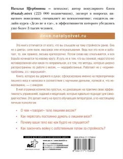 ОписаниеЭта книга отличается от всего, что вы слышали на тему стройности ранее. Она не о диетах, силе воли, массажах или иглоукалывании. Ведь все это если и работает, то, как правило, весьма краткосрочно. Потом снова вес откатывается, и вся борьба начинается по новому кругу. И суть не в том, что вы ленивая, недостаточно мотивированная или какая-то неправильная, а в том, что методы, которые широко распространены по работе с весом, — недоработанные. Работают не с "корнем" проблемы, а с "верхушкой".Книга, которую вы держите в руках, сфокусирована именно на первопричинах лишнего веса и написана в соответствии с научными данными, логикой и, что немаловажно, — с юмором.В ней огромное количество простых, но доказавших на практике свою эффективность упражнений, заданий и медитаций, которые идеально подходят для самодиагностики. Это делает книгу не просто обучающей литературой, а по-настоящему личным психологом.О чем "говорит" тело лишним весом?Как перестать постоянно думать о лишнем весе?Почему ваше тело вас как будто не слушается?Как закончить войну с собственным телом за стройность?Наталья Щербинина — психолог, автор популярного блога @nataly.otvet (225 000 подписчиков), эксперт в вопросах пищевого поведения. Специалист по психосоматике,