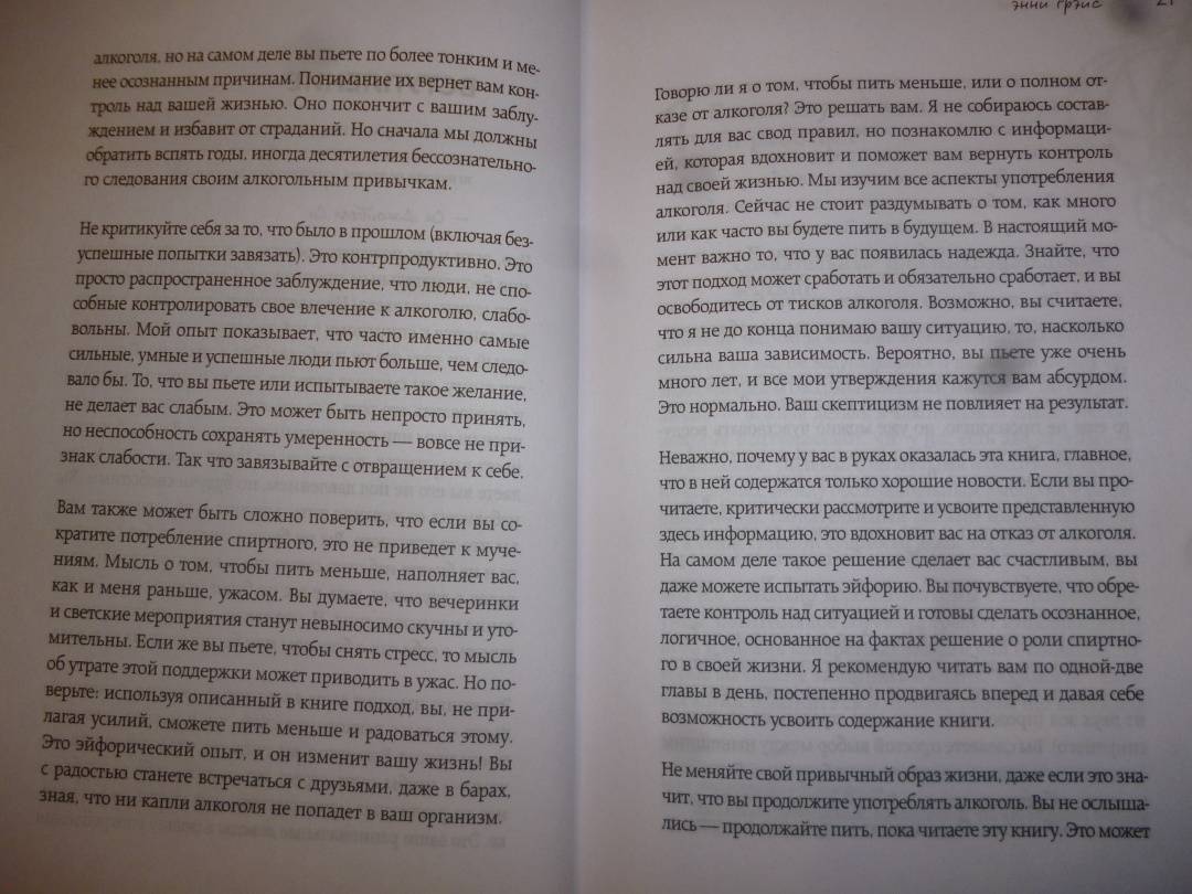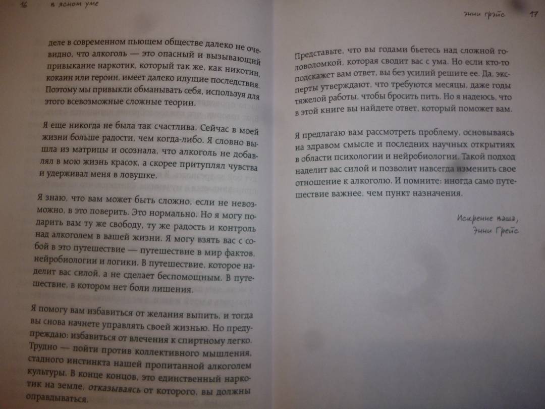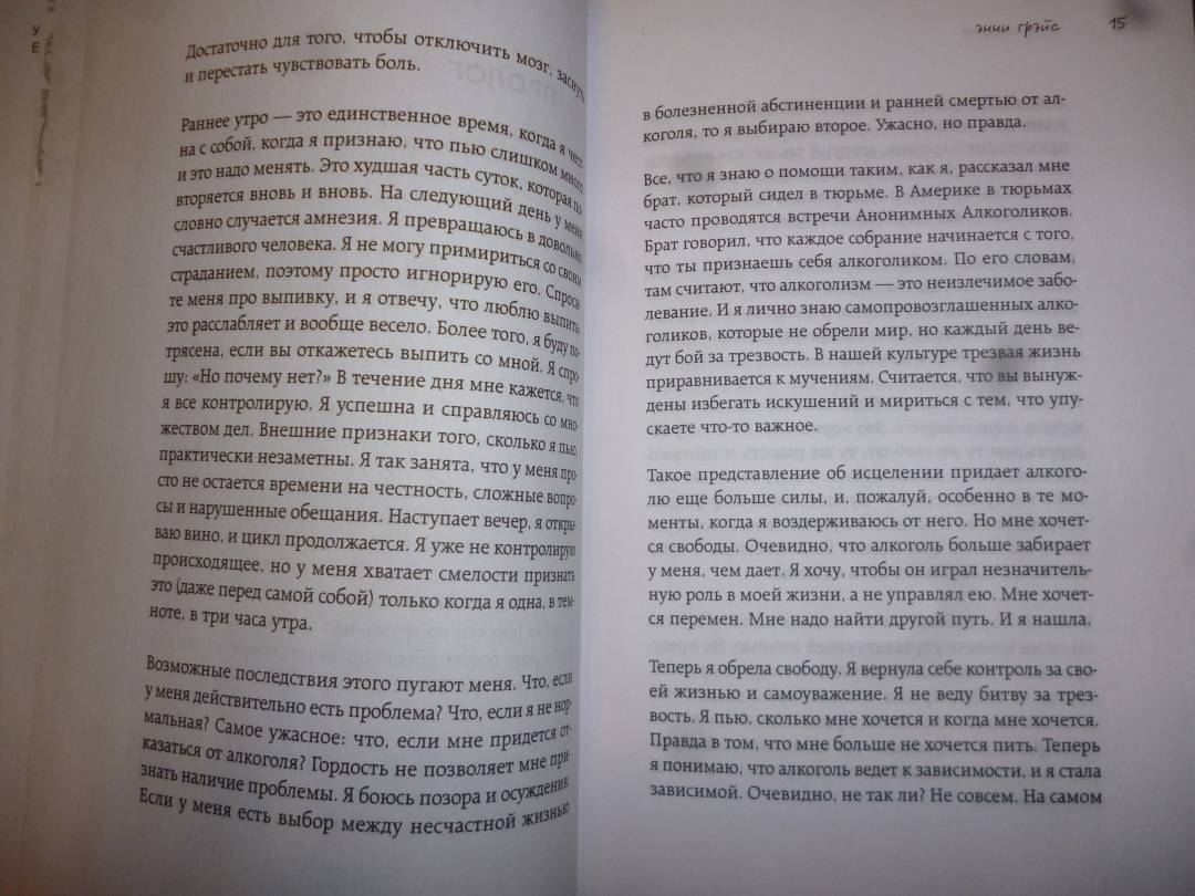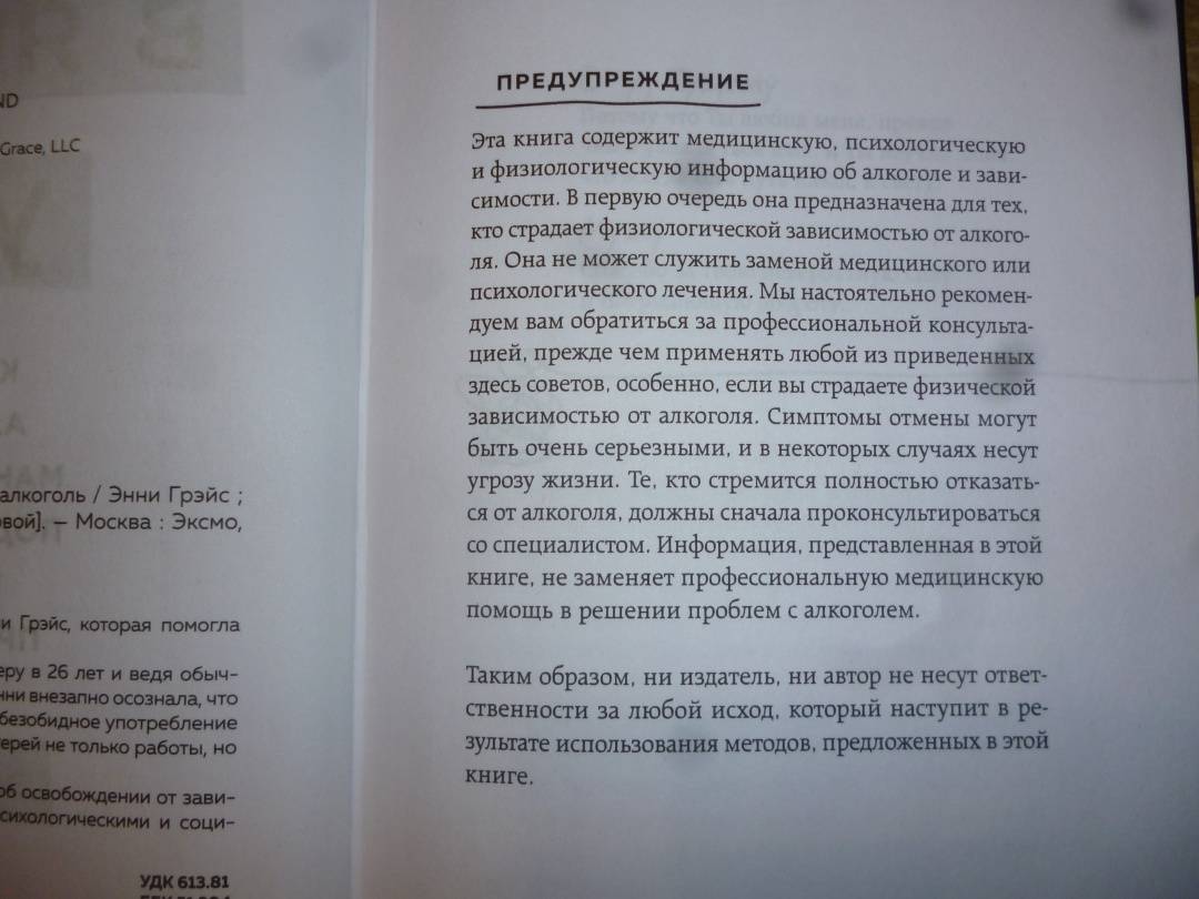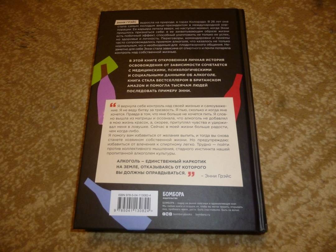 ОписаниеРеальная история англичанки Энни Грэйс, которая помогла тысячам людей вернуть себя.Сделав головокружительную карьеру в 26 лет и ведя обычный для топ-менеджера образ жизни, Энни внезапно осознала, что социально поощряемое и казалось бы, безобидное употребление алкоголя вот-вот обернется для нее потерей не только работы, но и собственной личности. В этой книге откровенный личный опыт освобождения от зависимости сочетается с медицинскими, психологическими и социальными данными об алкоголе.Реальная история англичанки Энни Грэйс, которая помогла тысячам людей вернуть себя.Сделав головокружительную карьеру в 26 лет и ведя обычный для топ-менеджера образ жизни, Энни внезапно осознала, что социально поощряемое и казалось бы, безобидное употребление алкоголя вот-вот обернется для нее потерей не только работы, но и собственной личности. В этой книге откровенный личный опыт освобождения от зависимости сочетается с медицинскими, психологическими и социальными данными об алкоголе.