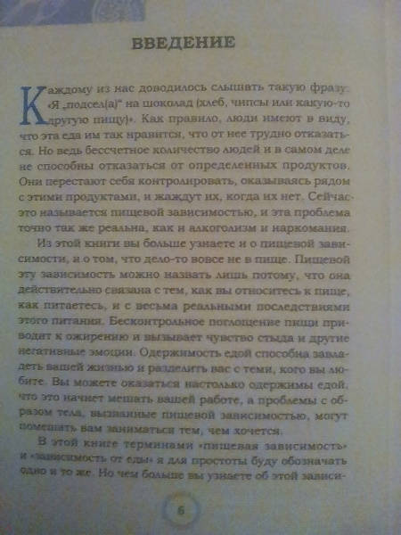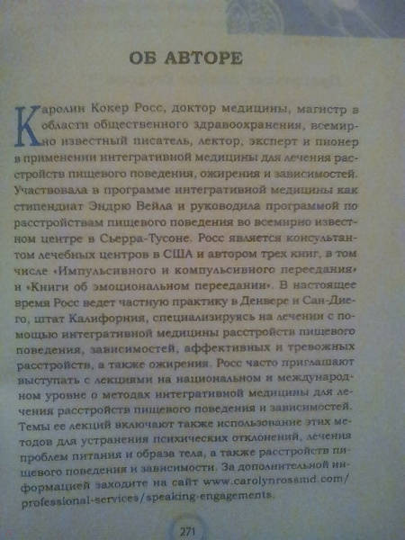 Описание"Без трех чашек кофе я даже не могу приступить к работе". "Опять с мужем поссорилась, у тебя ведь есть шоколадка?" "И почему в транспорте люди такие злые? Порадую себя булочкой". Звучит знакомо? Если подобное поведение превратилось в привычку, возможно, ваши отношения с едой уже не вполне здоровы.В своей книге Каролин Кокер Росс рассказывает о физиологических, неврологических и психологических причинах пищевой зависимости и предлагает эффективную программу, которая поможет вам обуздать нездоровую тягу к еде. Если пища стала для вас чуть ли не единственным источником удовольствия и обретения спокойствия, эта книга для вас. Благодаря ей вы убедитесь: то, чего вы действительно жаждете, - это душевное удовлетворение, и научитесь справляться со стрессом и эмоциями, не "заедая" их.Речь пойдет вовсе не о диетах. А о том, как познать свое подлинное "Я" и прочувствовать собственное тело, перестав осуждать, или даже ненавидеть, и научившись интуитивно понимать его истинные потребности. Каролин - доктор медицины и эксперт по работе с зависимостями - поможет вам начать работать с причинами, лежащими в основе вашей одержимости едой, и расскажет, как придерживаться принципов здорового пищевого поведения.Если у вас в руках оказалась эта книга, не спрашивайте себя, готовы ли вы к переменам. Конечно, готовы! Переверните страницу и начните перестраивать свою жизнь - постепенно, шаг за шагом, кусочек за кусочком.О чем книгаИз первой части вы узнаете, как формируется пищевая зависимость - ее биологические корни и предпосылки, возникшие из-за психологических травм детства и подросткового возраста. С помощью опросников сможете провести самотестирование и определите, есть ли у вас пищевая зависимость и какова ее природа - импульсивная или компульсивная. То есть склонны ли вы действовать быстро, ничего не планируя и не задумываясь о последствиях. Или вы осознаете вероятные последствия своих поступков, но вас все равно тянет повторять их, причем снова и снова. В зависимости от результатов тестирования вы сможете понять, какие методы помогут именно в вашем случае.Вторая часть рассказывает о пяти ступенях исцеления от пищевой зависимости - это план действий на пути к выздоровлению. Начав с отказа от поверхностного мышления и поведения, вы поймете, как справляться с бурлящими эмоциями, проникнетесь мудростью физических ощущений, создадите новые убеждения и обретете душевное удовлетворение.При выполнении упражнений ваш позитивный опыт будет расти, и постепенно вы увидите, что готовы делать все больше и больше, приближая освобождение от пищевой зависимости.Третья часть посвящена вашему расцвету в процессе выздоровления. Вы не просто перестанете зацикливаться на еде, а значительно улучшите качество своей жизни. Вы сможете правильно питать свои тело, ум и дух, ни в чем себя не ограничивая, ни от чего не завися и ничего не страшась.Почему книгу стоит прочитатьУ пищевой зависимости, как и у любой другой, есть последствия, которые влияют на вашу жизнь и жизнь ваших родных и друзей. Если у вас есть пищевая зависимость, вы более склонны к проблемам со сном и пищеварением, стрессу и усталости. У вас также возрастает риск повышения кровяного давления, уровня холестерина, развития диабета 2-го типа, болезней сердца и некоторых видов рака. Если у вас избыточн