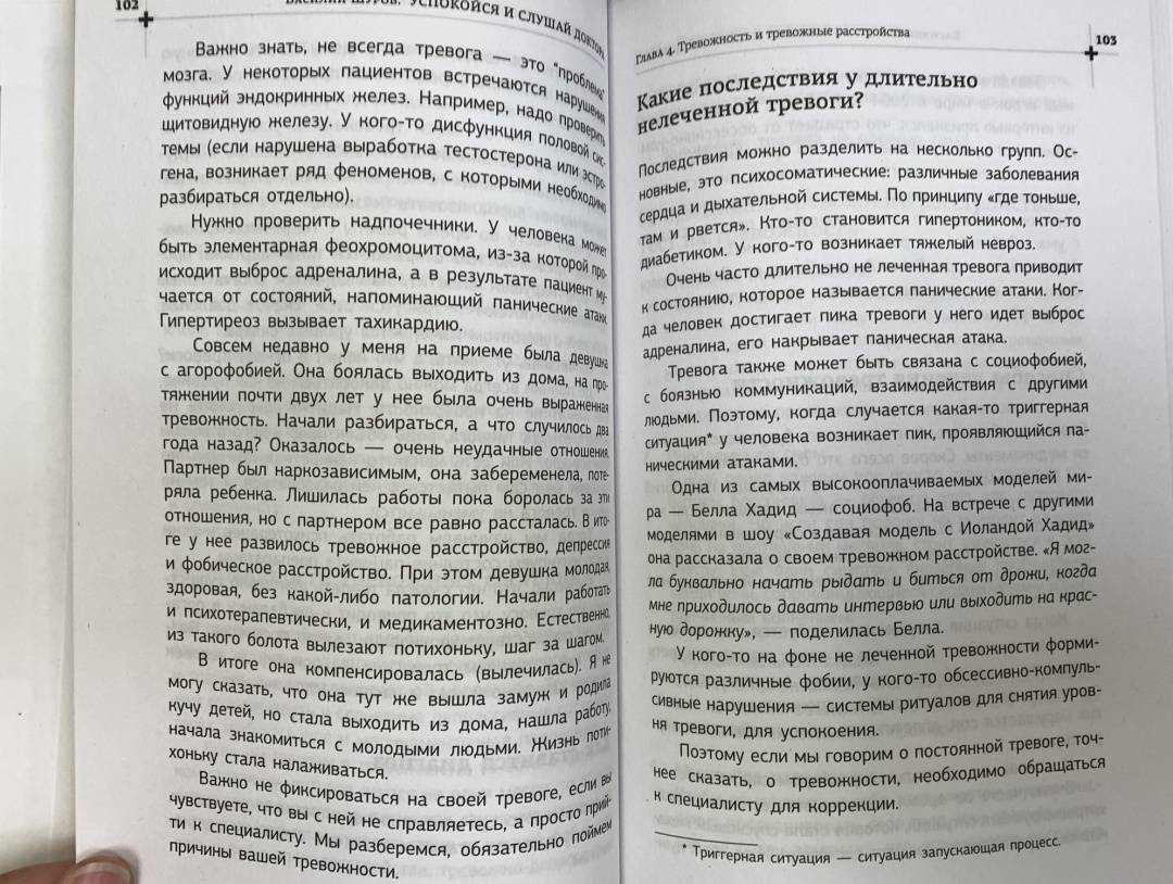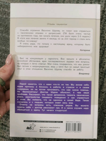 ОписаниеДоступно и по-человечески в книге рассказывается о состояниях, которые нужно отличать от «просто устала» и «просто настроение плохое». Мы поговорим о депрессиях, панических атаках, нарушениях пищевого поведения. Узнаем, что не только с нами случаются все эти несчастья. И великие мира сего страдали ОКР и булимией. Василий Шуров, главный нарколог клиники «Первый шаг», поделится с нами способами помочь себе и убедит пойти к врачу, когда у нас не хватает сил справиться самостоятельно. Не зря у него 500 тыс. подписчиков на ютуб канале, и он выступает в качестве эксперта на телевидении и в судебных процессах, является звездой в популярных шоу «Мужское и Женское» и «Пусть говорят».«Успокойся и слушай доктора» – книга, которая расскажет о самых распространенных психических расстройствах и поможет ответить на следующие вопросы: