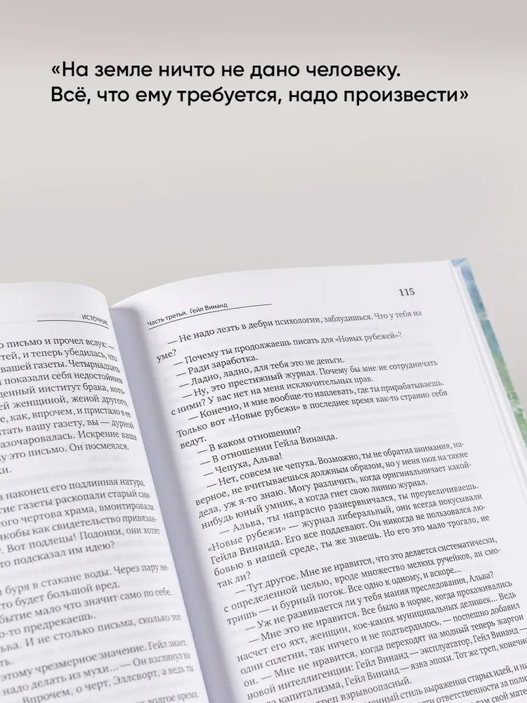 ОписаниеЦитата "В абсолютном смысле эгоист отнюдь не человек, жертвующий другими. Это человек, стоящий выше необходимости использовать других. Он обходится без них. Он не имеет к ним отношения ни в своих целях, ни в мотивах действий, ни в мышлении, ни в желаниях, ни в истоках своей энергии. Его нет для других людей, и он не просит, чтобы другие были для него. Это единственно возможная между людьми форма братства и взаимоуважения" Говард Рорк - главный герой книги "Источник" О чем книга Главные герои романа - архитектор Говард Рорк и журналистка Доминик Франкон - отстаивают свободу творческой личности в борьбе с обществом, где ценят "равные возможности" для всех. Вместе и поодиночке, друг с другом и друг против друга, но всегда - наперекор устоям толпы. Они - индивидуалисты, их миссия - творить и преобразовывать мир. Через перипетии судеб героев и увлекательный сюжет автор проводит главную идею книги - ЭГО является источником прогресса человечества. Почему книга достойна прочтения На протяжении нескольких десятилетий этот философский роман остается в списке бестселлеров мира и для миллионов читателей стал классикой. Сюжет увлекателен и непредсказуем, а философские идеи поданы отчетливо и просто. Прочтение "Источника" поможет в дальнейшем по-настоящему понять идеи романа "Атлант расправил плечи", а также философско-публицистических книг Айн Рэнд. Кто автор Айн Рэнд (1905-1982) - наша бывшая соотечественница, ставшая культовой американской писательницей. Автор четырех романов-бестселлеров и многочисленных статей. Создатель философской концепции, в основе которой лежит принцип свободы воли, главенство рациональности и "нравственность разумного эгоизма". Ключевые понятия Свобода, независимость личности, нравственность эгоизма.