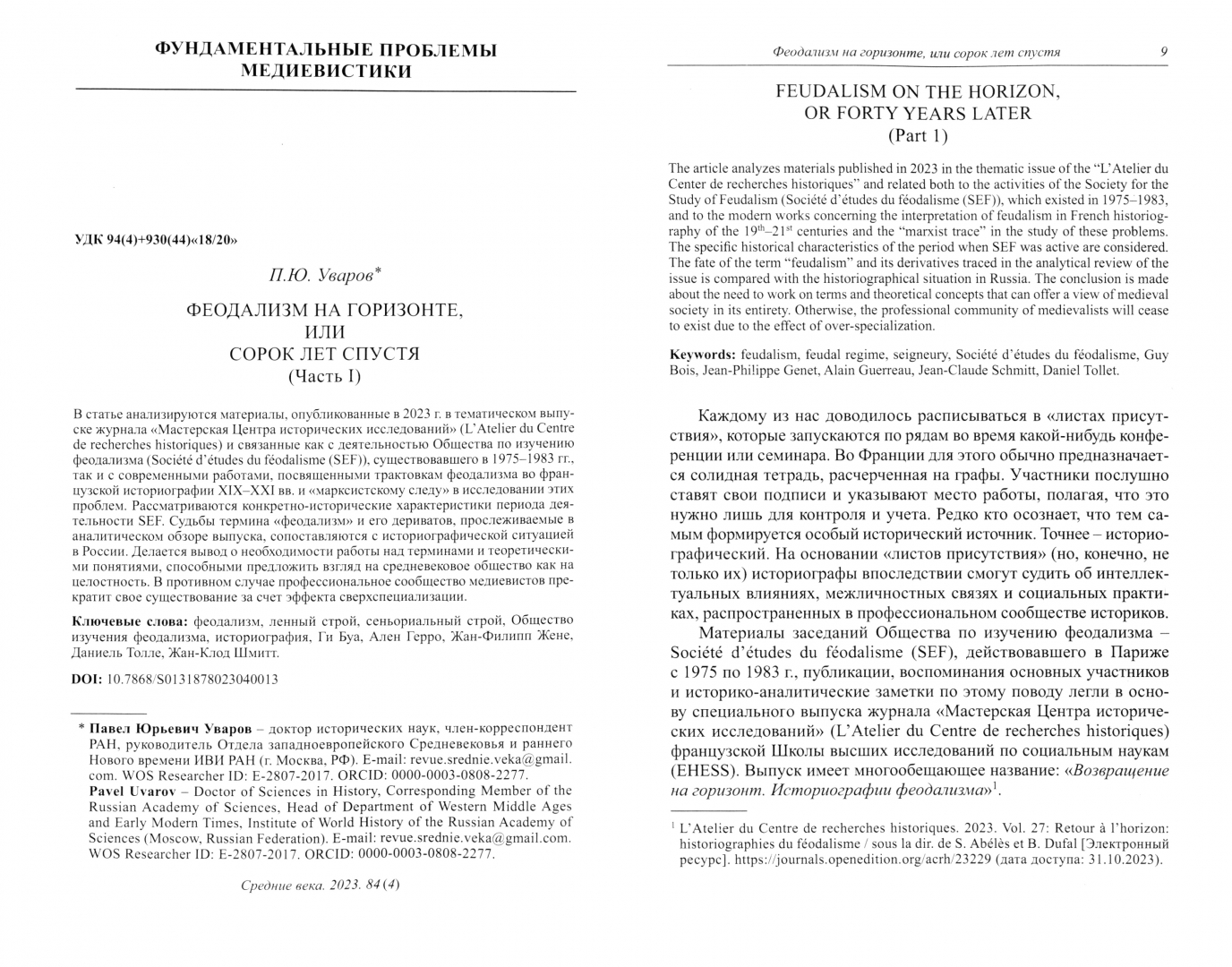 ОписаниеВыпуск открывается традиционной рубрикой, посвященной фундаментальным вопросам медиевистики: на этот раз речь идет о современном переосмыслении понятия «феодализм» и об актуальных аспектах восточноевропейской и русской истории. В рубрику «Епископы, монахи и порядок» включены исследования о взаимоотношениях светской и Духовной власти при Каролингах, а также о повседневной жизни монастыря. Выпуск продолжают статьи, исследующие различные аспекты осмысления и описания идентичности королей и аристократии, неизвестные или нестандартные поездки монарших особ. Большое место в выпуске отведено анализу и критике coвременных отечественных исследований.Для историков и широкого круга читателей.Выпуск открывается традиционной рубрикой, посвященной фундаментальным вопросам медиевистики: на этот раз речь идет о современном переосмыслении понятия «феодализм» и об актуальных аспектах восточноевропейской и русской истории. В рубрику «Епископы, монахи и порядок» включены исследования о взаимоотношениях светской и Духовной власти при Каролингах, а также о повседневной жизни монастыря. Выпуск продолжают статьи, исследующие различные аспекты осмысления и описания идентичности королей и аристократии, неизвестные или нестандартные поездки монарших особ. Большое место в выпуске отведено анализу и критике coвременных отечественных исследований.Для историков и широкого круга читателей.