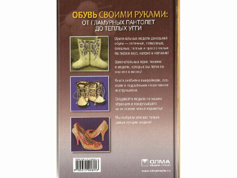 ОписаниеВ этой книге вы найдете множество оригинальных моделей домашней обуви и подробные инструкции по их изготовлению. Даже если вы не знакомы с тонкостями профессионального пошива обуви, с этой книгой для вас не составит труда сшить себе легкие летние шлепанцы или теплые угги, креативные слипперсы или элегантные балетки, изящные сандалии или трогательные детские тапочки. Воплотите предложенные идеи в жизнь и получите не только практическую пользу, но и массу удовольствия от творчества.В этой книге вы найдете множество оригинальных моделей домашней обуви и подробные инструкции по их изготовлению. Даже если вы не знакомы с тонкостями профессионального пошива обуви, с этой книгой для вас не составит труда сшить себе легкие летние шлепанцы или теплые угги, креативные слипперсы или элегантные балетки, изящные сандалии или трогательные детские тапочки. Воплотите предложенные идеи в жизнь и получите не только практическую пользу, но и массу удовольствия от творчества.