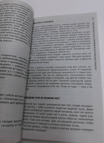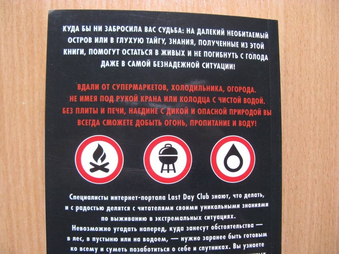 ОписаниеКуда бы ни забросила вас судьба: на далекий необитаемый остров или в глухую тайгу, знания, полученные из этой книги, помогут остаться в живых и не погибнуть с голода даже в самой безнадежной ситуации! Вдали от супермаркетов, холодильника, огорода… Не имея под рукой крана или колодца с чистой водой… Без плиты и печи, наедине с дикой и опасной природой вы всегда сможете добыть огонь, пропитание и воду!Специалисты интернет-портала "Last Day Club" знают, что делать, и с радостью делятся с читателями своими уникальными знаниями по выживанию в экстремальных ситуациях.Невозможно угадать наперед, куда занесут обстоятельства - в лес, в пустыню или на водоем, - нужно заранее быть готовым ко всему и суметь позаботиться о себе и спутниках. Вы узнаете множество рецептов заготовок и простейшие блюда из подручных продуктов, научитесь определять опасные и съедобные растения и грибы, ловить рыбу без удочки, находить воду в пустыне и разводить костер без спичек и зажигалки.Куда бы ни забросила вас судьба: на далекий необитаемый остров или в глухую тайгу, знания, полученные из этой книги, помогут остаться в живых и не погибнуть с голода даже в самой безнадежной ситуации! Вдали от супермаркетов, холодильника, огорода… Не имея под рукой крана или колодца с чистой водой… Без плиты и печи, наедине с дикой и опасной природой вы всегда сможете добыть огонь, пропитание и воду!Специалисты интернет-портала "Last Day Club" знают, что делать, и с радостью делятся с читателями своими уникальными знаниями по выживанию в экстремальных ситуациях.Невозможно угадать наперед, куда занесут обстоятельства - в лес, в пустыню или на водоем, - нужно заранее быть готовым ко всему и суметь позаботиться о себе и спутниках. Вы узнаете множество рецептов заготовок и простейшие блюда из подручных продуктов, научитесь определять опасные и съедобные растения и грибы, ловить рыбу без удочки, находить воду в пустыне и разводить костер без спичек и зажигалки.