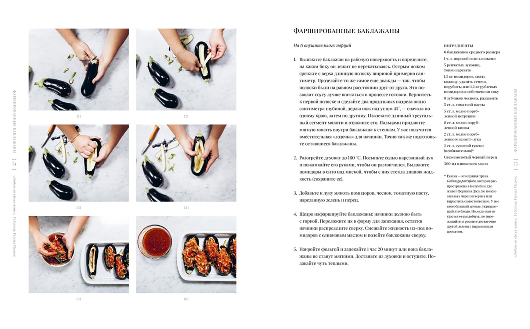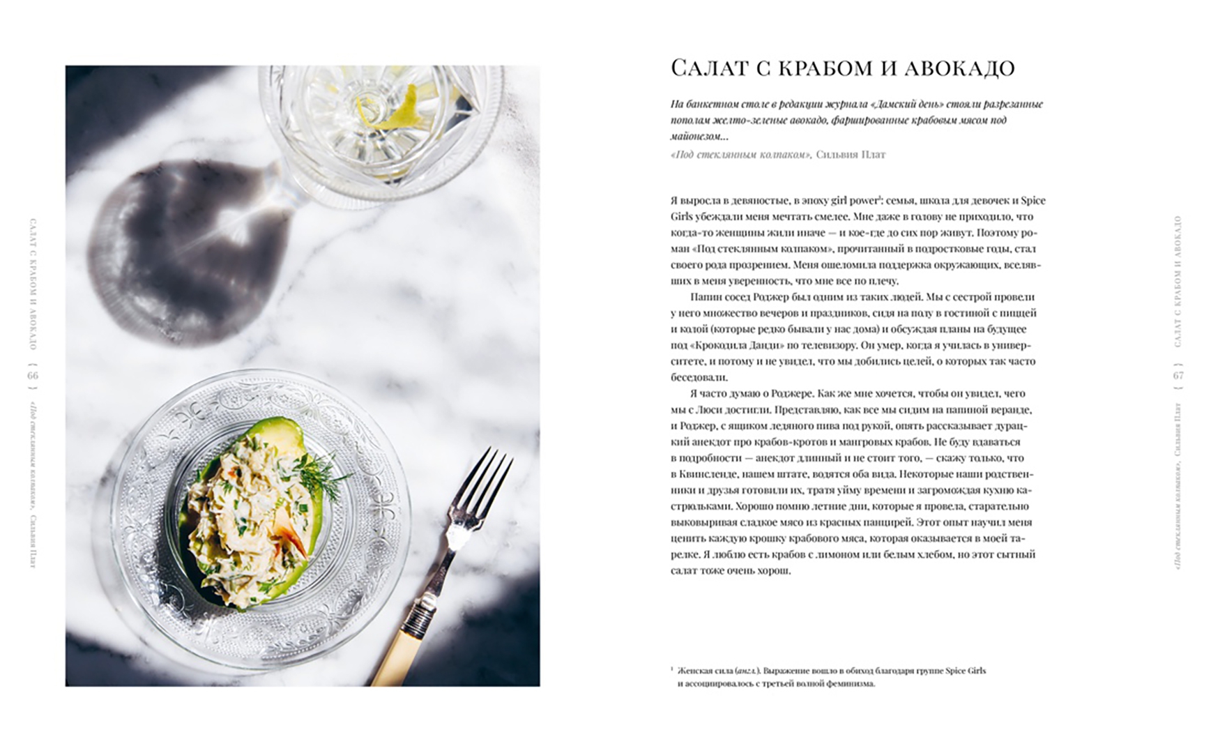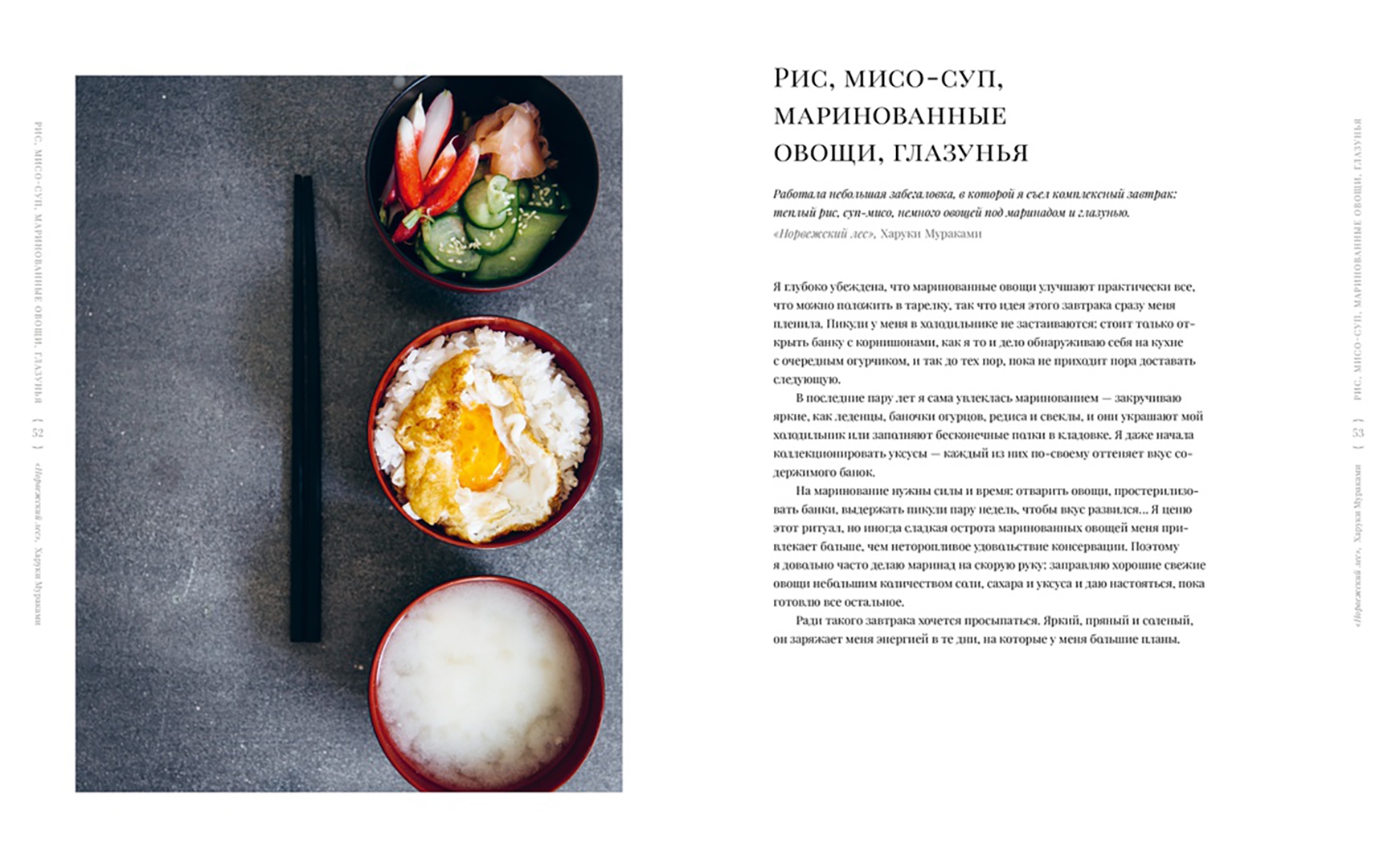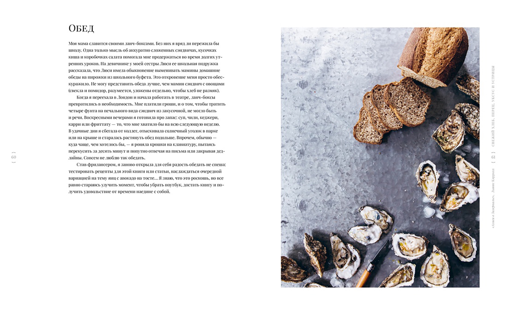 «Я черпаю вдохновение из разных источников: из смены времен года, из детства, проведенного в Австралии, из наших семейных ужинов, из путешествий, из кулинарных техник, которым научилась у друзей. Когда я переехала и начала готовить для себя, вдохновение стало находиться и в любимых книгах, на страницах которых живут самые значимые для меня воспоминания, связанные с едой. Мне захотелось поделиться своими любимыми описаниями еды в литературе, и так появилась эта книга. Я искренне надеюсь, что следующие страницы пробудят в вас детские воспоминания, помогут вам открыть для себя новые книги, перенесут в те страны, где вы мечтали побывать, и усадят за один стол с персонажами, с которыми вам хотелось бы пообщаться. Приятного чтения — и приятного аппетита!»