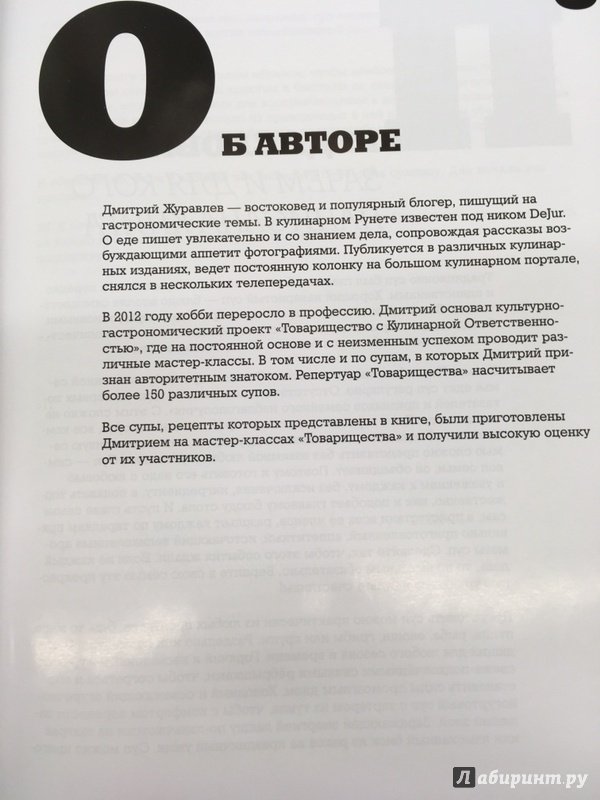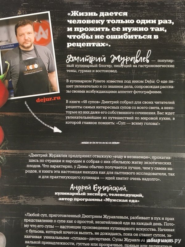 Описание"Жизнь дается человеку только один раз, и прожить ее нужно так, чтобы не ошибиться в рецептах".Дмитрий Журавлев - популярный кулинарный блогер, пишущий на гастрономические темы, гурман и востоковед. В кулинарном Рунете известен под ником DeJur. О еде пишет увлекательно и со знанием дела, сопровождая рассказы своими возбуждающими аппетит фотографиями.В книге "48 супов" Дмитрий собрал для своих читателей рецепты самых интересных супов со всего света, а некоторые из них даже его собственного сочинения. Вас ждет увлекательнейшее из путешествий по мировой кухне, в которой главное помнить: "Суп - всему голова!""Дмитрий Журавлев предпринял отважную "езду в незнаемое", прокатившись по странам и народам и собрав с них обильную жатву экзотических плодов. Что характерно, у Димы обычно получается лучше, чем у самих народов, и книга эта настоящая находка как для пытливого исследователя, так и для практикующего кулинара - идей хватит очень надолго". Андрей Бугайский, кулинарный эксперт, телеведущий, автор программы "Мужская еда""Любой суп, приготовленный Дмитрием Журавлевым, разбивает в пух и прах представление о супе как о простой, незатейливой еде на каждый день. Потому что его супы - настоящие произведения кулинарного искусства. Начиная с бульона, который хочется выпить, не дожидаясь, пока он станет супом, заканчивая уникальными "супами"-десертами. Супы Журавлева разной национальной принадлежности, густые или прозрачные, пряные или деликатные, брутальные или изящные, но неизменно гармоничные и вкусные. Неудивительно, что на мастер-классы по супам всегда аншлаг: все хотят разнообразия вкусов и надежных рецептов. В новой книге есть и то, и другое".Алена Спирина, телеведущая, автор кулинарных книг, кулинарная Школа "Хлеб и Еда"Свернуть"Жизнь дается человеку только один раз, и прожить ее нужно так, чтобы не ошибиться в рецептах".Дмитрий Журавлев - популярный кулинарный блогер, пишущий на гастрономические темы, гурман и востоковед. В кулинарном Рунете известен под ником DeJur. О еде пишет увлекательно и со знанием дела, сопровождая рассказы своими возбуждающими аппетит фотографиями.В книге "48 супов" Дмитрий собрал для своих читателей рецепты самых интересных супов со всего света, а некоторые из них даже его собственного сочинения. Вас ждет увлекательнейшее из путешествий по мировой кухне, в которой главное помнить: "Суп - всему голова!""Дмитрий Журавлев предпринял отважную "езду в незнаемое", прокатившись по странам и народам и собрав с них обильную жатву экзотических плодов. Что характерно, у Димы обычно получается лучше, чем у самих народов, и книга эта настоящая находка как для пытливого исследователя, так и для практикующего кулинара - идей хватит очень надолго". Андрей Бугайский, кулинарный эксперт, телеведущий, автор программы "Мужская еда""Любой суп, приготовленный Дмитрием Журавлевым, разбивает в пух и прах представление о супе как о простой, незатейливой еде на каждый день. Потому что его супы - настоящие произведения кулинарного искусства. Начиная с бульона, который хочется выпить, не дожидаясь, пока он станет супом, заканчивая уникальными "супами"-десертами. Супы Журавлева разной национальной принадлежности, густые или прозрачные, пряные или деликатные, брутальные или изящные, но неизменно гармоничные и вкусные. Неудивительно, что на м