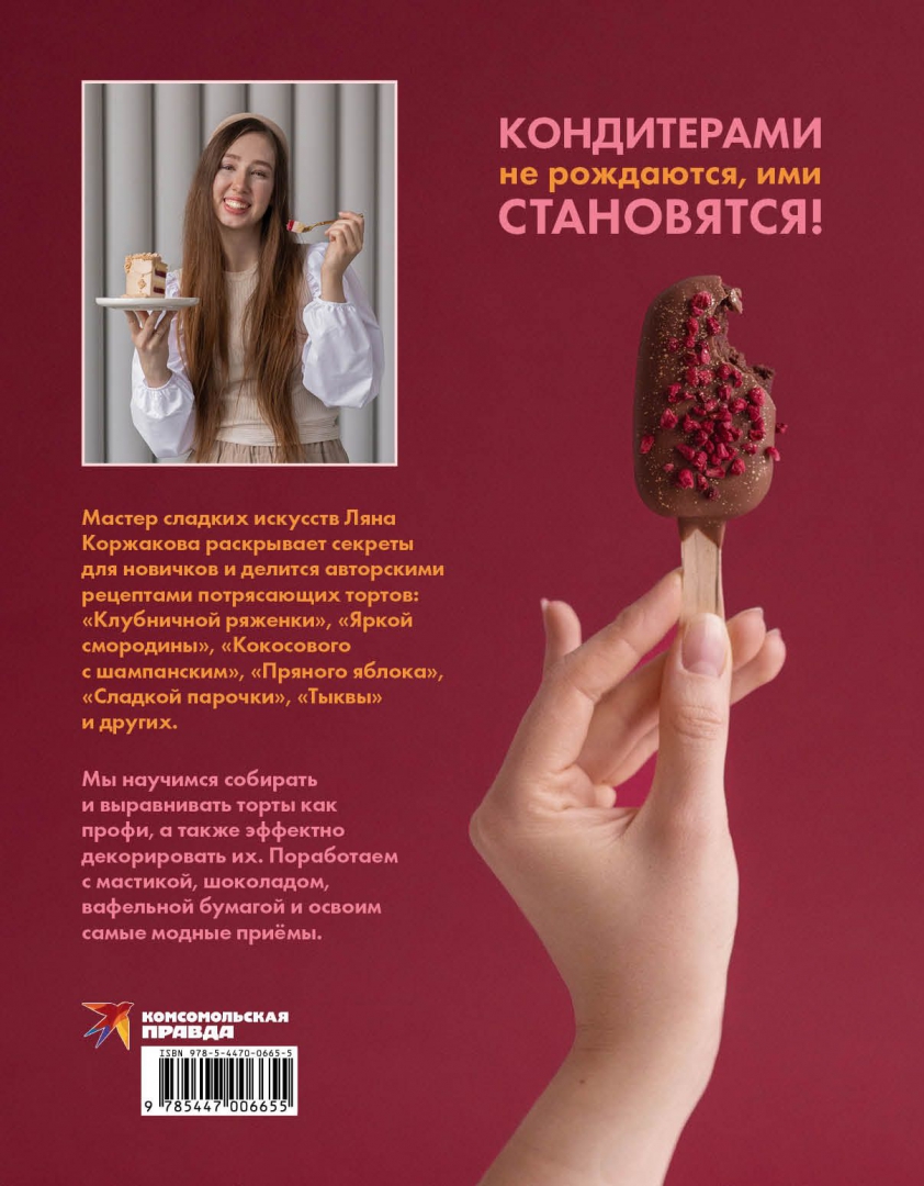 ОписаниеМастер сладких искусств Ляна Коржакова раскрывает секреты для новичков и делится авторскими рецептами потрясающих тортов: "Клубничной ряженки", "Сочной смородины", "Кокосового с шампанским", "Пряного яблока", "Сладкой парочки", "Тыквы" и других. Мы научимся собирать и выравнивать торты как профи, а также эффектно декорировать их. Поработаем с мастикой, шоколадом, вафельной бумагой и освоим самые модные приёмы. Ещё больше наглядной полезной информации можно получить по куар-кодам на страницах книги - видео-уроки от автора. Кондитерами не рождаются, ими становятся!Мастер сладких искусств Ляна Коржакова раскрывает секреты для новичков и делится авторскими рецептами потрясающих тортов: "Клубничной ряженки", "Сочной смородины", "Кокосового с шампанским", "Пряного яблока", "Сладкой парочки", "Тыквы" и других. Мы научимся собирать и выравнивать торты как профи, а также эффектно декорировать их. Поработаем с мастикой, шоколадом, вафельной бумагой и освоим самые модные приёмы. Ещё больше наглядной полезной информации можно получить по куар-кодам на страницах книги - видео-уроки от автора. Кондитерами не рождаются, ими становятся!