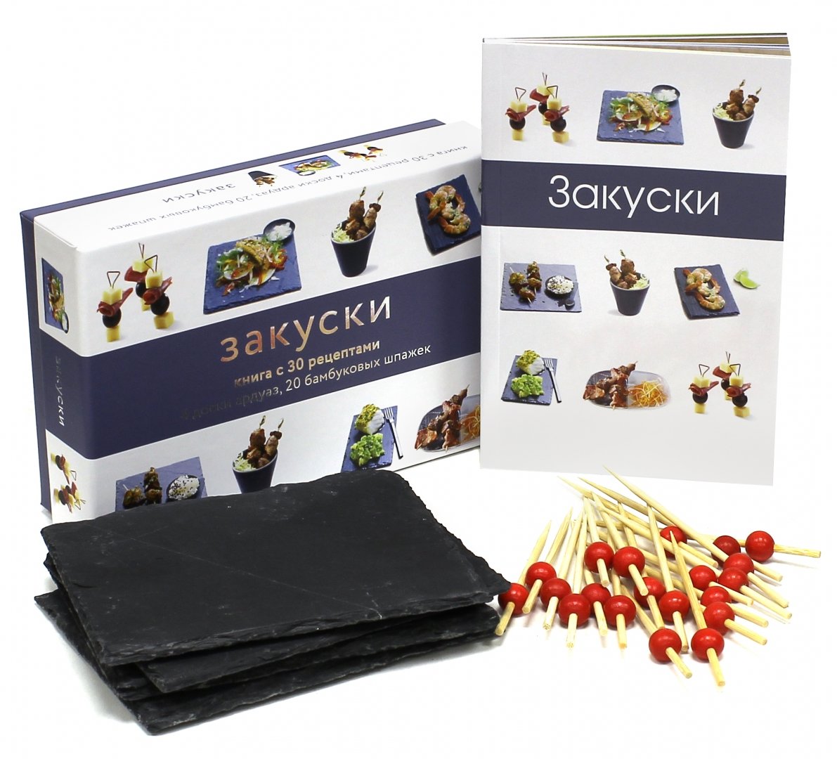 ОписаниеЗакуски с креветками и лаймом, с фуа-гра и медом, в итальянском и китайском стиле, шашлычки якитори и цукуне - блюда из простых продуктов или изысканных деликатесов, на любой вкус. Мы предлагаем подать их не на привычных тарелках, а на ардуаз - досках из природного сланца. Такая изящная сервировка никого не оставит равнодушным.Прилагающиеся к книге рецептов доски ардуаз и бамбуковые шпажки предназначены для приготовления пищевых продуктов. Перед первым употреблением доски ардуаз необходимо тщательно вымыть. Доски и шпажки не являются игрушками и не предназначены для использования детьми без присмотра взрослых.В наборе: 4 доски ардуаз, 20 бамбуковых шпажек, книга с рецептами.Закуски с креветками и лаймом, с фуа-гра и медом, в итальянском и китайском стиле, шашлычки якитори и цукуне - блюда из простых продуктов или изысканных деликатесов, на любой вкус. Мы предлагаем подать их не на привычных тарелках, а на ардуаз - досках из природного сланца. Такая изящная сервировка никого не оставит равнодушным.Прилагающиеся к книге рецептов доски ардуаз и бамбуковые шпажки предназначены для приготовления пищевых продуктов. Перед первым употреблением доски ардуаз необходимо тщательно вымыть. Доски и шпажки не являются игрушками и не предназначены для использования детьми без присмотра взрослых.В наборе: 4 доски ардуаз, 20 бамбуковых шпажек, книга с рецептами.