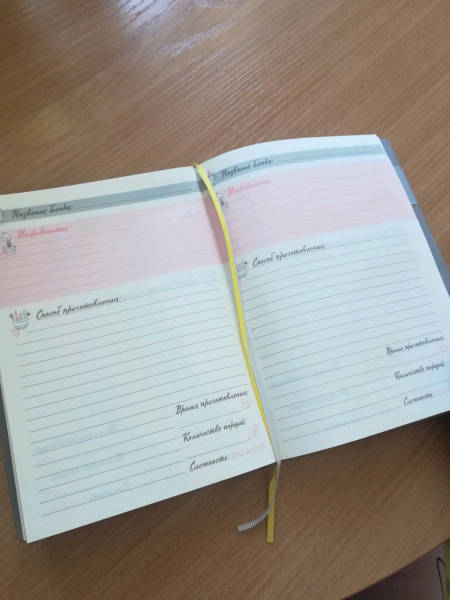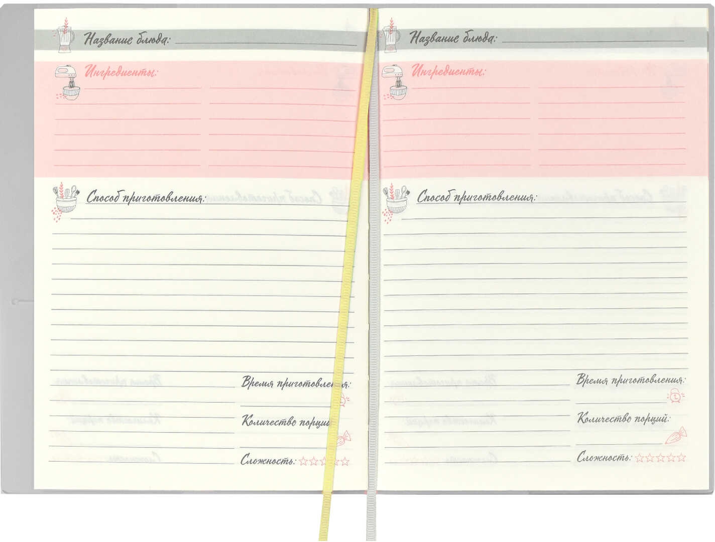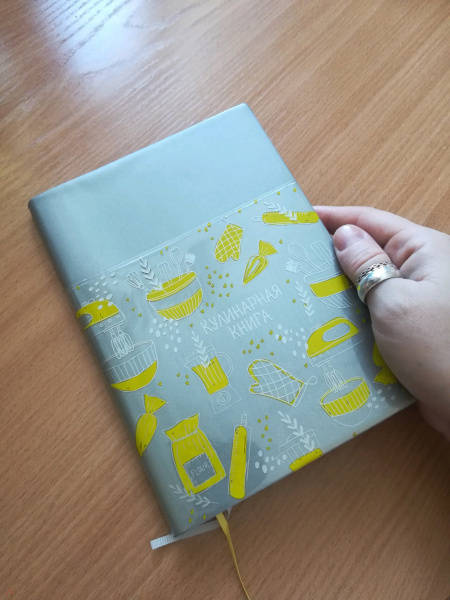 ОписаниеКнига для записи кулинарных рецептов, формат А6+(135x188 мм), 96 листов, мягкий переплёт, съёмная обложка ПВХ, тиснение фольгой, шелкография в одну краску, карман на лицевой части обложки, ниткошвейный блок, белый офсет, линия, печать в две краски, 2 ляссе, печать форзаца в одну краску. Индивидуальный ПЭТ-пакет.Книга для записи кулинарных рецептов, формат А6+(135x188 мм), 96 листов, мягкий переплёт, съёмная обложка ПВХ, тиснение фольгой, шелкография в одну краску, карман на лицевой части обложки, ниткошвейный блок, белый офсет, линия, печать в две краски, 2 ляссе, печать форзаца в одну краску. Индивидуальный ПЭТ-пакет.