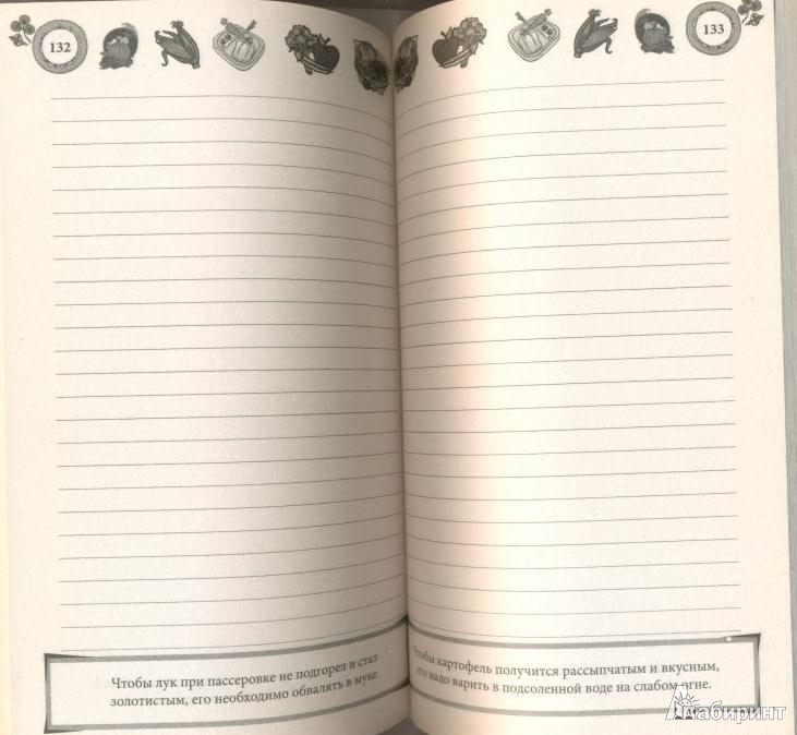 ОписаниеНадоело рыться в куче книг в поисках понравившегося рецепта, перебирать пожелтевшие вырезки и листочки с записанными рецептами бабушек или подруг? Тогда эта книга - просто находка для вас!Вдобавок в конце ее собрана необходимая каждой хозяйке информация о калорийности, сроках приготовления и хранения разных продуктов, а также правила сервировки стола, сравнительная таблица меры и веса основных продуктов, словарик-проводник по пряностям и приправам, полезная информация о безопасных и вредных пищевых добавках.Записывайте свои любимые рецепты, читайте советы опытных кулинаров и готовьте с удовольствием!Составитель Скляр Валентина.Надоело рыться в куче книг в поисках понравившегося рецепта, перебирать пожелтевшие вырезки и листочки с записанными рецептами бабушек или подруг? Тогда эта книга - просто находка для вас!Вдобавок в конце ее собрана необходимая каждой хозяйке информация о калорийности, сроках приготовления и хранения разных продуктов, а также правила сервировки стола, сравнительная таблица меры и веса основных продуктов, словарик-проводник по пряностям и приправам, полезная информация о безопасных и вредных пищевых добавках.Записывайте свои любимые рецепты, читайте советы опытных кулинаров и готовьте с удовольствием!Составитель Скляр Валентина.