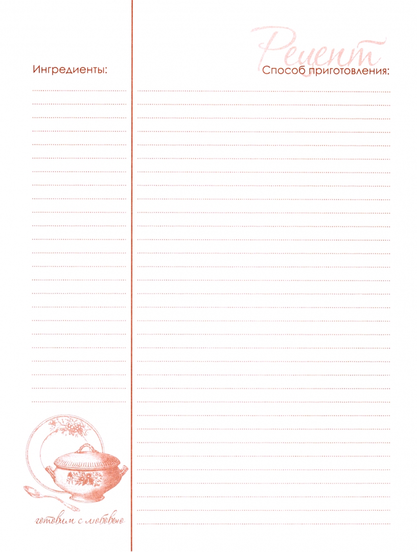 ОписаниеКнига для записи кулинарных рецептов поможет хозяйкам составить поваренную энциклопедию своей семьи, в которой можно хранить весь кулинарный опыт, заполняя страницы фирменными рецептами. Книга содержит полезную информацию о мере и массе продуктов, основные правила сервировки стола и этикета приема пищи. Блюда распределяются по категориям: салаты, супы, горячие блюда, десерты, выпечка, консервирование. Каждый раздел начинается с цветного вкладыша, на котором изображено вкусное блюдо и приложен рецепт его приготовления. Внутренний блок поделен на два поля: для списка ингредиентов и способа приготовления блюда.Формат: А5Количество листов: 96Внутренний блок: белый офсет, 6 цветных разделителейПлотность бумаги: 80 гр/м2Тип скрепления: книжная прошивкаТип обложки: твердый переплетКнига для записи кулинарных рецептов поможет хозяйкам составить поваренную энциклопедию своей семьи, в которой можно хранить весь кулинарный опыт, заполняя страницы фирменными рецептами. Книга содержит полезную информацию о мере и массе продуктов, основные правила сервировки стола и этикета приема пищи. Блюда распределяются по категориям: салаты, супы, горячие блюда, десерты, выпечка, консервирование. Каждый раздел начинается с цветного вкладыша, на котором изображено вкусное блюдо и приложен рецепт его приготовления. Внутренний блок поделен на два поля: для списка ингредиентов и способа приготовления блюда.Формат: А5Количество листов: 96Внутренний блок: белый офсет, 6 цветных разделителейПлотность бумаги: 80 гр/м2Тип скрепления: книжная прошивкаТип обложки: твердый переплет