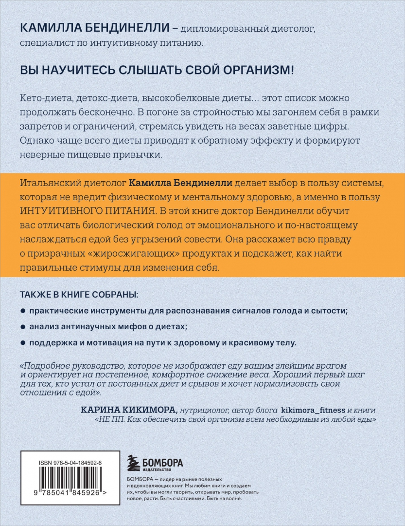 Описание"Почему я не могу устоять перед этой шоколадкой? Она так и манит меня!", "Снова объелся на ночь! Почему я такой безвольный?", "Сегодня был такой сложный день, кажется, пора поднять себе настроение мороженым". Знакомые фразы? Часто ли вы корите себя за лишний кусочек пиццы, съеденный за ужином, и сокрушаетесь о том, что в этом году снова не успели подготовиться к лету? Итальянский диетолог Камилла Бендинелли расскажет вам о том, как разорвать порочный круг диет и перестать загонять себя в рамки. Она уверена, достаточно лишь научиться слушать и слышать свой организм, чтобы прийти в форму и, главное, удержать ее надолго. Без боязни сорваться и бесконечных запретов. В этой книге автор: - расскажет, почему нельзя демонизировать углеводы; - развеет все мифы о белках животного и растительного происхождения; - научит вас определять, какой вес считается нормальным и какие критерии мы должны учитывать при расчете ИМТ; - разберет частые ошибки при похудении; - предложит работающие тактики снижения веса без "запретных" продуктов и недоедания; - обучит вас тому, как отличить реальный голод от эмоционального и прекратить импульсивные приемы пищи.Свернуть"Почему я не могу устоять перед этой шоколадкой? Она так и манит меня!", "Снова объелся на ночь! Почему я такой безвольный?", "Сегодня был такой сложный день, кажется, пора поднять себе настроение мороженым". Знакомые фразы? Часто ли вы корите себя за лишний кусочек пиццы, съеденный за ужином, и сокрушаетесь о том, что в этом году снова не успели подготовиться к лету? Итальянский диетолог Камилла Бендинелли расскажет вам о том, как разорвать порочный круг диет и перестать загонять себя в рамки. Она уверена, достаточно лишь научиться слушать и слышать свой организм, чтобы прийти в форму и, главное, удержать ее надолго. Без боязни сорваться и бесконечных запретов. В этой книге автор: - расскажет, почему нельзя демонизировать углеводы; - развеет все мифы о белках животного и растительного происхождения; - научит вас определять, какой вес считается нормальным и какие критерии мы должны учитывать при расчете ИМТ; - разберет частые ошибки при похудении; - предложит работающие тактики снижения веса без "запретных" продуктов и недоедания; - обучит вас тому, как отличить реальный голод от эмоционального и прекратить импульсивные приемы пищи.СвернутьСвернуть