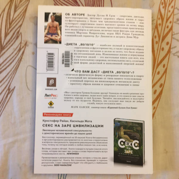 Описание"С наслаждением проедая свой путь к идеальному здоровью, оптимальному весу и неисчерпаемой жизненной энергии"."Диета 80/10/10" доктора Дугласа Грэма - наиболее полный и компетентный труд по сыроедению и фрукторианству, а также здоровому образу жизни и здоровому питанию в целом из всего, что было издано в мире на сегодняшний день. Изменившая жизни и вернувшая здоровье тысячам людей - это настольная книга для всех, кто стремится к идеальному здоровью, оптимальному весу, отличной спортивной форме, радостной и наполненной энергией жизни, для тех, кто устал от полумер и стремится только к самому лучшему результату!Обновлённое издание включает специальную главу (В США выходила в виде брошюры под названием "Grain Damage"), посвящённую вредному воздействию столь привычного для нас продукта, как зерновые. В статье "О "пользе" зерновых" доктор Грэм исследует роль злаков в жизни современного человека. Рассматривая эту проблему с позиции здравого смысла и очевидных фактов, он раскрывает все преимущества беззерновой диеты.На русский язык брошюра переведена впервые!"По моему глубокому убеждению, из всех существующих сегодня диет наиболее здоровая - это так называемая "Диета 80/10/10". Стремитесь получать 80% своих калорий из углеводов, 10% - из жиров и 10% - из белков". - Колин Т. Кэмпбелл, автор "Китайского исследования"Что вам даст "Диета 80/10/10"? - отличную физическую форму и рекордные показатели в спорте- идеальный вес независимо от типа вашего телосложения- крепкое здоровье и непревзойдённое самочувствие- успешный переход на низкожировую веганскую диету- простоту образа жизни- здоровое отношение к пище- завидную витальность и неисчерпаемую жизненную энергию"Если вы стремитесь выглядеть и чувствовать себя более энергичными, здоровыми и счастливыми, знайте, что вы, вне всякого сомнения, получите огромную пользу от здравых и проверенных на личном опыте идей, предлагаемых Дугласом Грэмом в этой программе". - Мэрилин Даймонд, соавтор книги "Что есть, когда есть, сколько есть""Мы с доктором Грэмом большие друзья. Однажды он нашёл решение проблемы в моём здоровье, задав всего один вопрос, и это помогло мне спасти здоровье, карьеру и своё будущее. Доктор Грэм - мудрый и проницательный прогрессивный мыслитель. Читайте, наслаждайтесь и получайте пользу от его мудрости. Надеюсь, она сослужит вам такую же добрую службу, какую сослужила мне". - Марк Хансен, соавтор книги "Куриный бульон для души".2-е издание, дополненное.Свернуть"С наслаждением проедая свой путь к идеальному здоровью, оптимальному весу и неисчерпаемой жизненной энергии"."Диета 80/10/10" доктора Дугласа Грэма - наиболее полный и компетентный труд по сыроедению и фрукторианству, а также здоровому образу жизни и здоровому питанию в целом из всего, что было издано в мире на сегодняшний день. Изменившая жизни и вернувшая здоровье тысячам людей - это настольная книга для всех, кто стремится к идеальному здоровью, оптимальному весу, отличной спортивной форме, радостной и наполненной энергией жизни, для тех, кто устал от полумер и стремится только к самому лучшему результату!Обновлённое издание включает специальную главу (В США выходила в виде брошюры под названием "Grain Damage"), посвящённую вредному воздействию столь привычного для нас продукта, как зерновые. В статье "О "пользе" зерновых" доктор Грэм исследует рол