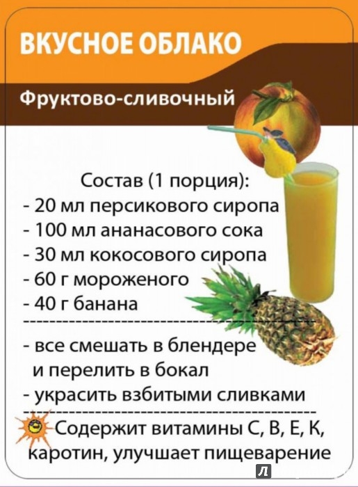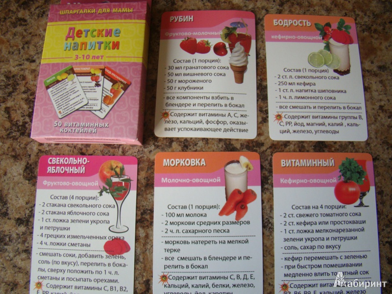 ОписаниеЧтобы не лишать организм ребенка веществ, необходимых ему для роста, Вы должны ежедневно снабжать его витаминами.Витаминные коктейли лучше всего подходят для этой цели.Кулинарные книги для детей и специальные сайты не всегда есть под рукой, да и пользоваться ими на кухне неудобно.Покупая "Детские напитки", Вы получаете 50 карточек, в которых:- короткие и понятные рецепты напитков для детей- фруктовые, молочные, медовые, кефирные, травные, сливочные, овощные и другие виды напитков- яркие стильные картинки.Карточками удобно пользоваться дома и брать с собой в магазин.Ребёнок наугад выбирает рецепт коктейля!Чтобы не лишать организм ребенка веществ, необходимых ему для роста, Вы должны ежедневно снабжать его витаминами.Витаминные коктейли лучше всего подходят для этой цели.Кулинарные книги для детей и специальные сайты не всегда есть под рукой, да и пользоваться ими на кухне неудобно.Покупая "Детские напитки", Вы получаете 50 карточек, в которых:- короткие и понятные рецепты напитков для детей- фруктовые, молочные, медовые, кефирные, травные, сливочные, овощные и другие виды напитков- яркие стильные картинки.Карточками удобно пользоваться дома и брать с собой в магазин.Ребёнок наугад выбирает рецепт коктейля!