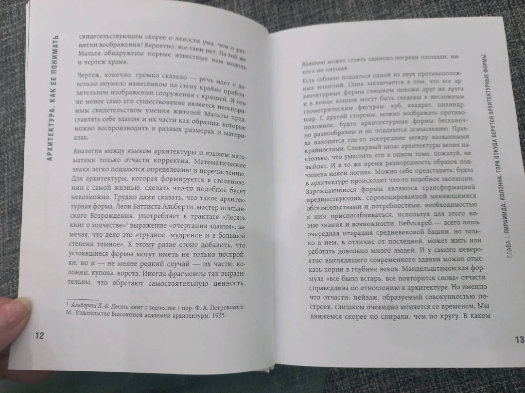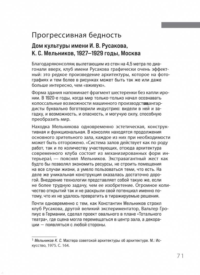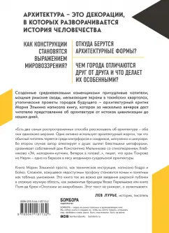 ОписаниеРимское градостроительство отличалось монументальностью и подарило миру всевозможные урбанистические блага, средневековые города складывались вокруг рынков, а открытие линейной перспективы в XVII и развитие транспорта в XIX столетиях полностью изменило облик городов. - Что мы понимаем под архитектурой, и насколько тесно она связана с цивилизацией? - Понимаем ли мы ее противоречивость, значение и устремления? - Чтобы испытать восторг при виде Руанского собора или колоннадой Бернини в Риме, не нужно быть профессиональным архитектором или искусствоведом. Однако архитектуре, которая формирует наше окружение, до сих пор уделяется мало внимания. В своей книге архитектурный критик Марии Элькина рассматривает эту область человеческой деятельности во всем ее великолепии и многоликости. Вы узнаете, как появлялись архитектурные формы и почему они приобретали тот или иной вид: будь то пышные входы в готические соборы, вечные колонны или необычная геометрия модернизма. Увидите, как мировоззрение отражается в архитектурных конструкциях, и попробуете разобраться в том, что делает здание произведением искусства. Новое издание выходит с обновленными автором текстами, а все примеры также проиллюстрированы графикой архитектора Сергея Чобана. Мария Элькина - архитектурный критик, лауреат премии среди самых известных людей Петербурга "ТОП-50". Окончила факультет теории и истории искусств Академии художеств в Санкт-Петербурге. Курирует выставки и пишет статьи об архитектуре и урбанизме в таких изданиях, как Republic, "Деловой Петербург", arch:speech, Strelka Magazine, Собака.ру. Сергей Чобан - архитектор, член Союза немецких архитекторов, Союза архитекторов России и Союза художников России, академик Московского отделения Международной академии архитектуры и почетный академик Российской академии художеств, обладатель архитектурных премий и участник различных архитектурных выставок.СвернутьРимское градостроительство отличалось монументальностью и подарило миру всевозможные урбанистические блага, средневековые города складывались вокруг рынков, а открытие линейной перспективы в XVII и развитие транспорта в XIX столетиях полностью изменило облик городов. - Что мы понимаем под архитектурой, и насколько тесно она связана с цивилизацией? - Понимаем ли мы ее противоречивость, значение и устремления? - Чтобы испытать восторг при виде Руанского собора или колоннадой Бернини в Риме, не нужно быть профессиональным архитектором или искусствоведом. Однако архитектуре, которая формирует наше окружение, до сих пор уделяется мало внимания. В своей книге архитектурный критик Марии Элькина рассматривает эту область человеческой деятельности во всем ее великолепии и многоликости. Вы узнаете, как появлялись архитектурные формы и почему они приобретали тот или иной вид: будь то пышные входы в готические соборы, вечные колонны или необычная геометрия модернизма. Увидите, как мировоззрение отражается в архитектурных конструкциях, и попробуете разобраться в том, что делает здание произведением искусства. Новое издание выходит с обновленными автором текстами, а все примеры также проиллюстрированы графикой архитектора Сергея Чобана. Мария Элькина - архитектурный критик, лауреат премии среди самых известных людей Петербурга "ТОП-50". Окончила факультет теор