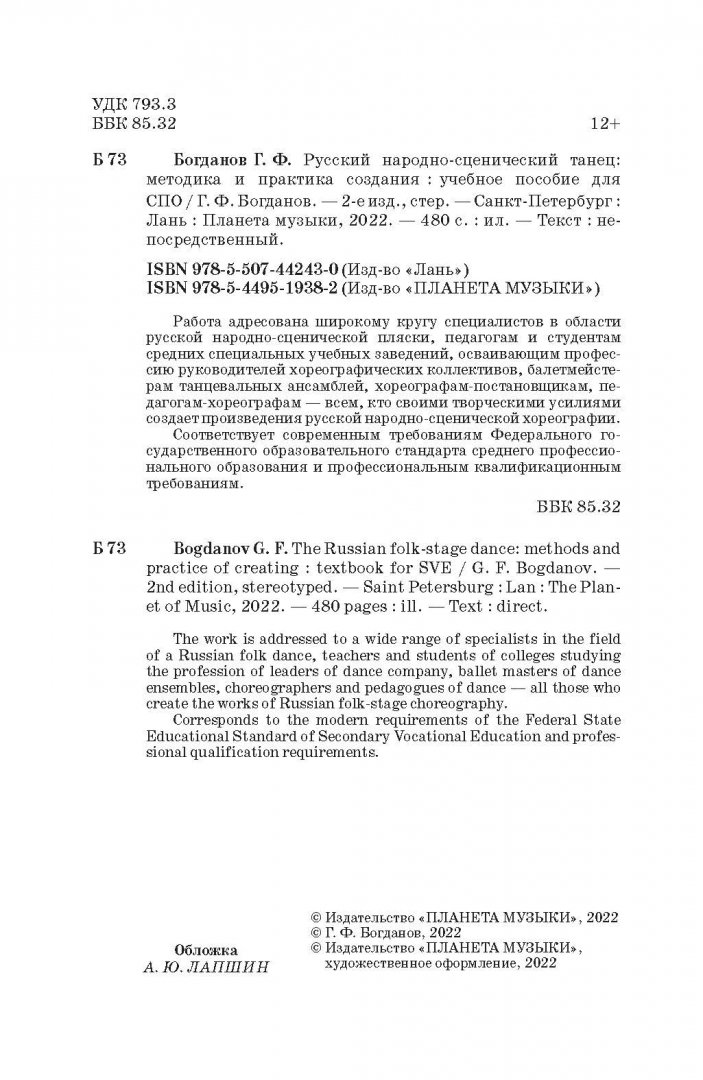 ОписаниеРабота адресована широкому кругу специалистов в области русской народно-сценической пляски, педагогам и студентам средних специальных учебных заведений, осваивающим профессию руководителей хореографических коллективов, балетмейстерам танцевальных ансамблей, хореографам-постановщикам, педагогам-хореографам - всем, кто своими творческими усилиями создает произведения русской народно-сценической хореографии.Соответствует современным требованиям Федерального государственного образовательного стандарта среднего профессионального образования и профессиональным квалификационным требованиям.2-е издание, стереотипное.Работа адресована широкому кругу специалистов в области русской народно-сценической пляски, педагогам и студентам средних специальных учебных заведений, осваивающим профессию руководителей хореографических коллективов, балетмейстерам танцевальных ансамблей, хореографам-постановщикам, педагогам-хореографам - всем, кто своими творческими усилиями создает произведения русской народно-сценической хореографии.Соответствует современным требованиям Федерального государственного образовательного стандарта среднего профессионального образования и профессиональным квалификационным требованиям.2-е издание, стереотипное.