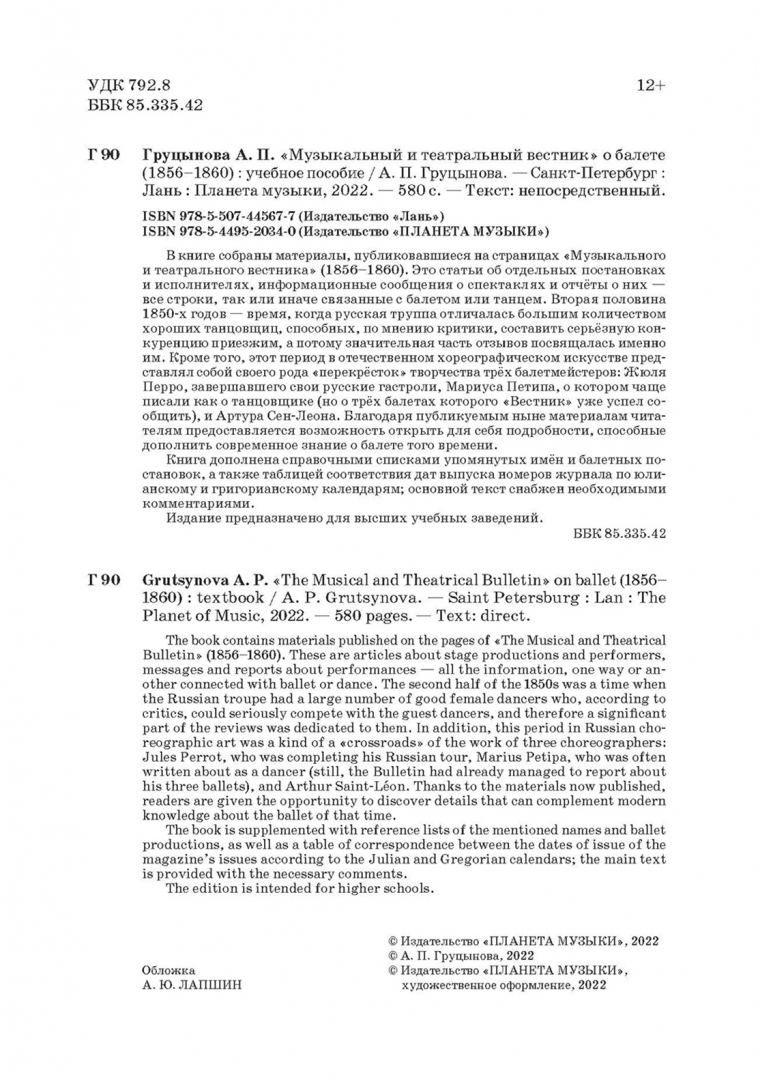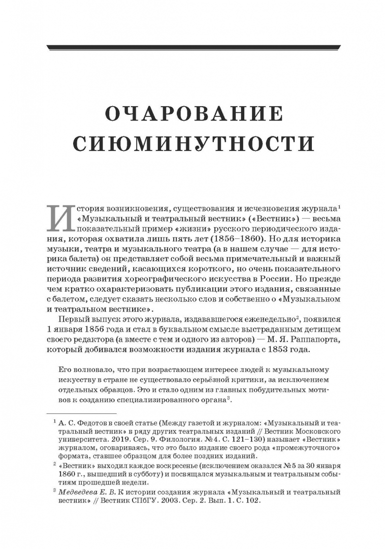 ОписаниеВ книге собраны материалы, публиковавшиеся на страницах «Музыкального и театрального вестника» (1856–1860). Это статьи об отдельных постановках и исполнителях, информационные сообщения о спектаклях и отчёты о них — все строки, так или иначе связанные с балетом или танцем. Вторая половина 1850-х годов — время, когда русская труппа отличалась большим количеством хороших танцовщиц, способных, по мнению критики, составить серьёзную конкуренцию приезжим, а потому значительная часть отзывов посвящалась именно им. Кроме того, этот период в отечественном хореографическом искусстве представлял собой своего рода «перекрёсток» творчества трёх балетмейстеров: Жюля Перро, завершавшего свои русские гастроли, Мариуса Петипа, о котором чаще писали как о танцовщике (но о трёх балетах которого «Вестник» уже успел сообщить), и Артура Сен-Леона. Благодаря публикуемым ныне материалам читателям предоставляется возможность открыть для себя подробности, способные дополнить современное знание о балете того времени.Книга дополнена справочными списками упомянутых имён и балетных постановок, а также таблицей соответствия дат выпуска номеров журнала по юлианскому и григорианскому календарю; основной текст снабжён необходимыми комментариями.Издание будет интересно теоретикам музыкального театра (балетоведам, театроведам, культурологам), его практикам (исполнителям, педагогам, балетмейстерам) и всем любителям балетного искусства.СвернутьВ книге собраны материалы, публиковавшиеся на страницах «Музыкального и театрального вестника» (1856–1860). Это статьи об отдельных постановках и исполнителях, информационные сообщения о спектаклях и отчёты о них — все строки, так или иначе связанные с балетом или танцем. Вторая половина 1850-х годов — время, когда русская труппа отличалась большим количеством хороших танцовщиц, способных, по мнению критики, составить серьёзную конкуренцию приезжим, а потому значительная часть отзывов посвящалась именно им. Кроме того, этот период в отечественном хореографическом искусстве представлял собой своего рода «перекрёсток» творчества трёх балетмейстеров: Жюля Перро, завершавшего свои русские гастроли, Мариуса Петипа, о котором чаще писали как о танцовщике (но о трёх балетах которого «Вестник» уже успел сообщить), и Артура Сен-Леона. Благодаря публикуемым ныне материалам читателям предоставляется возможность открыть для себя подробности, способные дополнить современное знание о балете того времени.Книга дополнена справочными списками упомянутых имён и балетных постановок, а также таблицей соответствия дат выпуска номеров журнала по юлианскому и григорианскому календарю; основной текст снабжён необходимыми комментариями.Издание будет интересно теоретикам музыкального театра (балетоведам, театроведам, культурологам), его практикам (исполнителям, педагогам, балетмейстерам) и всем любителям балетного искусства.СвернутьСвернуть