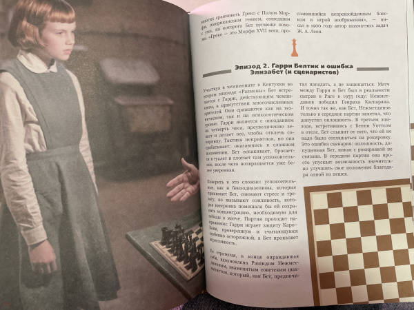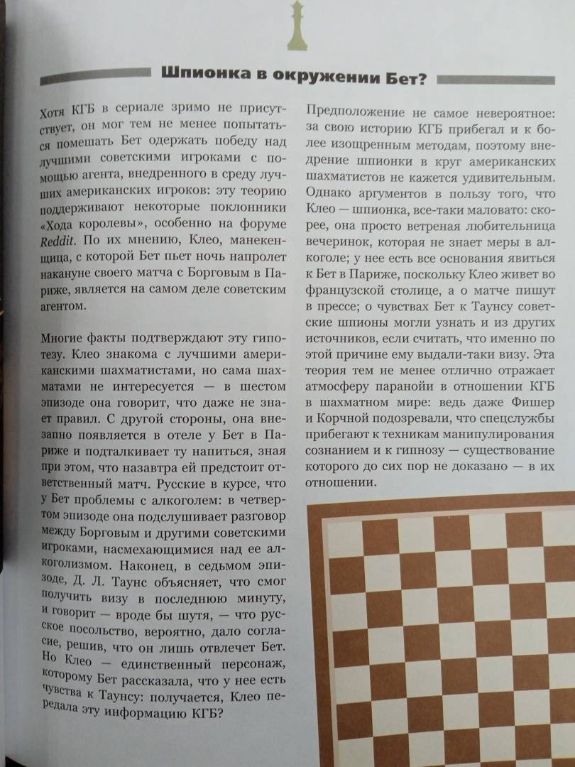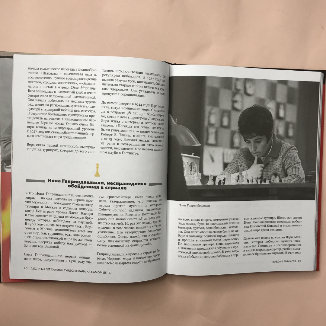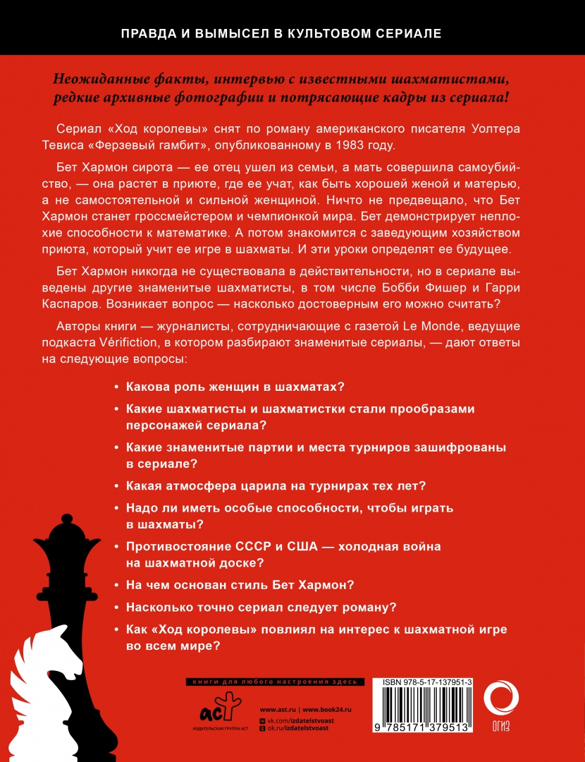 ОписаниеСериал "Ход королевы" снят по роману американского писателя Уолтера Тевиса "Ферзевый гамбит", опубликованному в 1983 году. Бет Хармон сирота - ее отец ушел из семьи, а мать совершила самоубийство, и она растет в приюте, где ее учат, как быть хорошей женой и матерью, а не самостоятельной и сильной женщиной. Ничто не предвещало, что Бет Хармон станет гроссмейстером и чемпионкой мира. Бет демонстрирует неплохие способности к математике. А потом знакомится с заведующим хозяйством приюта, который учит ее игре в шахматы. И эти уроки определят ее будущее.Бет Хармон никогда не существовала в действительности, но в сериале выведены другие знаменитые шахматисты, в том числе Бобби Фишер и Гарри Каспаров. Возникает вопрос - насколько достоверным его можно считать?Авторы книги - журналисты, сотрудничающие с газетой Le Monde, ведущие подкаста Verifiction, в котором разбирают знаменитые сериалы, - дают ответы на следующие вопросы:o Какова роль женщин в шахматах? o Какие шахматисты и шахматистки стали прообразами персонажей сериала?o Какие знаменитые партии и места турниров зашифрованы в сериале? o Какая атмосфера царила на турнирах тех лет?o Надо ли иметь особые способности, чтобы играть в шахматы?o Противостояние СССР и США - холодная война на шахматной доске?o На чем основан стиль Бет Хармон?o Насколько точно сериал следует роману?o Как "Ход королевы" повлиял на интерес к шахматной игре во всем мире?Правда и вымысел в культовом сериале Netflix. В книге вы найдете неожиданные факты, интервью с известными шахматистами, редкие архивные фотографии и потрясающие кадры из сериала.