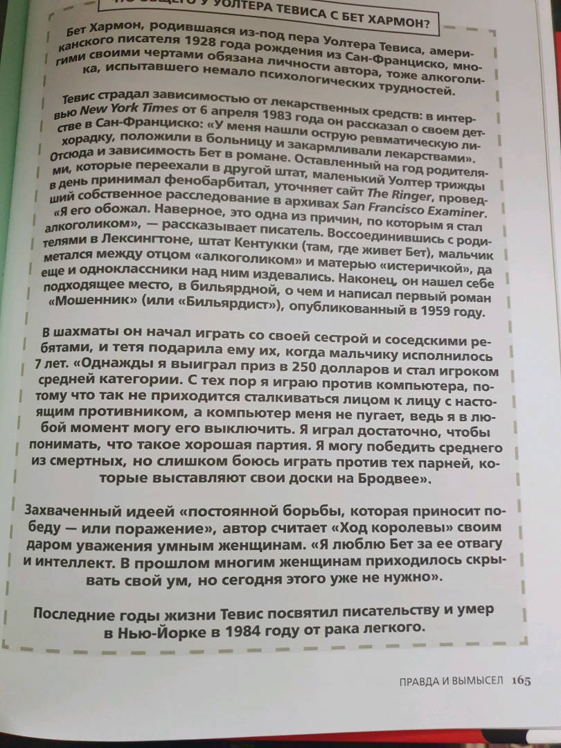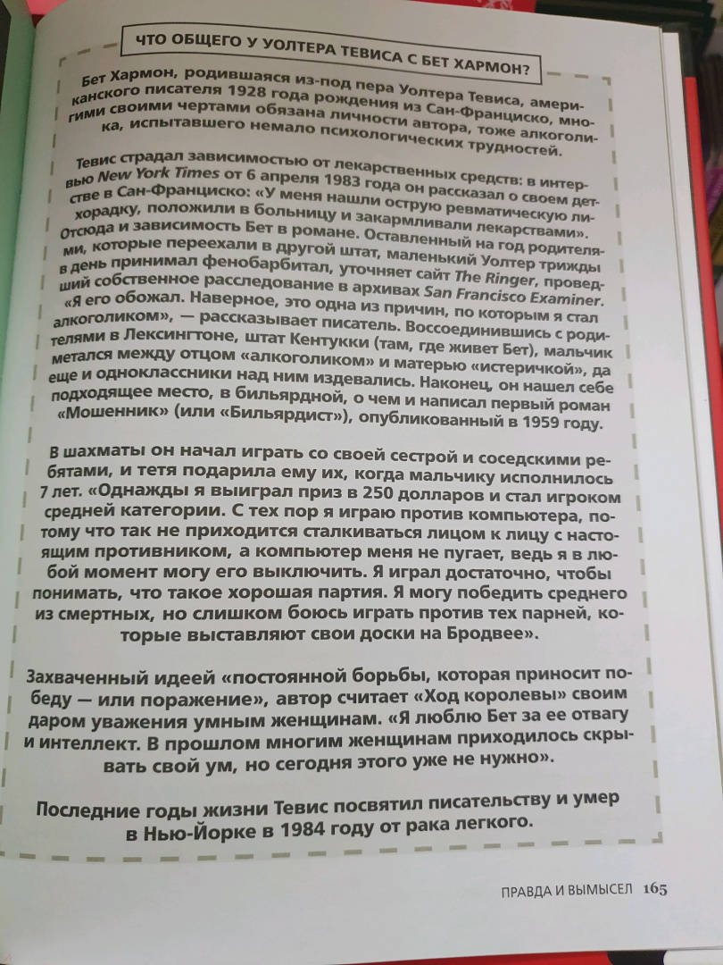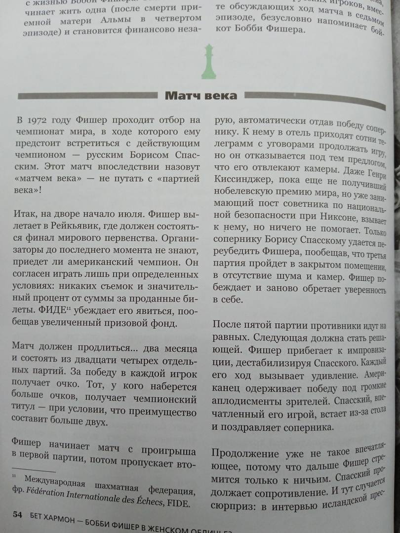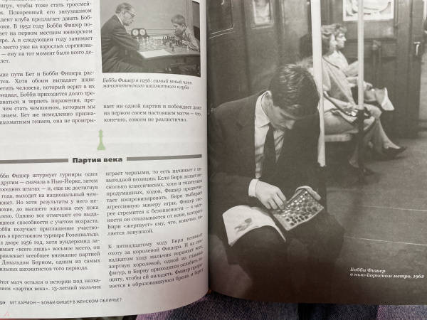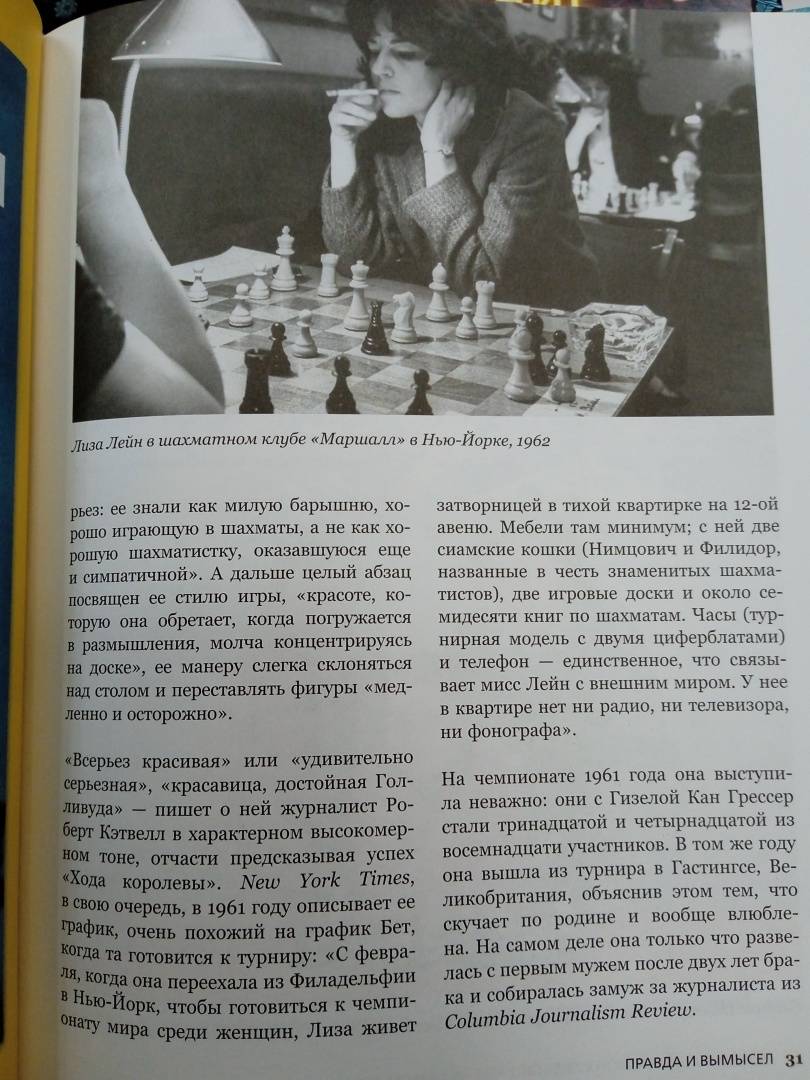 ОписаниеСериал "Ход королевы" снят по роману американского писателя Уолтера Тевиса "Ферзевый гамбит", опубликованному в 1983 году. Бет Хармон сирота - ее отец ушел из семьи, а мать совершила самоубийство, и она растет в приюте, где ее учат, как быть хорошей женой и матерью, а не самостоятельной и сильной женщиной. Ничто не предвещало, что Бет Хармон станет гроссмейстером и чемпионкой мира. Бет демонстрирует неплохие способности к математике. А потом знакомится с заведующим хозяйством приюта, который учит ее игре в шахматы. И эти уроки определят ее будущее.Бет Хармон никогда не существовала в действительности, но в сериале выведены другие знаменитые шахматисты, в том числе Бобби Фишер и Гарри Каспаров. Возникает вопрос - насколько достоверным его можно считать?Авторы книги - журналисты, сотрудничающие с газетой Le Monde, ведущие подкаста Verifiction, в котором разбирают знаменитые сериалы, - дают ответы на следующие вопросы:o Какова роль женщин в шахматах? o Какие шахматисты и шахматистки стали прообразами персонажей сериала?o Какие знаменитые партии и места турниров зашифрованы в сериале? o Какая атмосфера царила на турнирах тех лет?o Надо ли иметь особые способности, чтобы играть в шахматы?o Противостояние СССР и США - холодная война на шахматной доске?o На чем основан стиль Бет Хармон?o Насколько точно сериал следует роману?o Как "Ход королевы" повлиял на интерес к шахматной игре во всем мире?Правда и вымысел в культовом сериале Netflix. В книге вы найдете неожиданные факты, интервью с известными шахматистами, редкие архивные фотографии и потрясающие кадры из сериала.