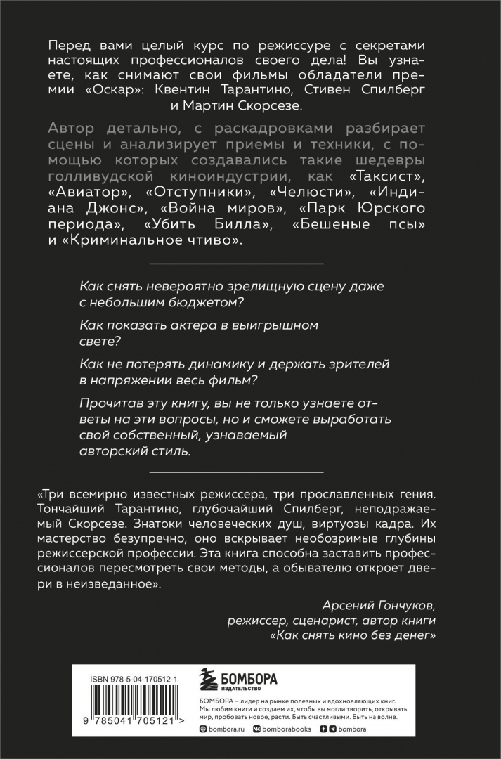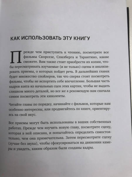 ОписаниеЭто не просто книга, это профессиональный курс по режиссуре, после которого вы сможете самостоятельно снять свой фильм! Визионеры, первооткрыватели и величайшие режиссеры в истории откроют вам свои секреты мастерства и детально разберут с вами некоторые свои кадры и сюжетные повороты. Автору удалось собрать в одной книге анализ приемов и техник режиссеров на основе кадров и сцен из их фильмов, благодаря чему у вас будет ощущение, что с вами говорит сам режиссер! Квентин Тарантино, режиссер фильмов «Бешеные псы», «Убить Билла», «Криминальное чтиво» и многих других, поделится секретами создания невероятных диалогов и глубоких конфликтов, а также покажет, как не потерять динамику по ходу действия фильма и держать зрителей в напряжении! Стивен Спилберг, подаривший нам «Челюсти», «Индиана Джонс», «Война миров» и трилогию «Парк Юрского периода» расскажет, как снимать фильмы, от которых у зрителей будет захватывать дух; насколько важна визуальная составляющая и как можно снять невероятно зрелищную сцену в условиях маленького бюджета. Мартин Скорсезе, снявший «Таксиста», «Отступников», «Авитора», уделит внимание работе с актерами и будет доказывать, что главный прием — уметь чувствовать кадр и сцену. И тогда само придет решение о том, с какого ракурса снимать, куда ставить камеру и как строить диалоги. Как использовать эту книгу: Прежде чем приступить к чтению, автор советует посмотреть все фильмы режиссеров (хоть и уверен в том, что вы, скорее всего, их видели). Вы можете читать по порядку или выбрать любимого режиссера и начать с него. Или вообще двигаться от фильма к фильму по своему желанию. Прежде чем начать новую главу, вы можете посмотреть сцену, о которой пойдет речь дальше, и попробовать самостоятельно разложить все на важные составляющие, а можете позволить автору объяснить вам, чем примечателен этот отрывок и с помощью каких средств режиссер сказал то, что хотел. А после прочтения вы можете попробовать использовать эти приемы в своих работах и посмотреть, что у вас получится!СвернутьЭто не просто книга, это профессиональный курс по режиссуре, после которого вы сможете самостоятельно снять свой фильм! Визионеры, первооткрыватели и величайшие режиссеры в истории откроют вам свои секреты мастерства и детально разберут с вами некоторые свои кадры и сюжетные повороты. Автору удалось собрать в одной книге анализ приемов и техник режиссеров на основе кадров и сцен из их фильмов, благодаря чему у вас будет ощущение, что с вами говорит сам режиссер! Квентин Тарантино, режиссер фильмов «Бешеные псы», «Убить Билла», «Криминальное чтиво» и многих других, поделится секретами создания невероятных диалогов и глубоких конфликтов, а также покажет, как не потерять динамику по ходу действия фильма и держать зрителей в напряжении! Стивен Спилберг, подаривший нам «Челюсти», «Индиана Джонс», «Война миров» и трилогию «Парк Юрского периода» расскажет, как снимать фильмы, от которых у зрителей будет захватывать дух; насколько важна визуальная составляющая и как можно снять невероятно зрелищную сцену в условиях маленького бюджета. Мартин Скорсезе, снявший «Таксиста», «Отступников», «Авитора», уделит внимание работе с актерами и будет доказывать, что главный прием — уметь чувствовать кадр и сцену. И тогда само придет решение о том, 